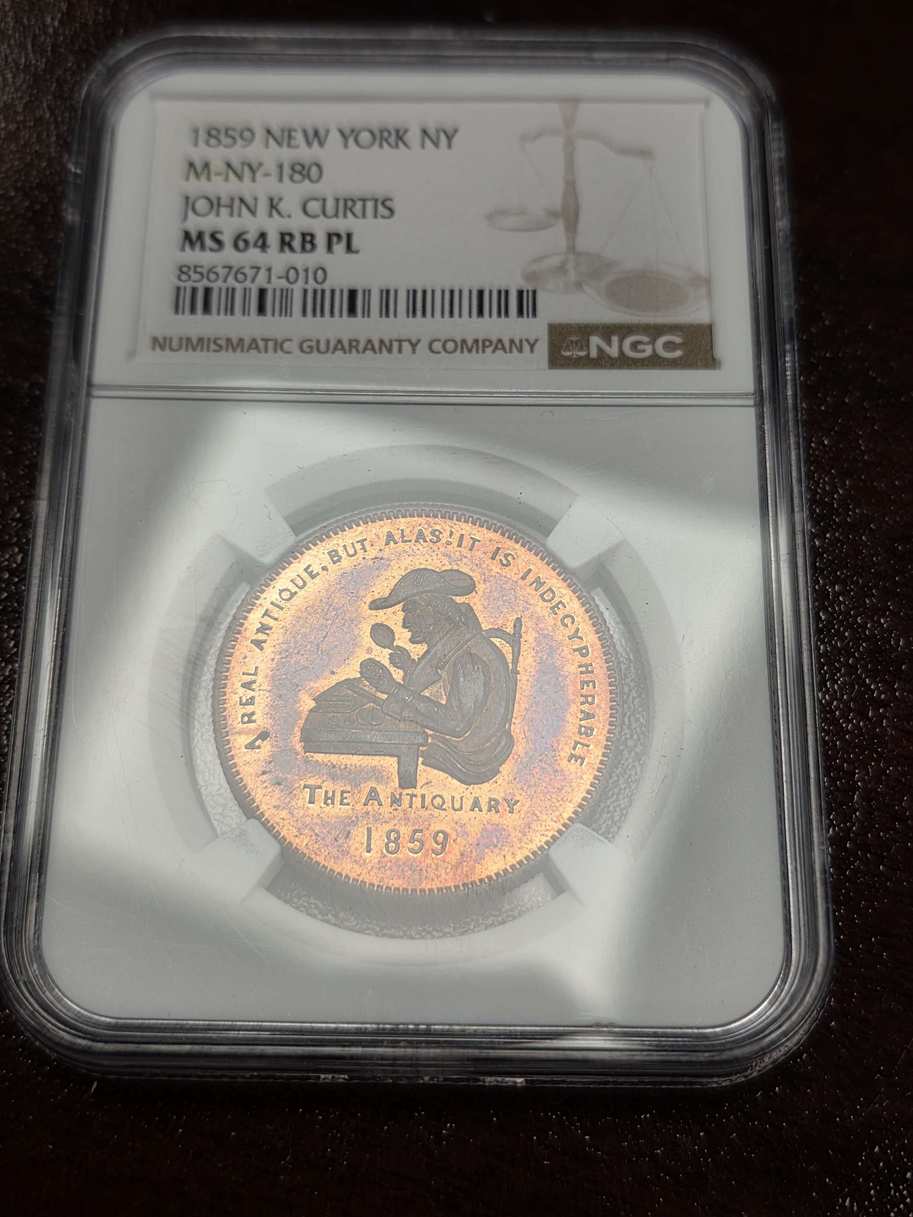 Re: FSH- 1859 "The Antiquary" John K. Curtis Merchant token by G.H. Lovett. NGC MS64RB PL REDUCED $600