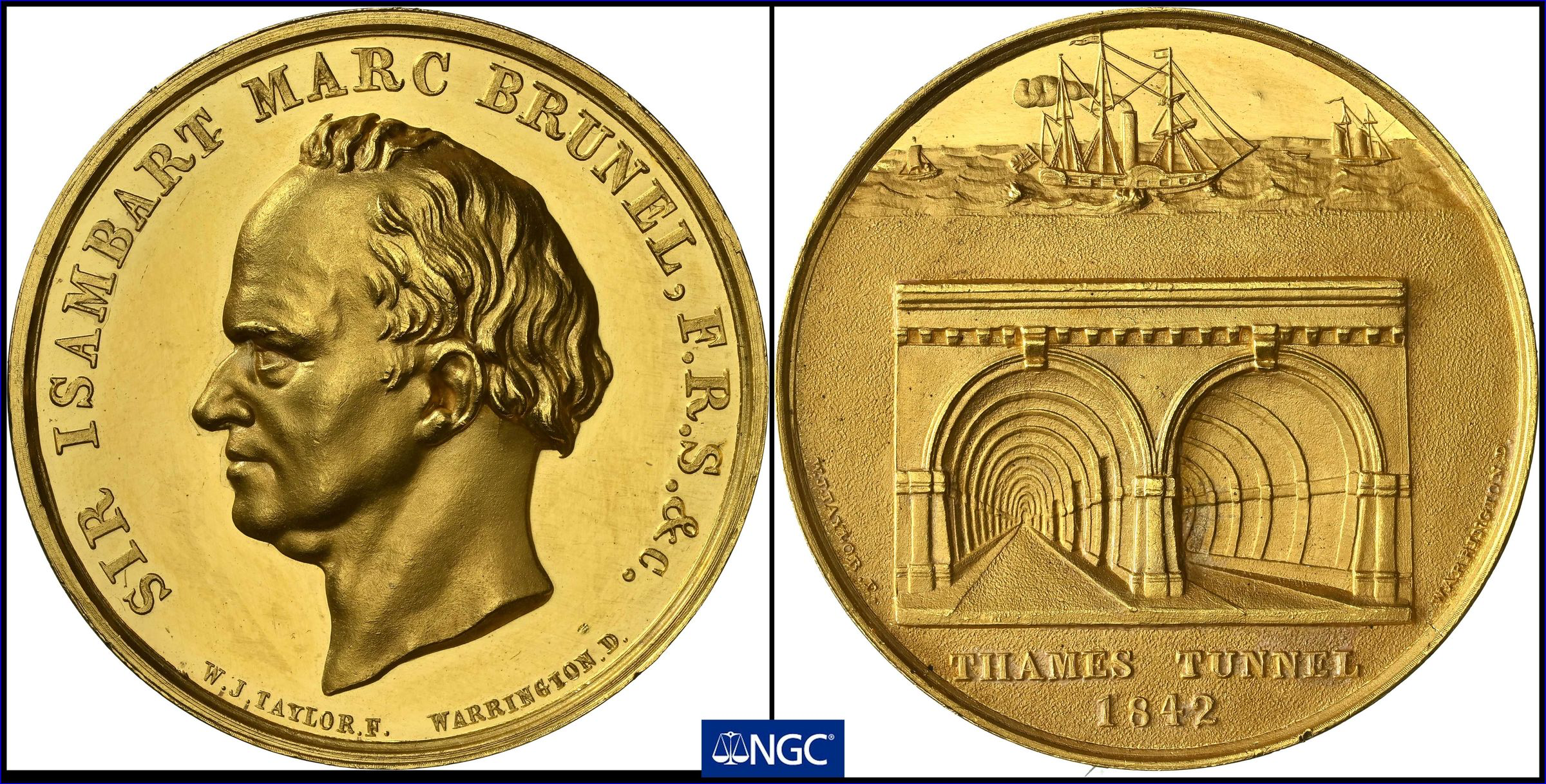 Engineering theme (first tunnel under a navigable river), big piece of gold (!), high grade, and excellent provenance (edge marked to the 4th Earl Spencer, who happens to be the great-great-grandfather of Princess Diana).