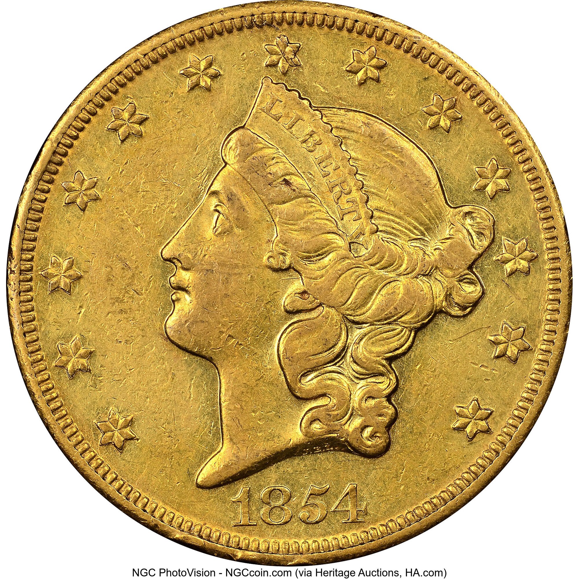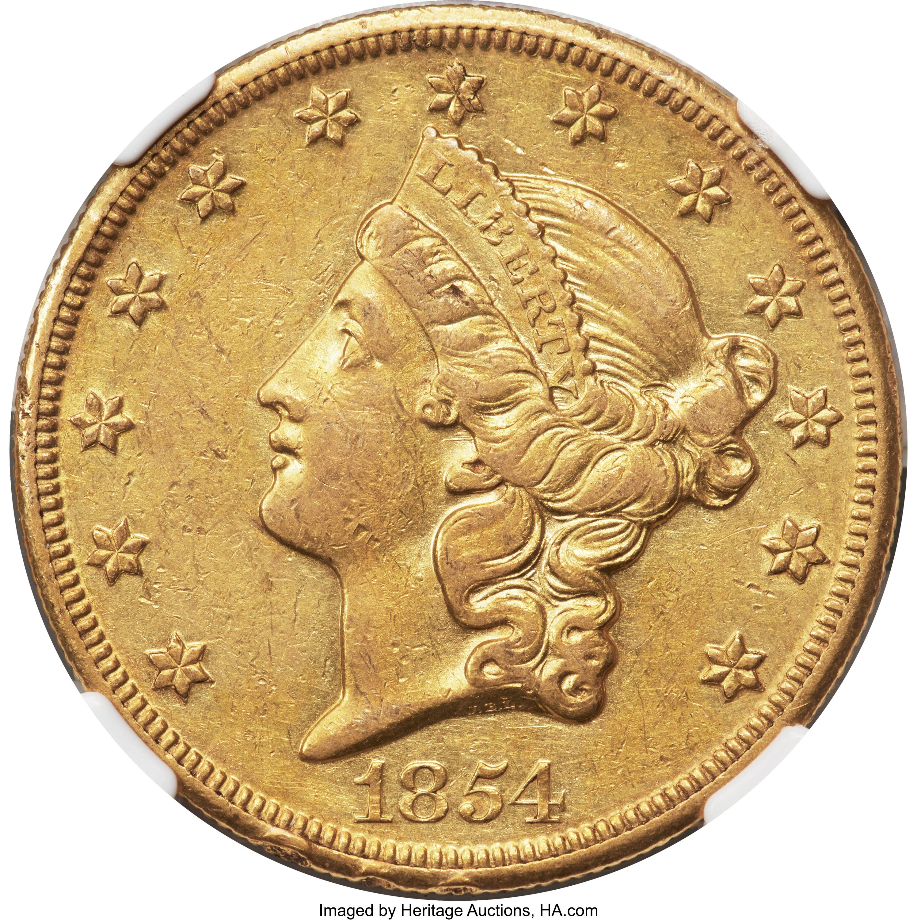 1854-O $20 AU55 NGC. Variety 1. The 1854-O Liberty double eagle claims a meager mintage of 3,250 pieces, the second-lowest production total of the series. The reason for the small mintage is easily explained by the opening of the San Francisco Mint in 1854, which drastically reduced the flow of gold deposits at the New Orleans facility. Before 1854, large amounts of gold dust and ore were deposited every year at the Southern mint, but the San Francisco facility was much more convenient to the great California gold fields, so deposits dwindled to a trickle once that location commenced coinage operations. As a result, the 1854-O is one of the rarest coins of any denomination ever struck at the New Orleans Mint.