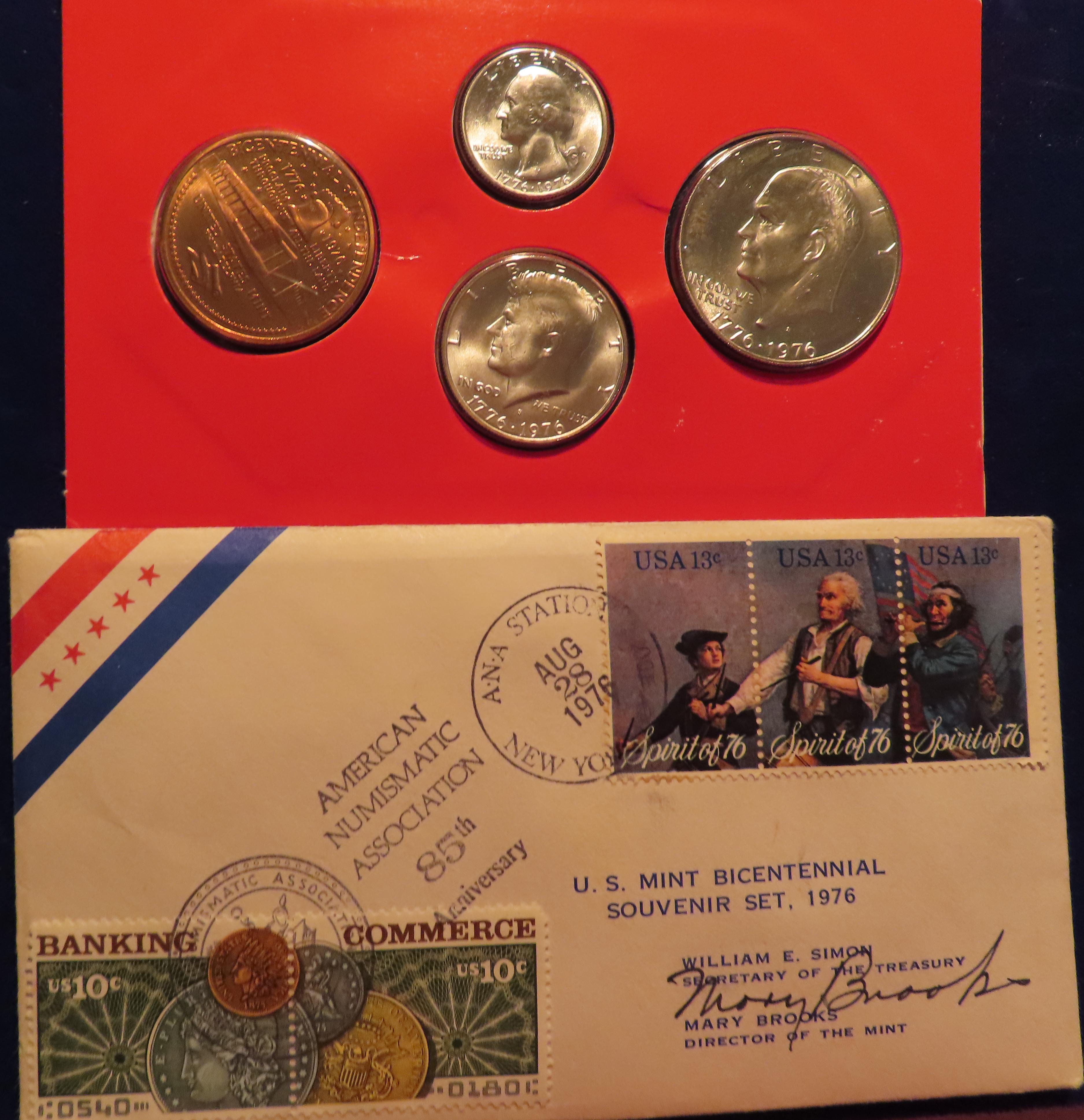 I purchaed this 1976-S three piece Uncirculated 40% silver clad Bicentennial set at the 1976 ANA Convention which was held in New York City. I was fortunate enough to have Mint Director, Mary Brooks, autograph the envelope for me.