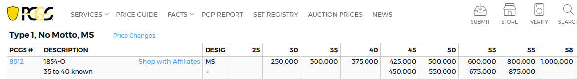 https://auctions.stacksbowers.com/lots/view/3-1B9CIZ/1854-o-liberty-head-double-eagle-winter-1-the-only-known-dies-ef-45-pcgs-cacI agree with you, but the PCGS price guide(grades 40 -58) are much too high then.
