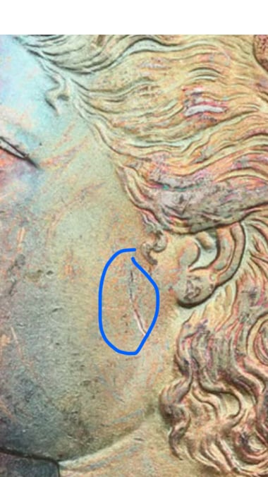 I would split the difference and call it a 65. There is a cheek hit that looks significant enough to prevent a 66 in my view.I don't think it's hit I think it's just breaks in the toning.