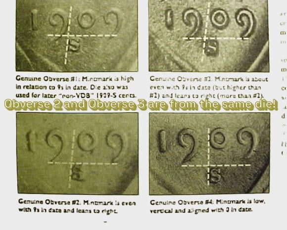I have more researching to do but preliminary findings re: 1909-S V.D.B. obverses reveals that the diagram I and others have been using with high confidence shows only 3 of the 4 obverses used to make 1909-S V.D.B. Lincoln cents. not all 4. Harsche saw 3 different 1909-S obverses for 1909-S V.D.B. and documented them correctly with pictures on page 13 in his 5th edition of "Detecting Altered Coins", ©1973. I'm seeing that the 4th obverse, as I suspected, is indeed quite scarce relative to the other 3. Harsche never saw the 4th obverse for 1909-S V.D.B. and that's why Harsche's publication doesn't show it.More later but I wanted to get this information out asap...