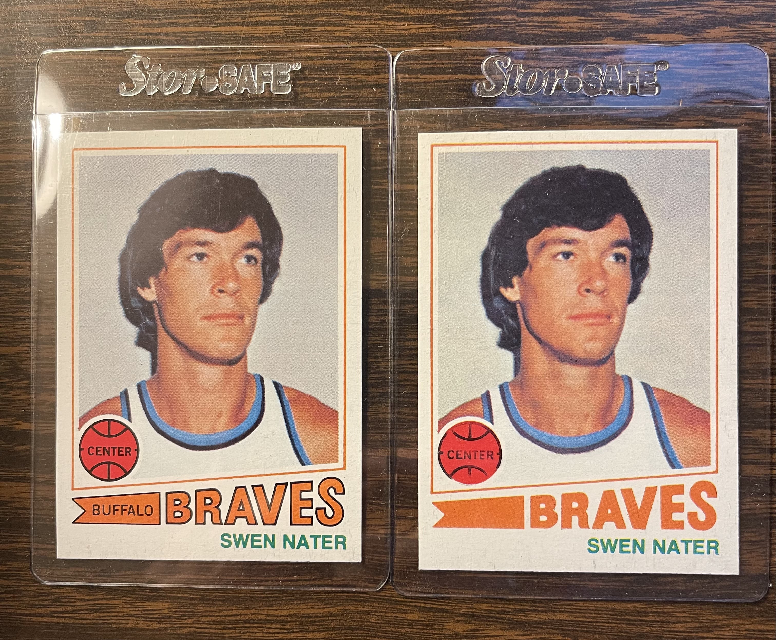 On the topic of missing ink and variations, I'm wondering if anyone has ever seen similar examples hatched from a box of 1977 Topps Basketball. I pulled the example on the right many years ago and stored it with some others from the same box which have missing ink, but this one stands out. Black ink totally gone from the banner and team name.