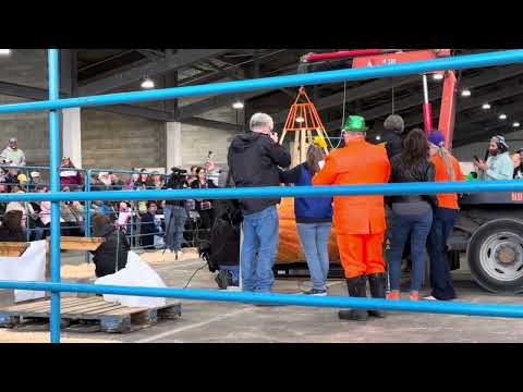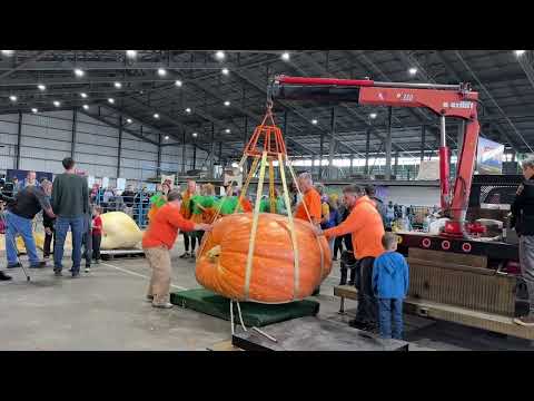 Watch below as Winner Grower Dale Marshall makes final adjustments by attaching ropes and then his 2024 Record winning Giant Pumpkin is hoisted by a crane from the official scale at the Alaska State Fair and onto a wheeled platform.