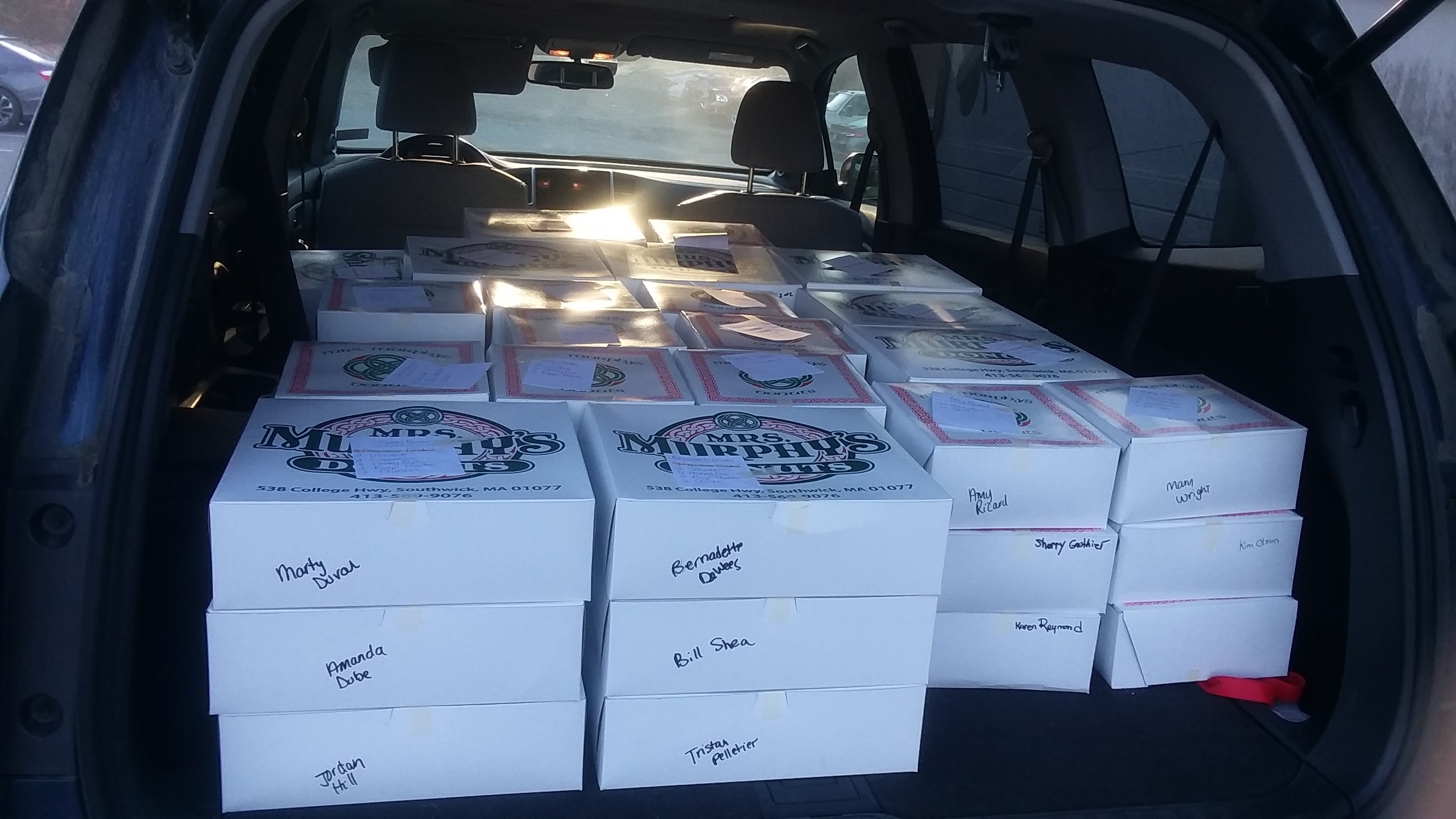November 2019, Mrs Murphy's donuts southwick, ma. 60 dozen donuts (yummmmm) on it way to a school function. Life is awesome 👌