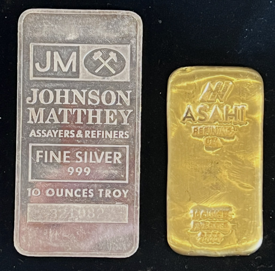 Interesting density comparison of pure silver to pure gold. Both bars 10 Troy ounces and the gold one not as thick as the silver one.