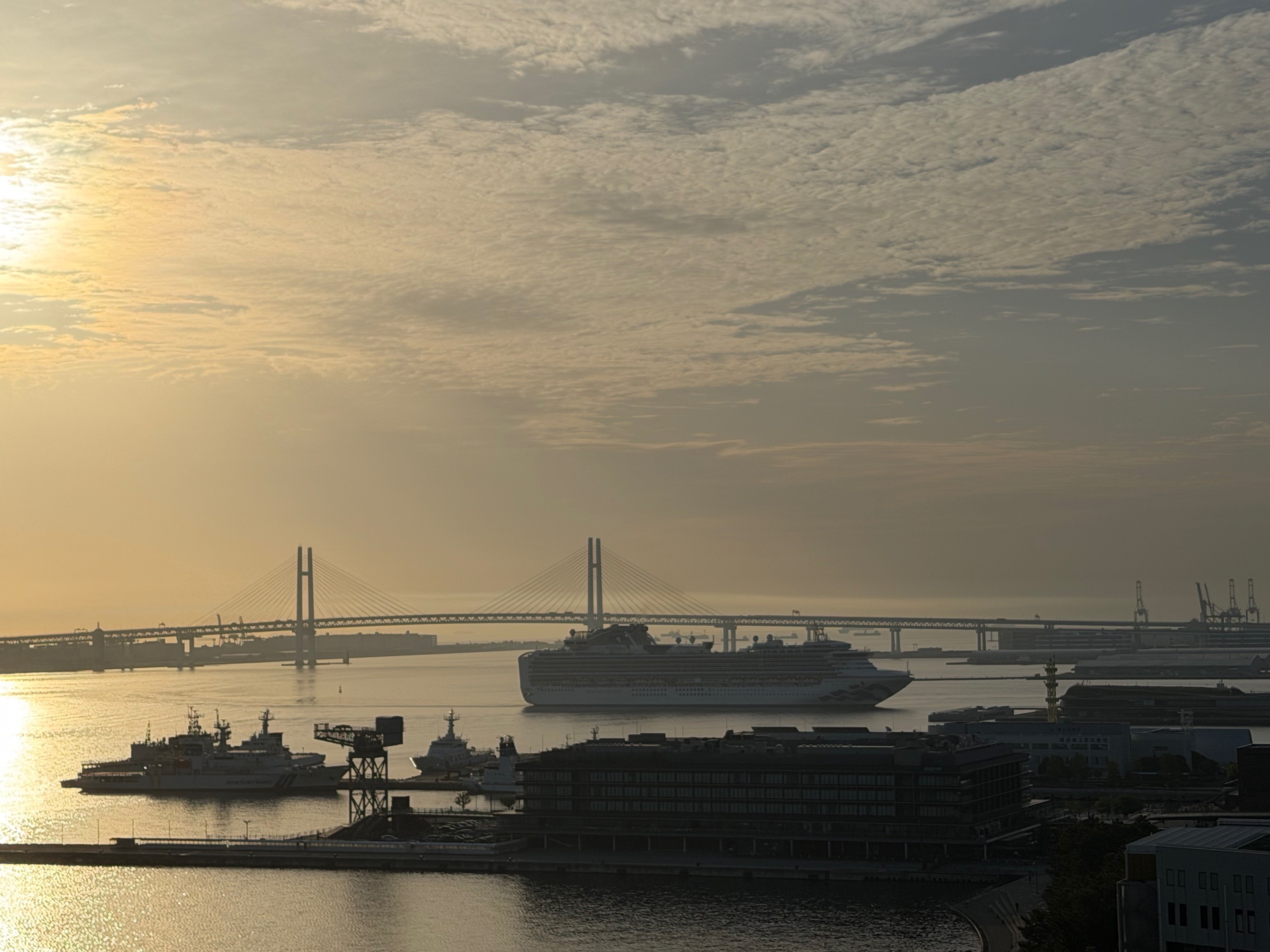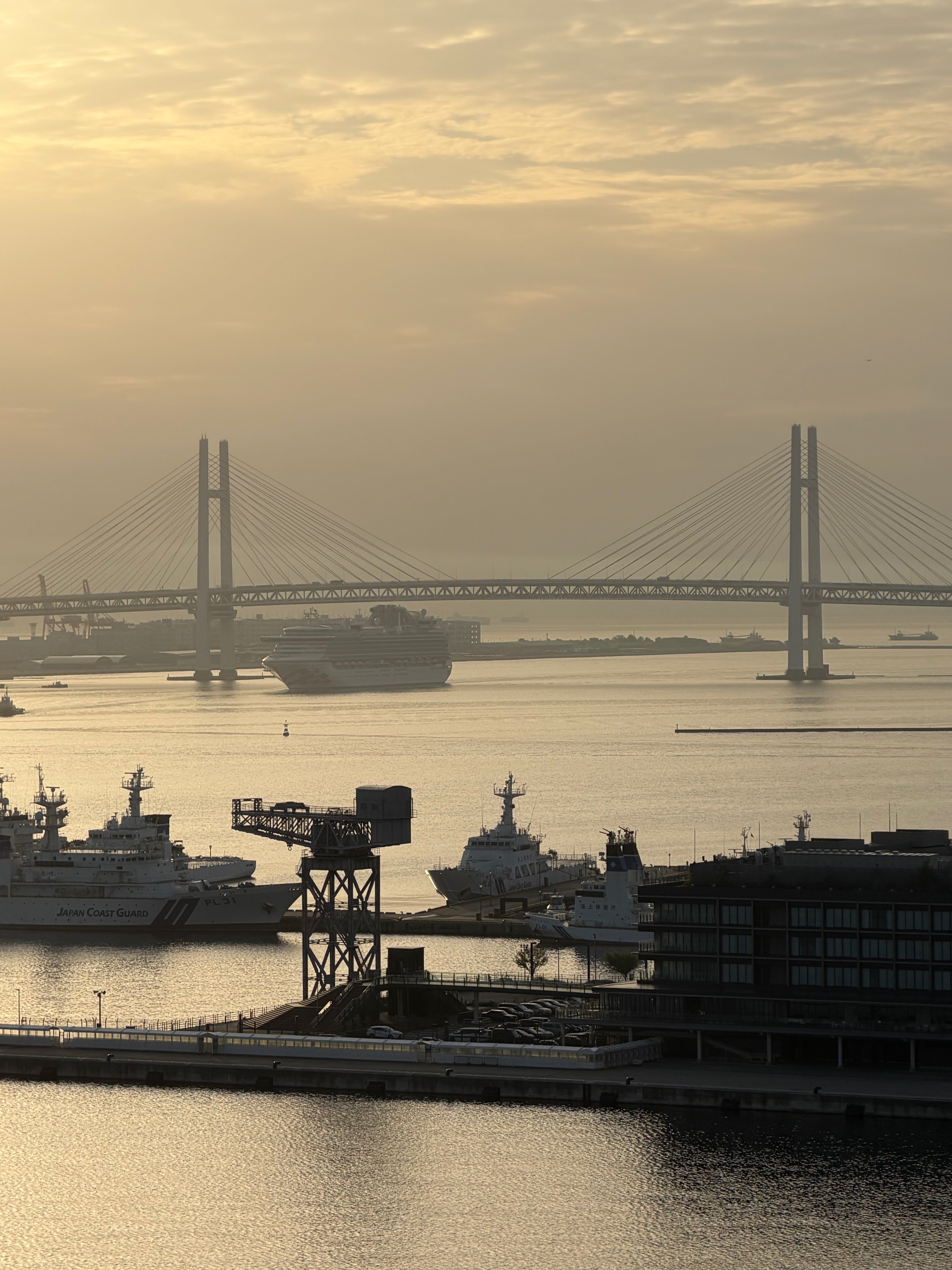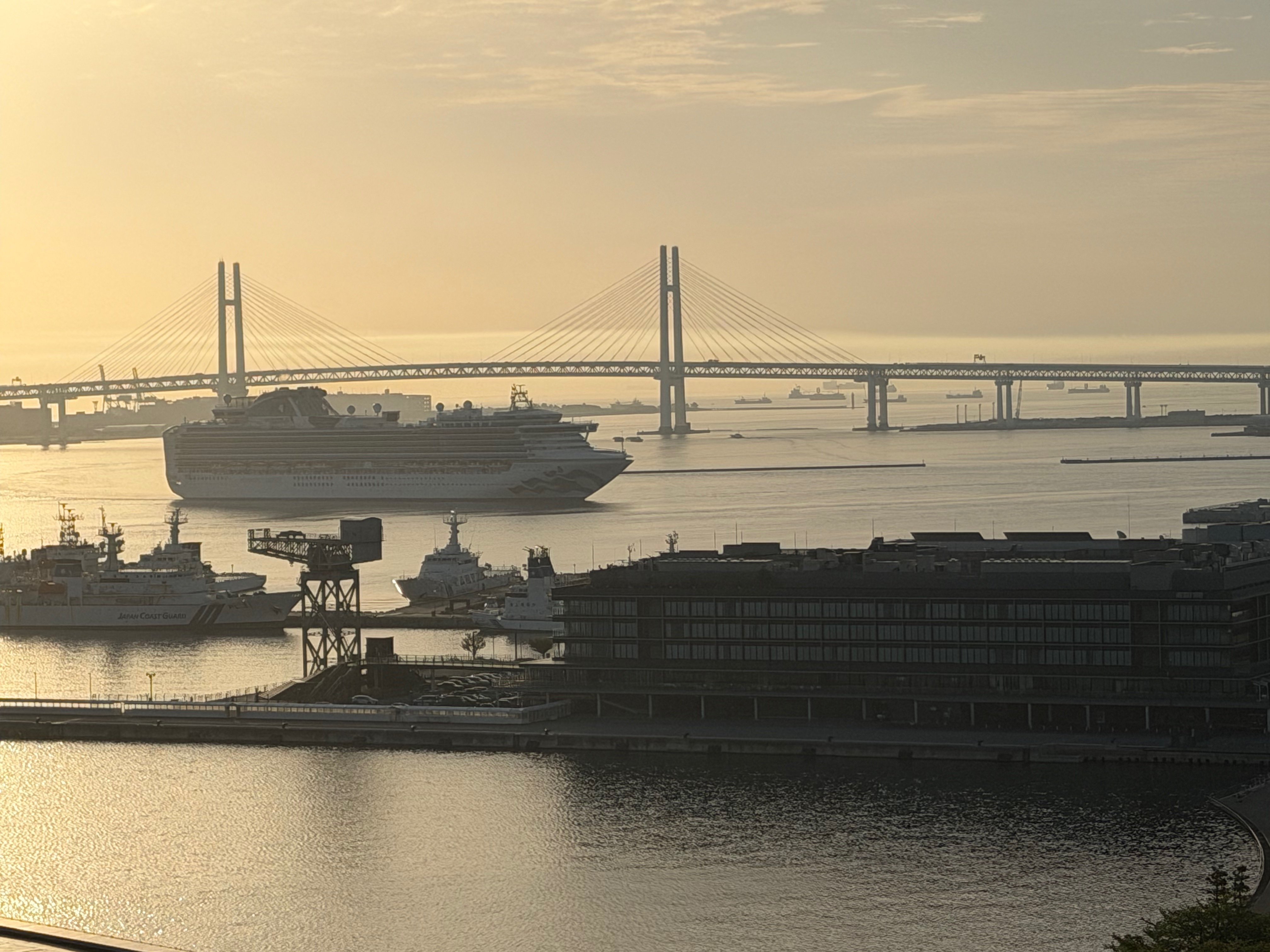 The video also includes panoramic views of the ship-occupied harbor and distant Yokohama Bay Bridge,