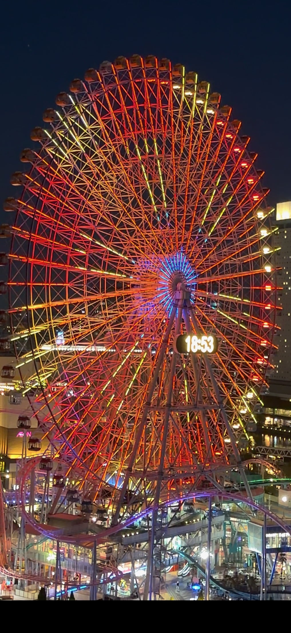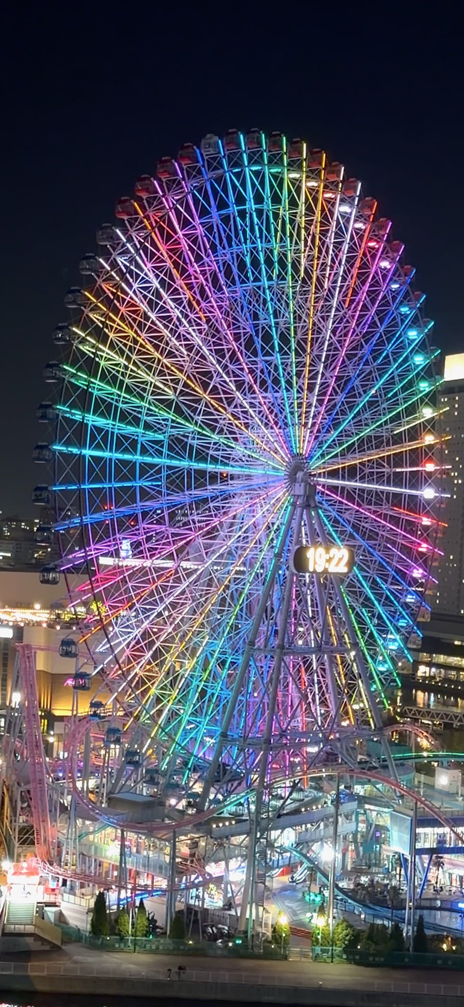 Yokohama Japan’s Giant Ferris Wheel was once the largest in the world after having been built for a special exhibition. It has been preserved by anchoring one of the smallest Theme Parks in the world, Yokohama's "Cosmo World." It remains the largest ferris wheel in the world with a clock.