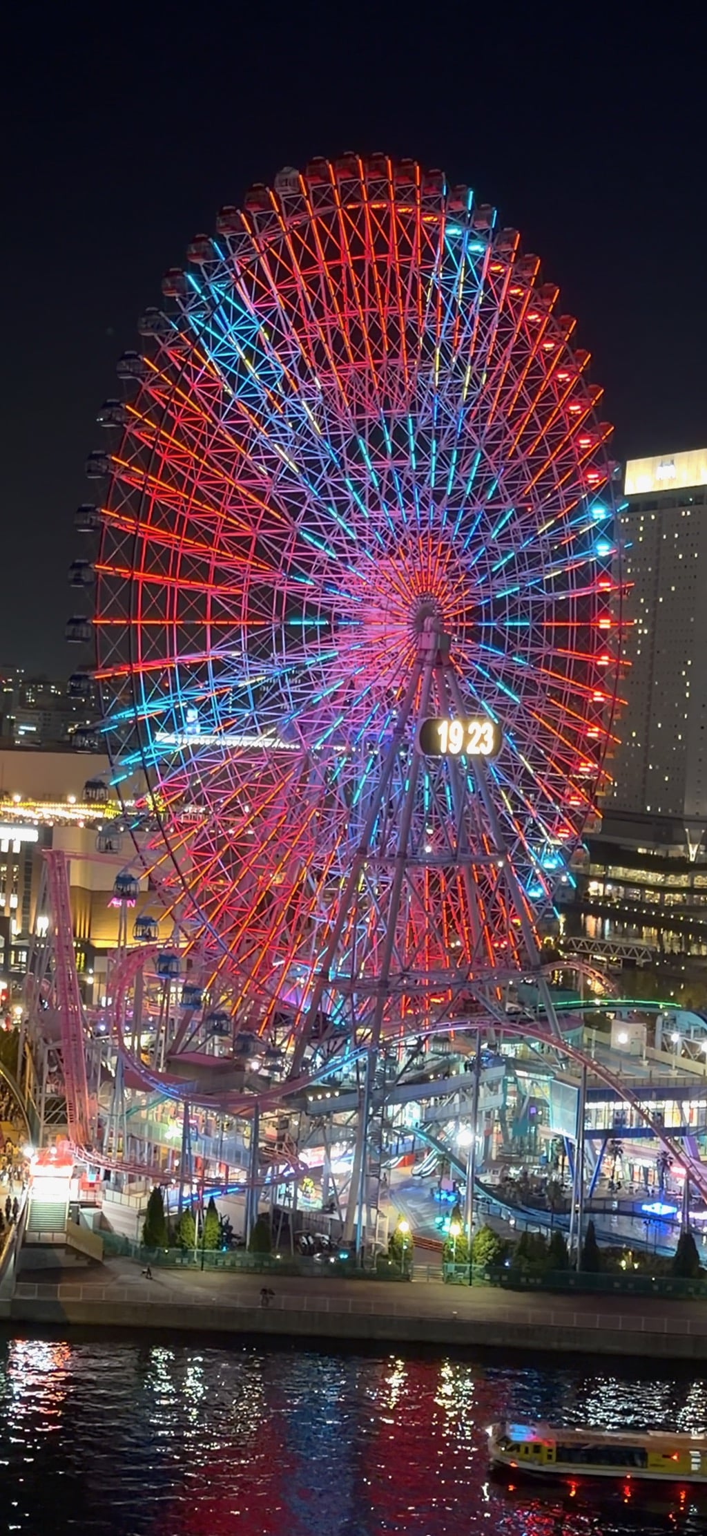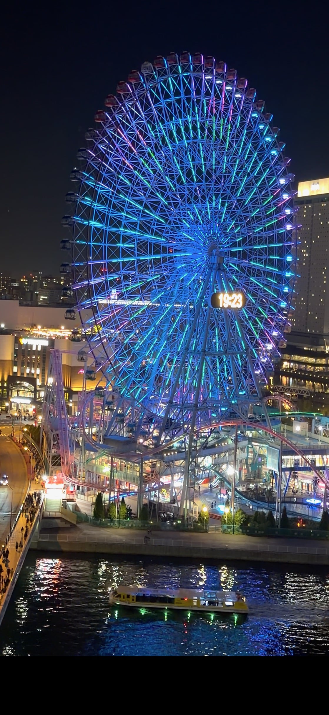 TONIGHT'S "FREE FALLIN" FERRIS WHEEL AS TOM PETTY' SINGS "FREE FALLIN' AND A NIGHT-LIT BOAT GLIDES BY ON THE REFLECTING WATERS OF YOKOHAMA'S OOKA RIVER