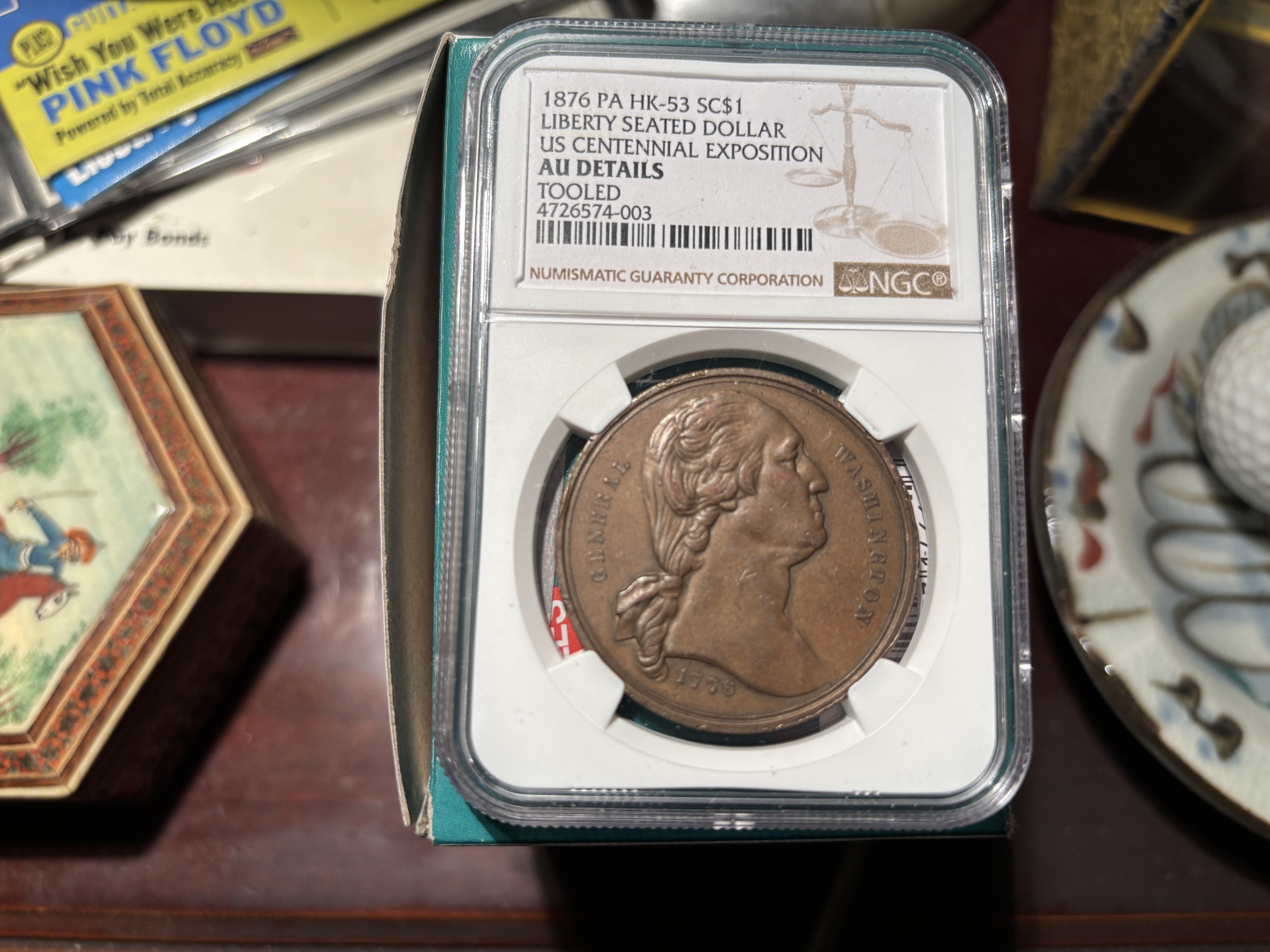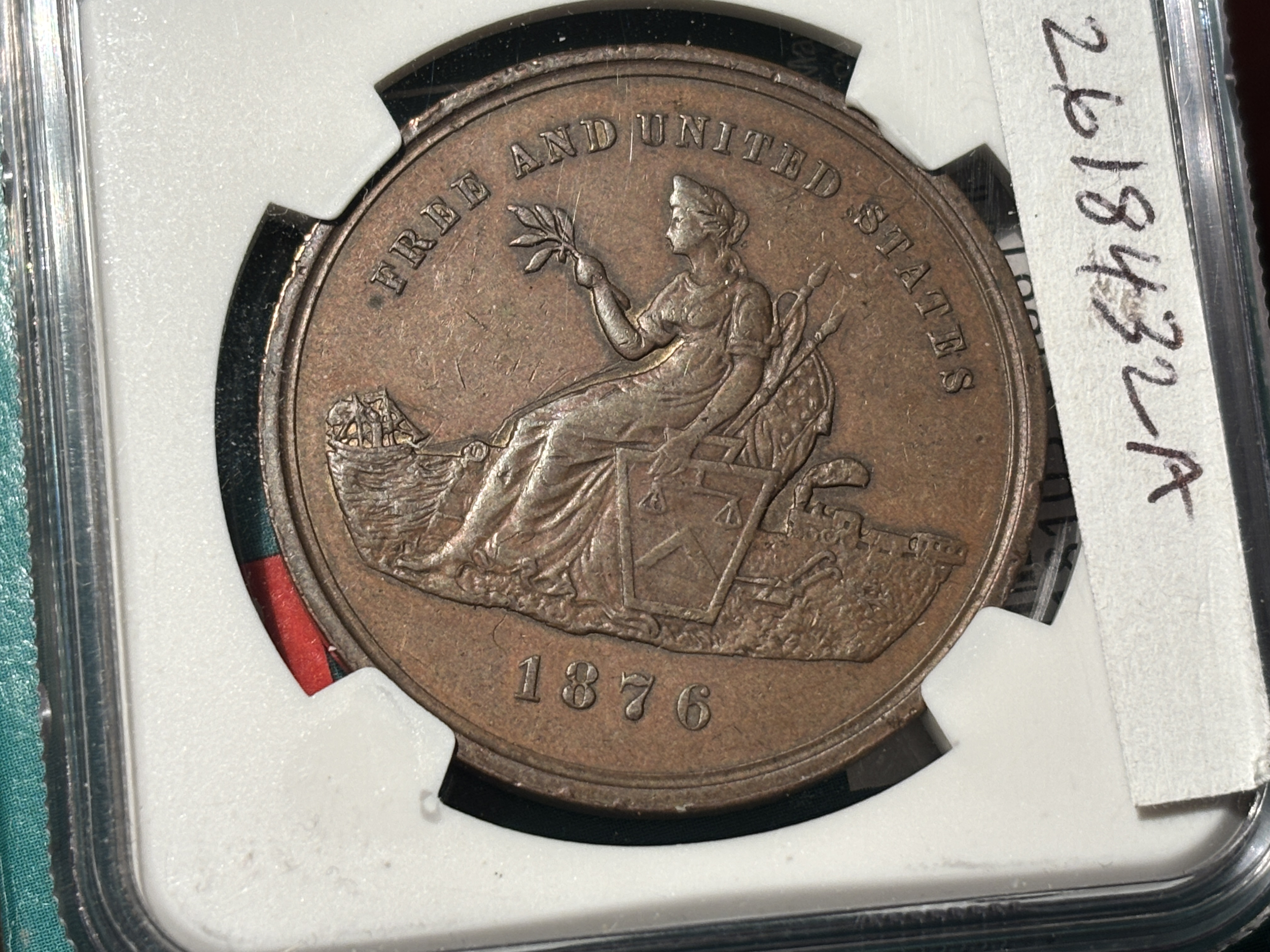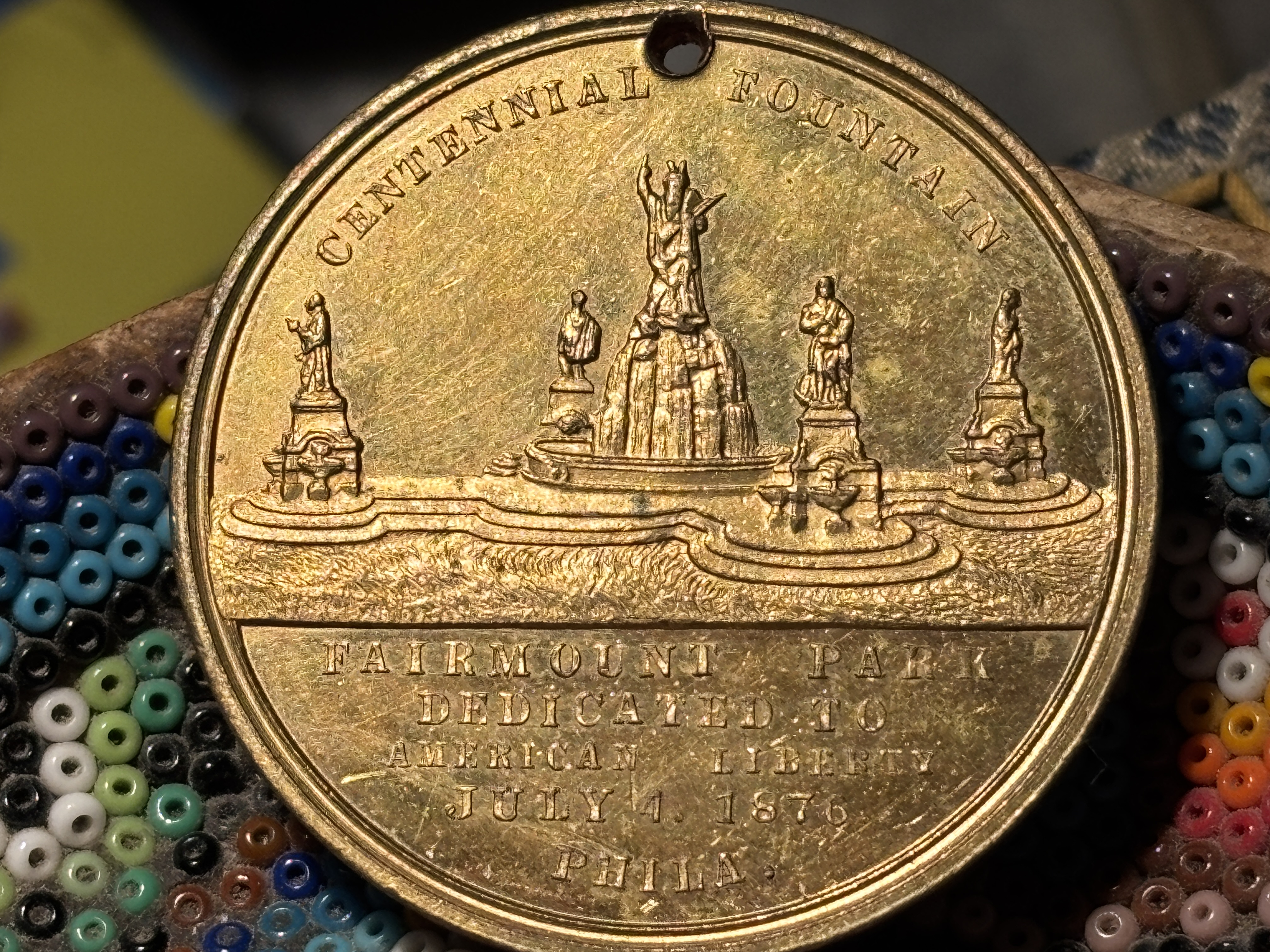 Here's a 13mm 1876 medalette posted by @NumisOxide. I don't think it's a Soley piece but good to keep track of here. These have been reported in gilt, brass, and copper. They come with a location for a hole, but not all specimens are holed. Benjamin Fauver had an unholed, brass specimen.