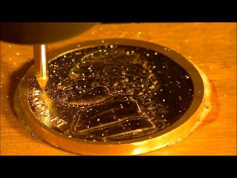 This one uses a CNC mill to make a "coin" from a blank - you could easily make it correctly sized with whatever design you want and also machine the reeded edge: