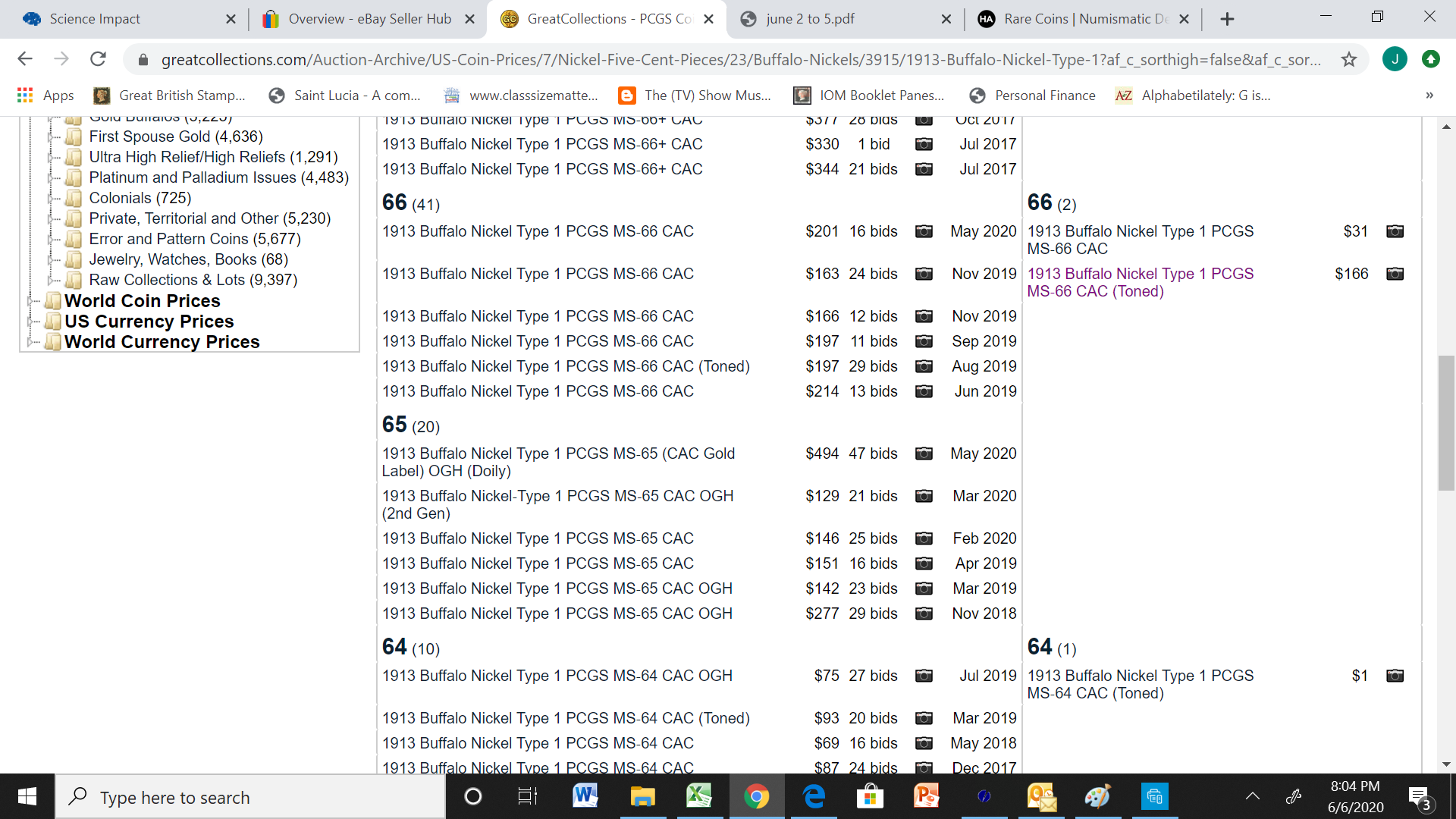 For the record, here are the recent sales (PCGS, CAC only) for 1913 Type 1 Buffalo Nickels on GC. Prices include Buyer's Premium.