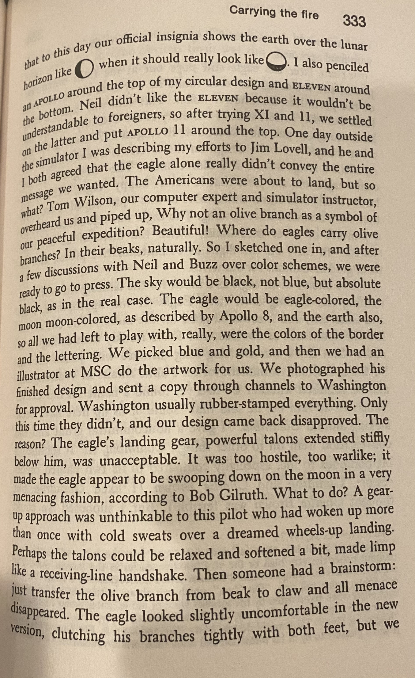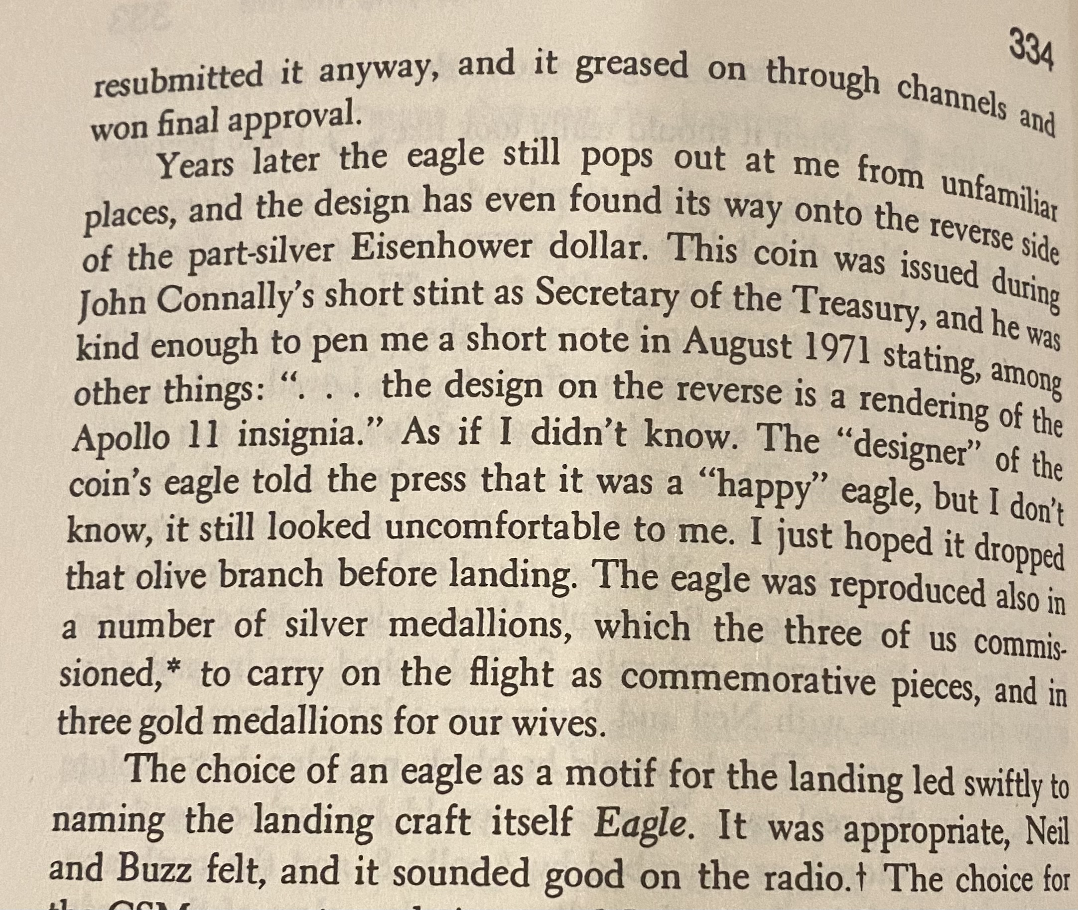 Anyway, I was reading on Saturday afternoon and came across a few pages on how the Apollo 11 patch was designed... by Collins himself. This design, of course, went on to become the Eisenhower dollar reverse. I've know for years that the two designs were tied to each other, but I never knew the history of the design itself, nor that it was sketched by an astronaut. I'm not sure how novel a discovery this is, but it was something I never knew and found interesting. I thought it would be of interest here, as well.
