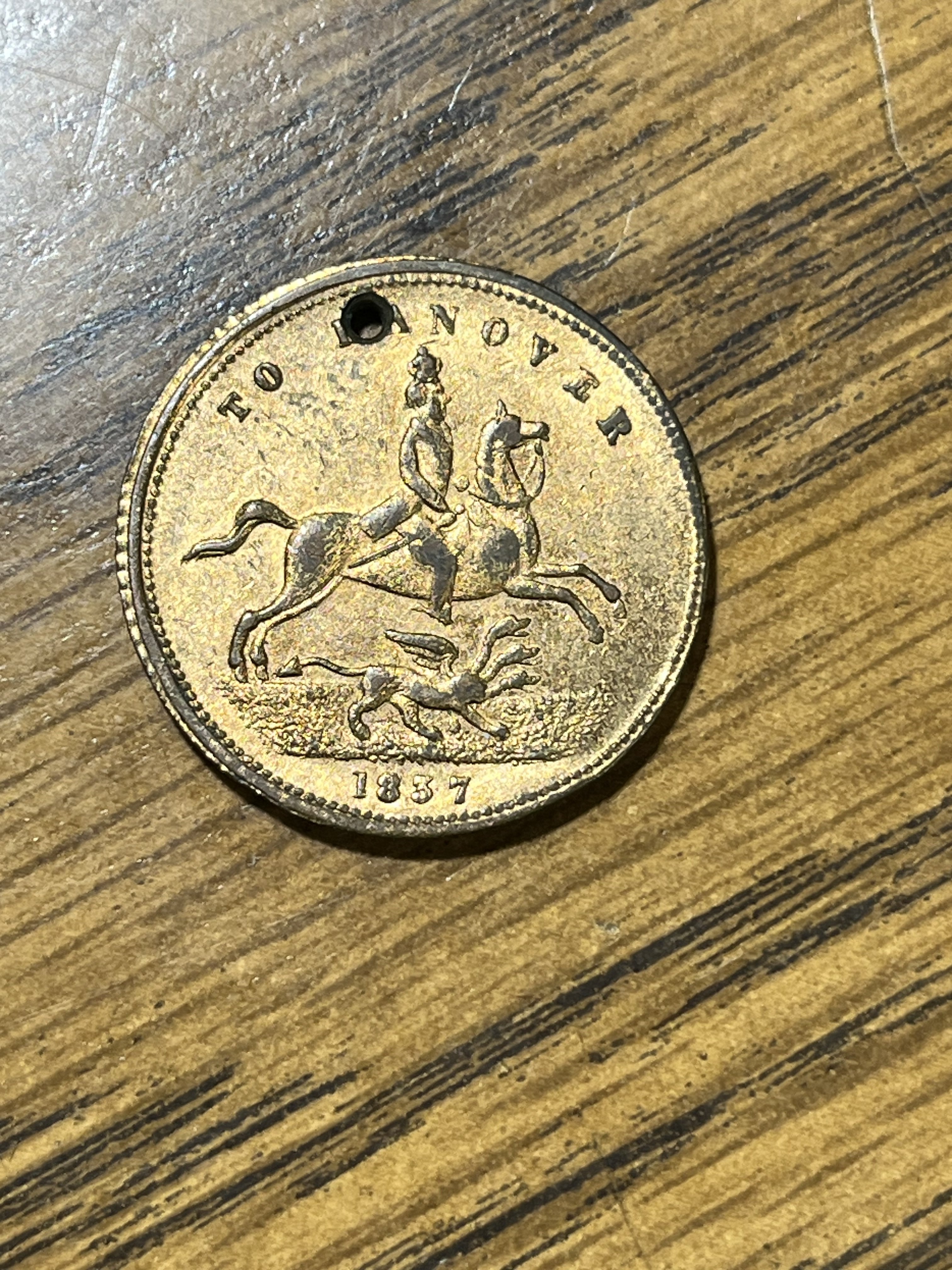As the article notes, the token contains a political message. Ever since George I, the kIngs of England had been German prices too. But Queen Victoria was disallowed from inheriting the throne of Hanover, due to the strict male-only primogeniture laws of that country; the throne passed tot he Queen's cousin, the arch-conservative Duke of Cumberland, a generally unpopular fellow whom the British public were mostly thankful to be rid of. Duke Ernest became King Ernst Augustus I of Hanover.
