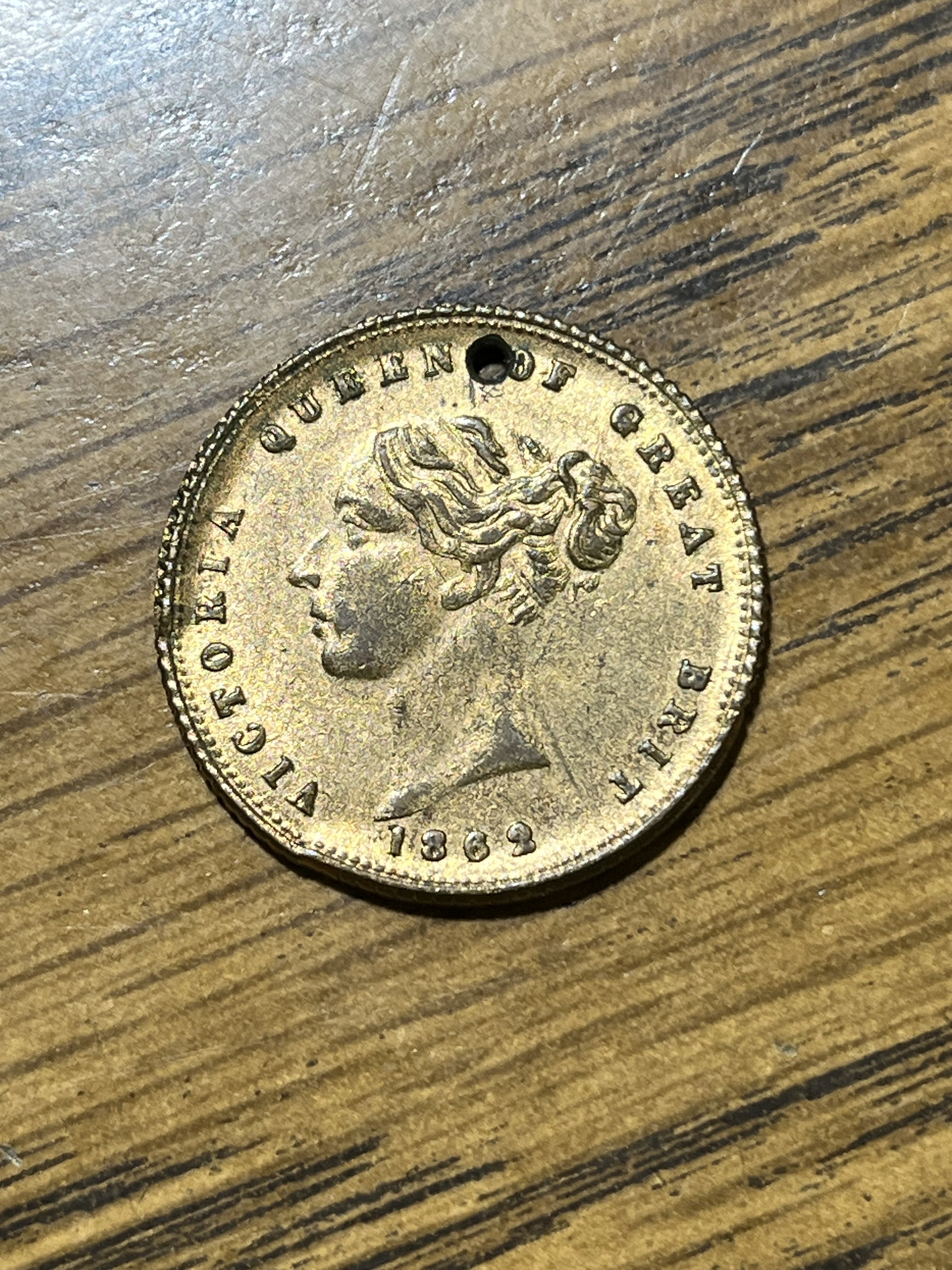 These pieces were mass-produced and there were many different varieties, and bear many dates both fictitious and authentic. Early pieces may have been sold as souvenirs to the poor, as the article notes, but most (especially the later versions such as this one) were sold in bulk packets for use as gambling tokens, as they almost-but-not-quite looked like gold sovereigns.