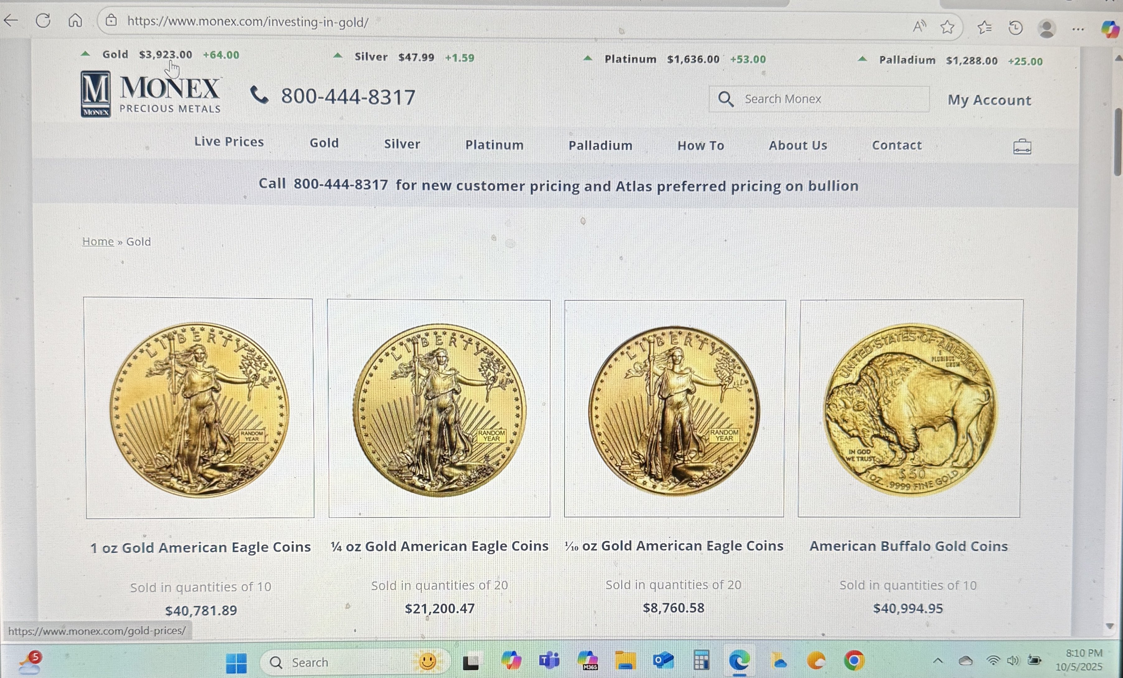 I need a day of 4,300 gold to move two 1/4 oz $5 baseball / gloves, proof & unc, to about pay for the Gold 1/2 oz SAQ delivered for 2,195. Was needing to move 3 of them when I added the 2025W 24k SAQ. I liked the idea of curved strike $5 coins so I ordered up a few from the Mint. I recall they were $420 a pop for the proofs ?