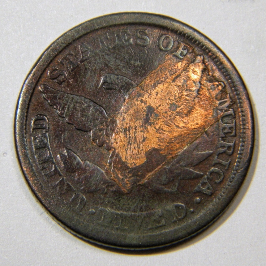 I picked this up a couple of years ago on eBay. I initially thought it to be a contemporary counterfeit, but of the details you can see, it isn't very crude. In fact it is actually pretty spot on to be the large date variety. The edge is even reeded like a typical half eagle. I don't think it is a token, but it does look like it was stuck to something at some point. I posted this on another forum before making the switch here, and they weren't much help. Weight is 4.7 grams. All the other size parameters are the same as a normal half eagle of this date. Opinions obviously welcome.