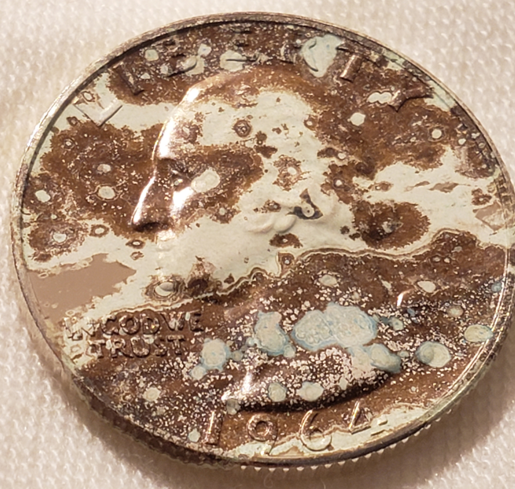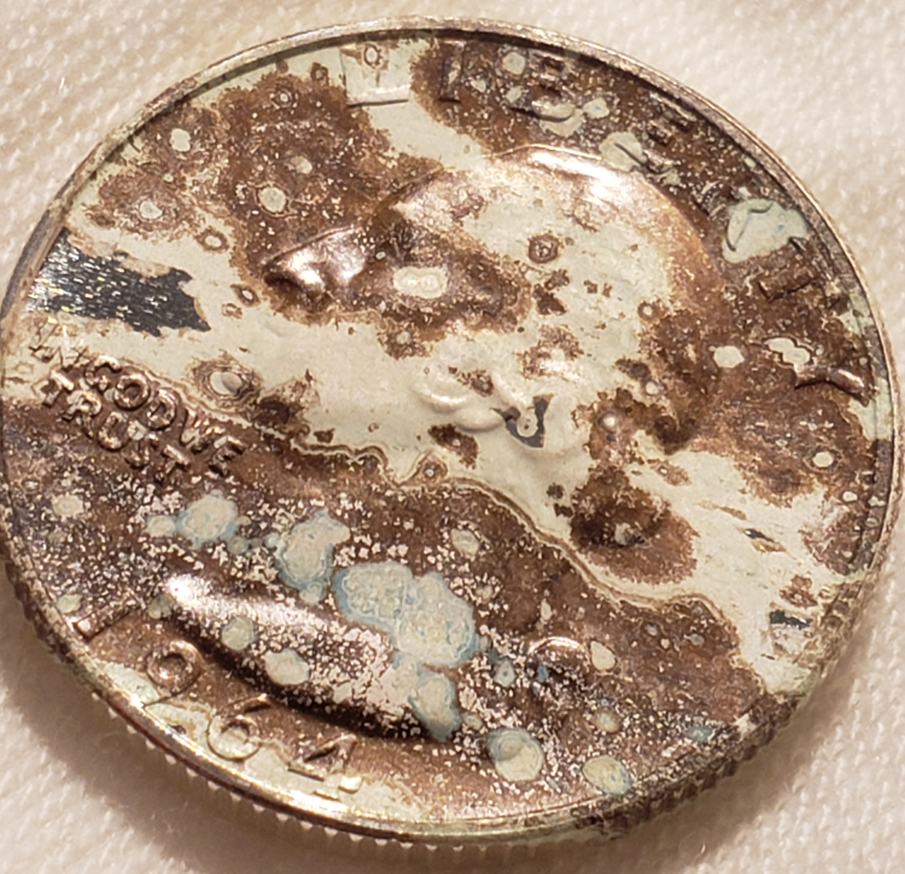 Looks like it resided in an unflushed public toilet for a number of years. Wear a hazmat suit if you plan on touching the coin.