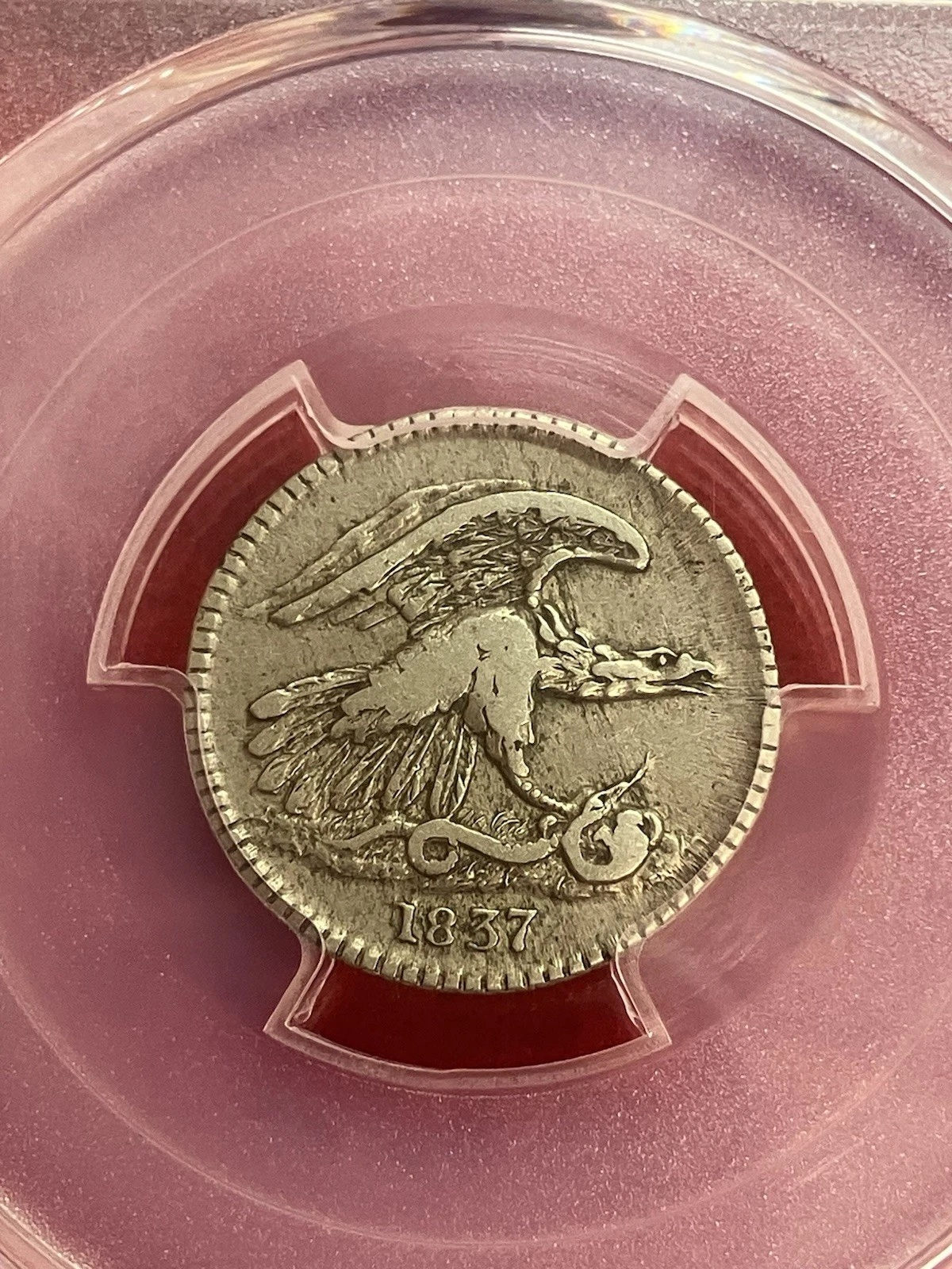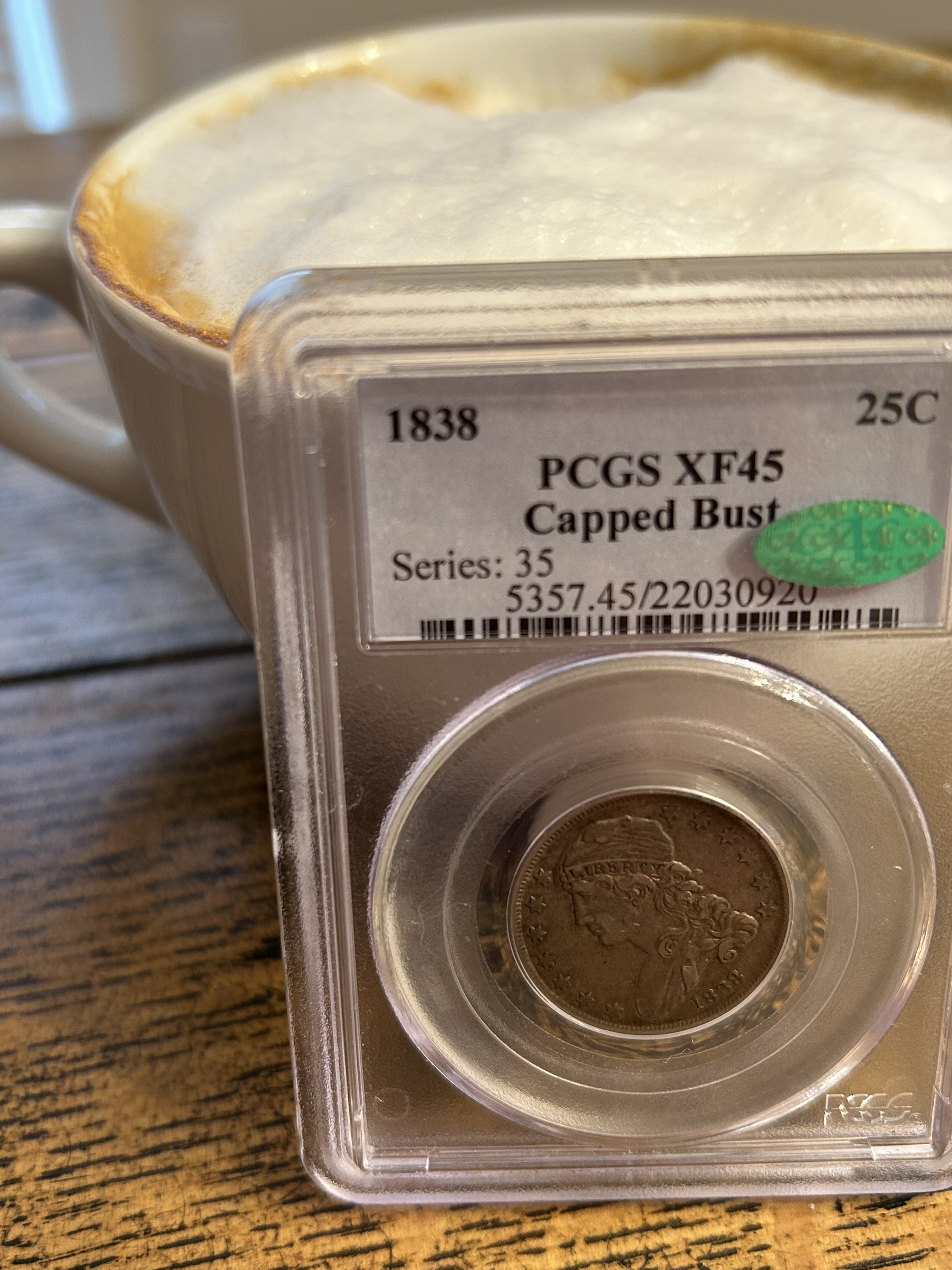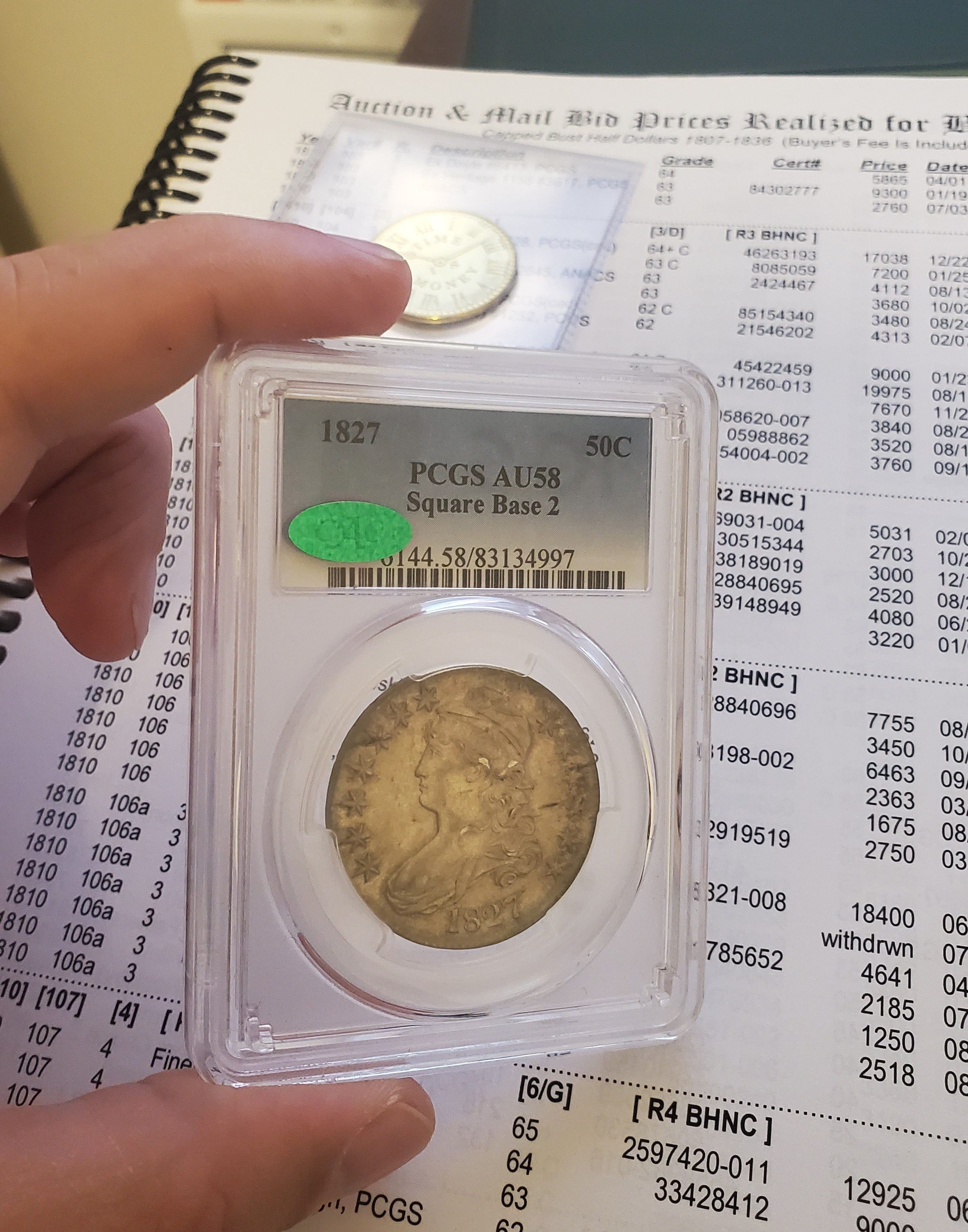 It had the right look (not bright, and with some patina and good luster), the right TPG (PCGS), the right grade (58), the right ornament (green bean) ... and was a 1827 Die Marriage I don't have, in the more difficult DS. Also, the price wasn't ridiculous and so all in all, I felt comfortable.