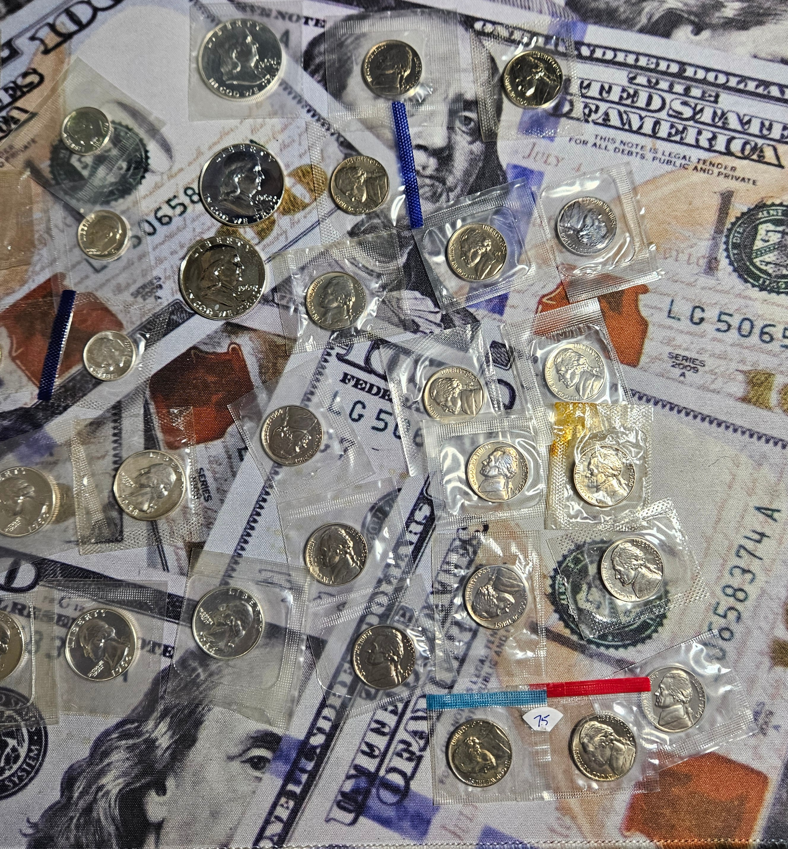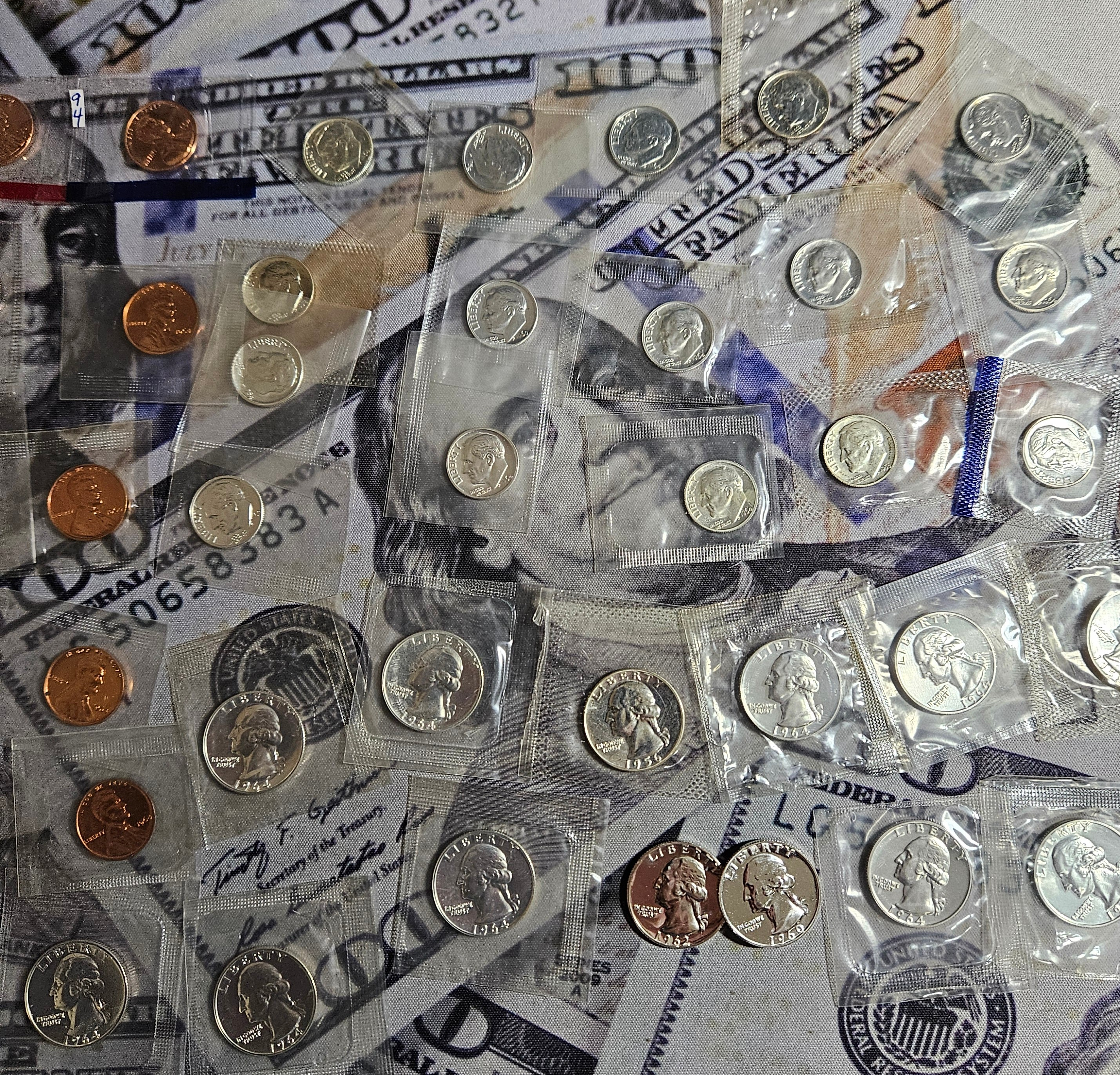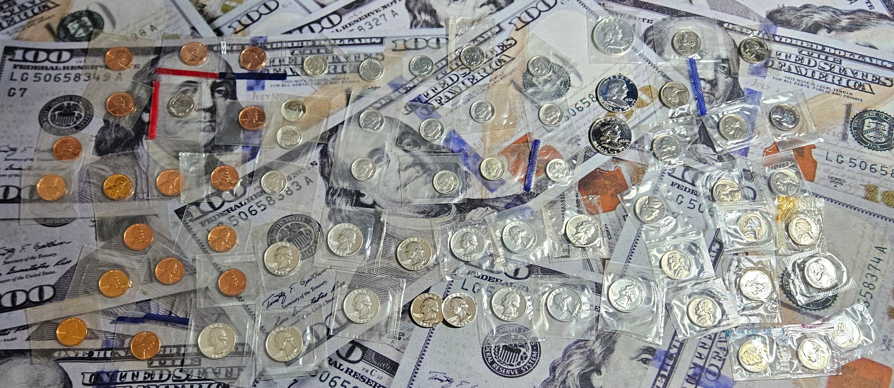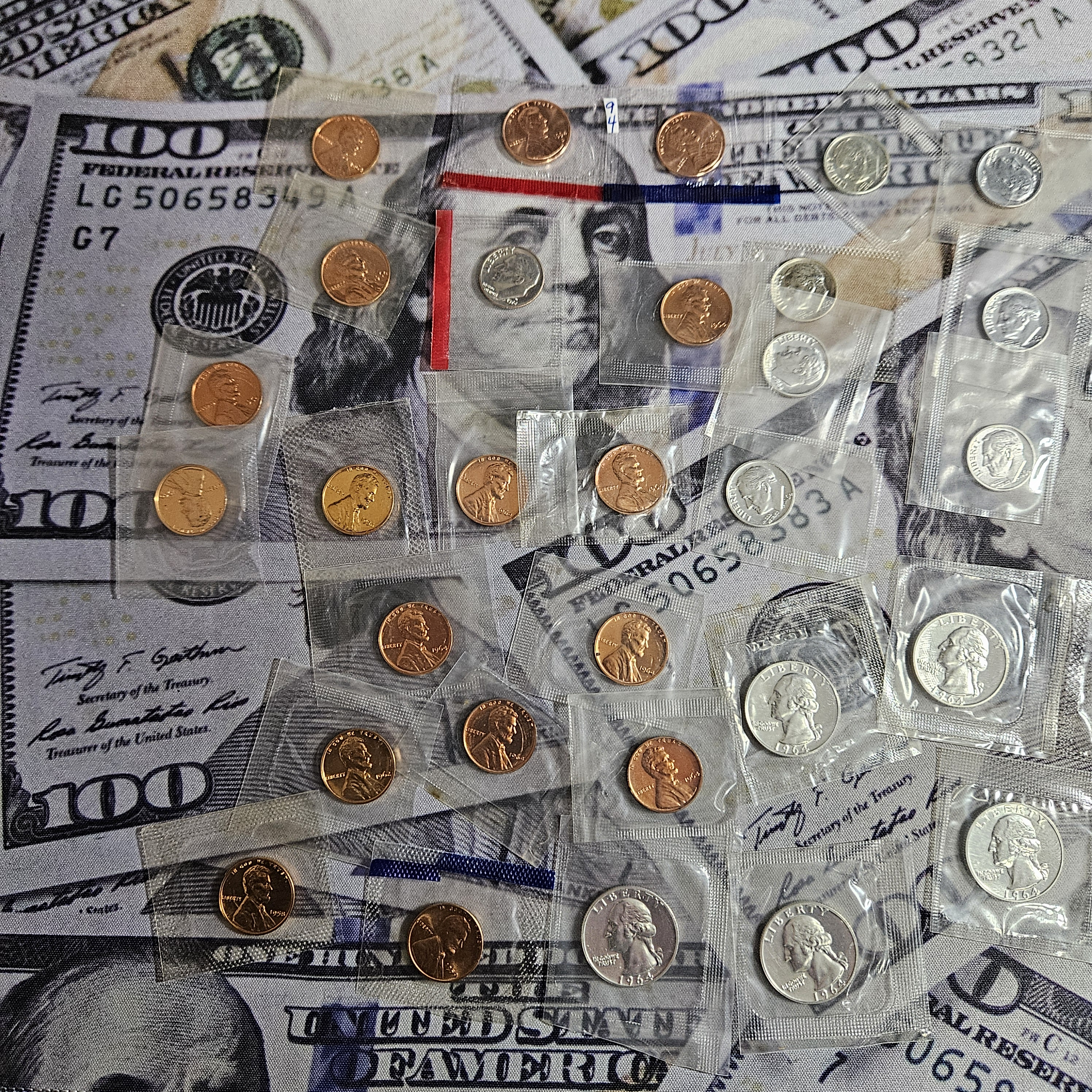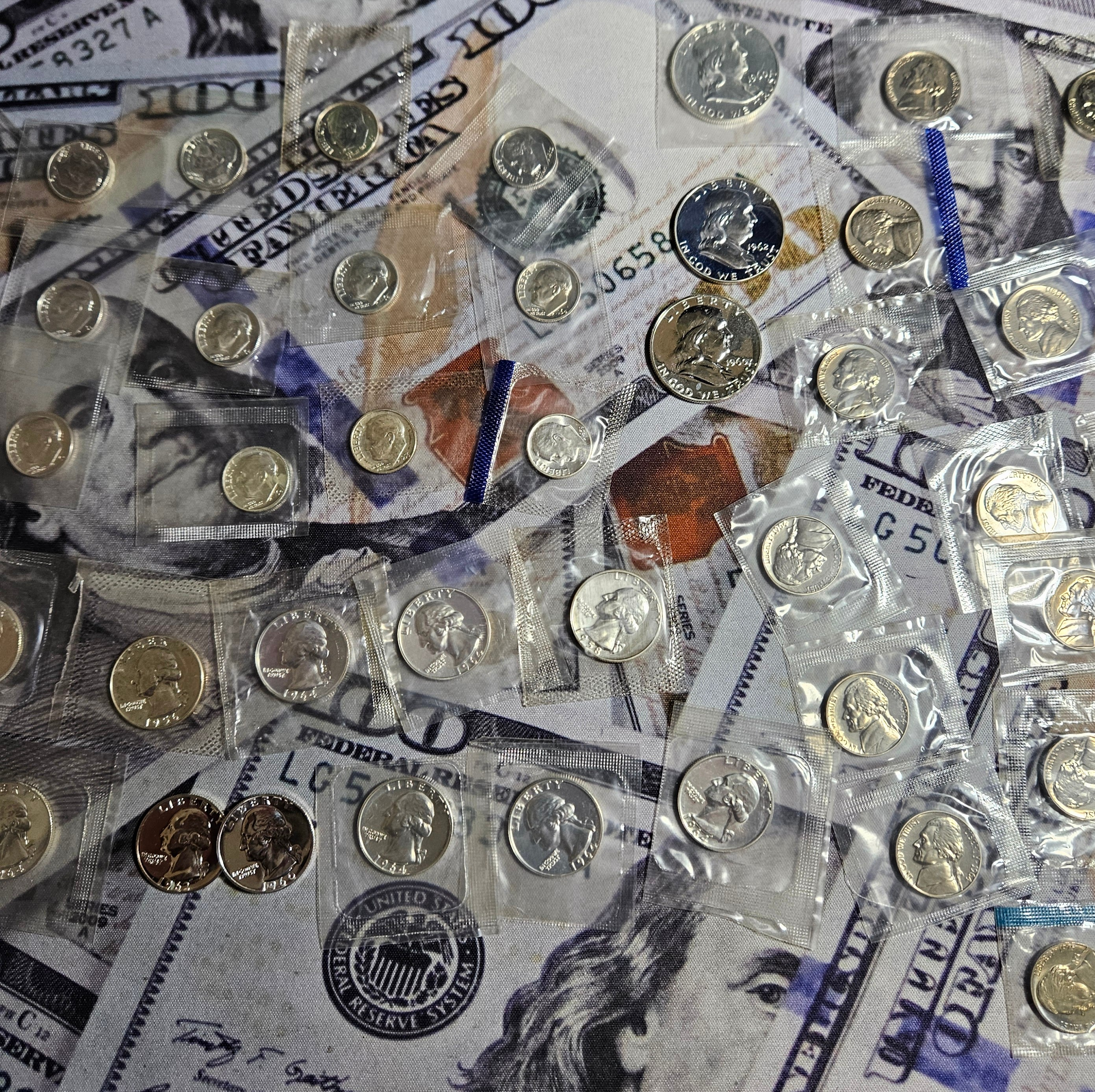 I came across these cello wrapped coins last night. I had completely forgotten about them. There are 16 silver dimes. 14 silver quarters, and 3 franklin Half dollars. I knew I had a bunch of cello wrapped cents in another box, but these are a different lot. Over 5 ounces of silver here on my desk. I might send 2 of the Franklins off to be graded too.
