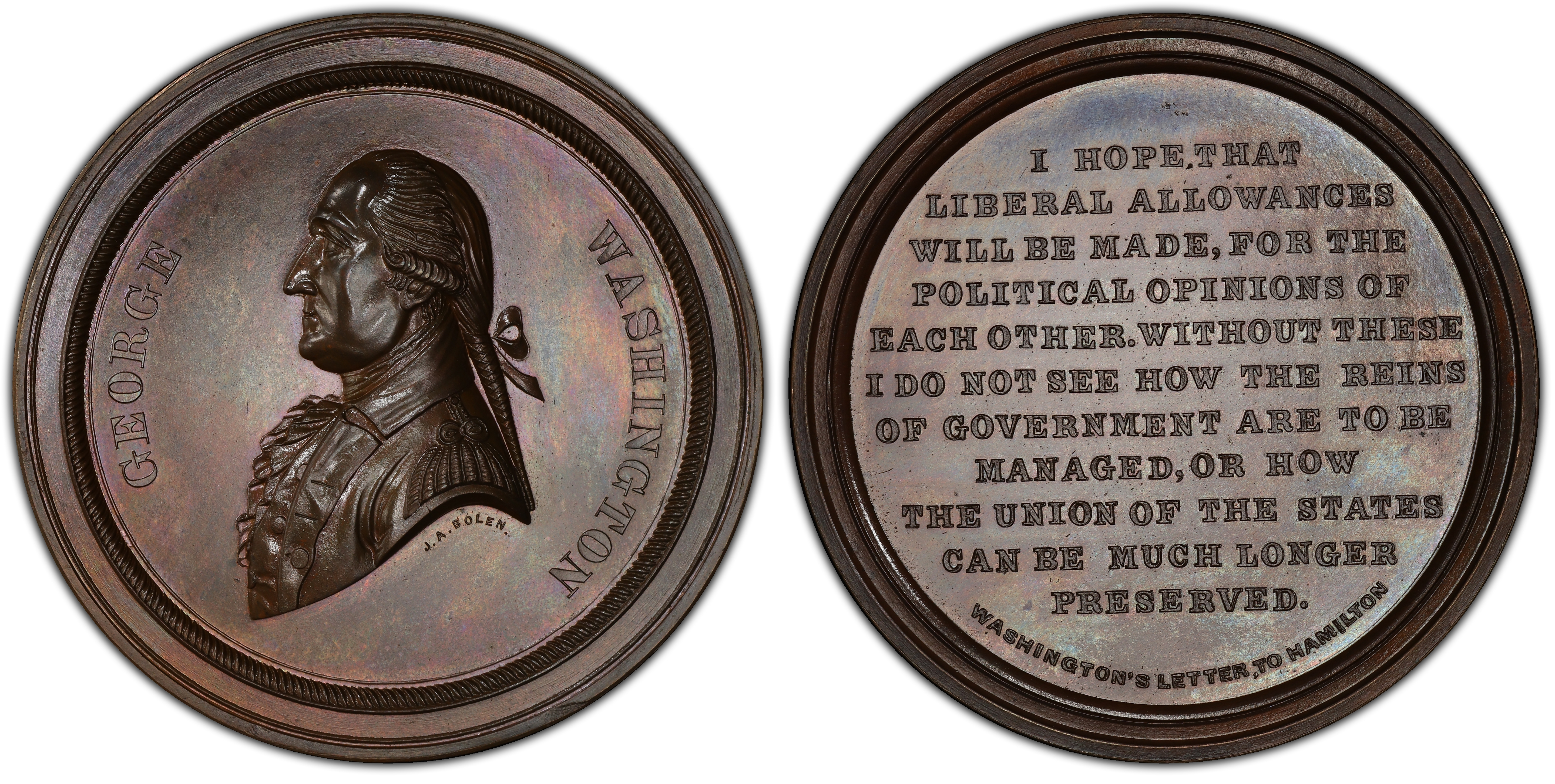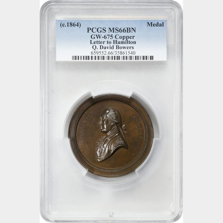 Bolen's masterpiece, the enormous "Letter to Hamilton" medal. It's graded by PCGS MS66BN, the finest known in any composition. Honestly, it doesn't need the slab. The surfaces are just incredible, almost flawless for such a big chunk of copper. It is a hulking 59mm, and it is housed in a PCGS oversized holder.