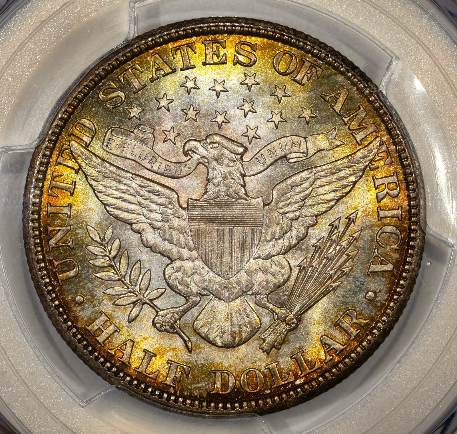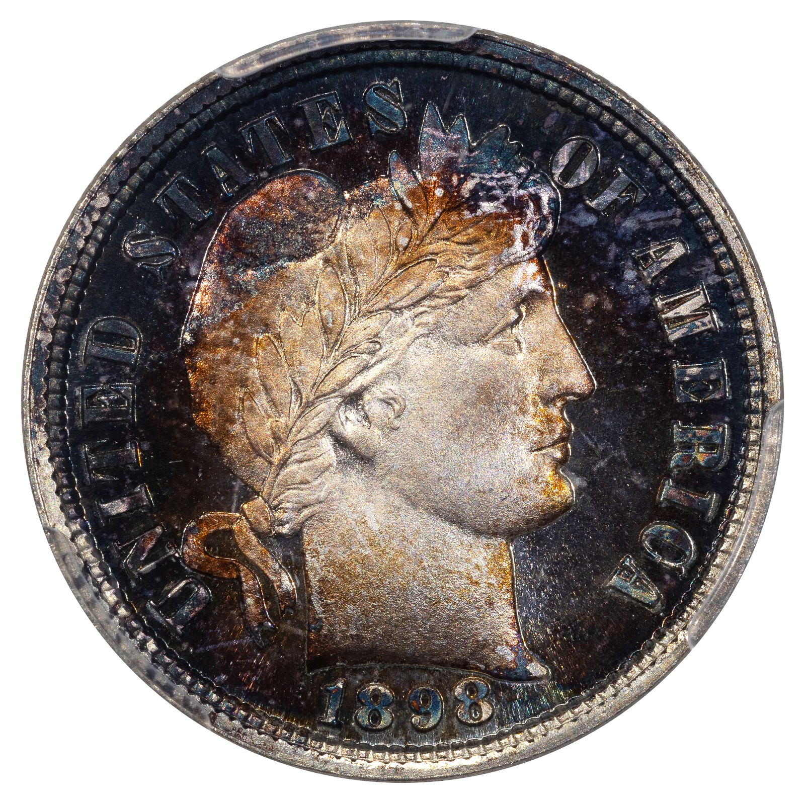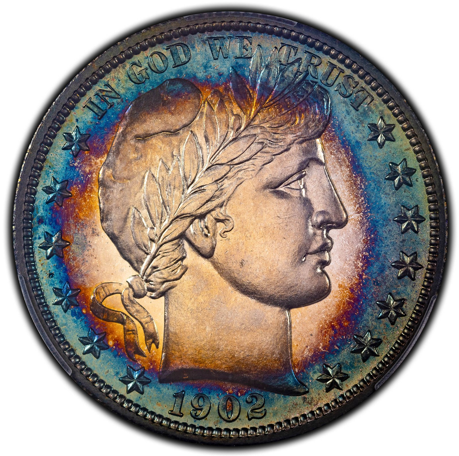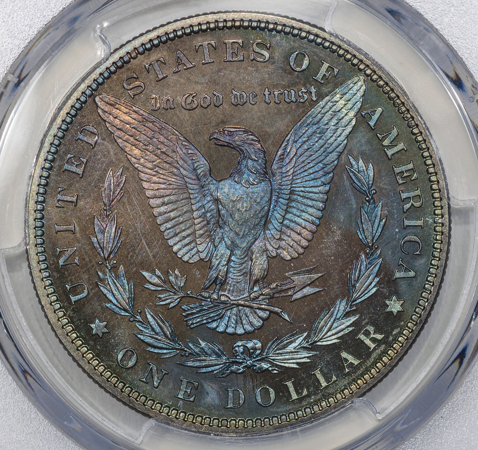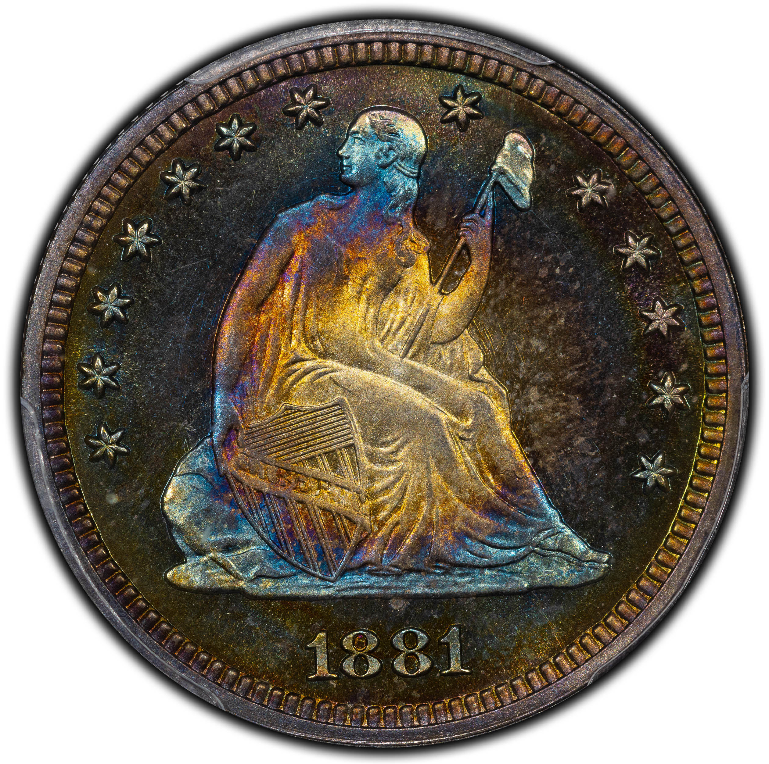 1877-S WB-6 "Weird F" that I grade as VF30 details - scratch, off eBay. Striking toning, with orange and red-orange around the devices and mottled black, gray, slate blue, and sky-blue toning in the fields. It does have an obverse scratch that likely will prevent it from straight grading. Someday, I'll send it to one of our excellent board photographers to wrestle with.