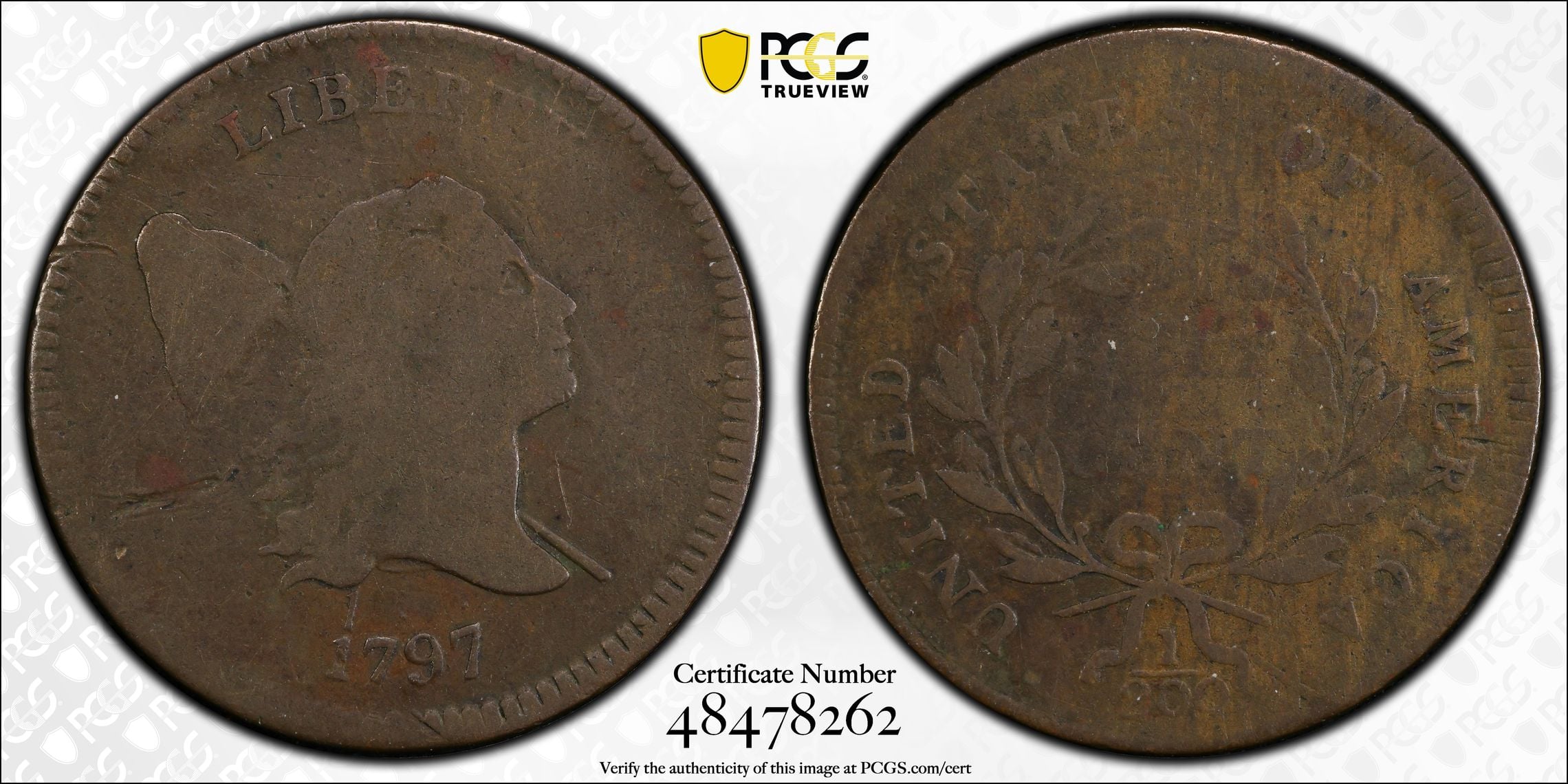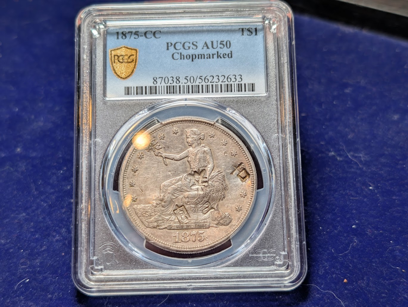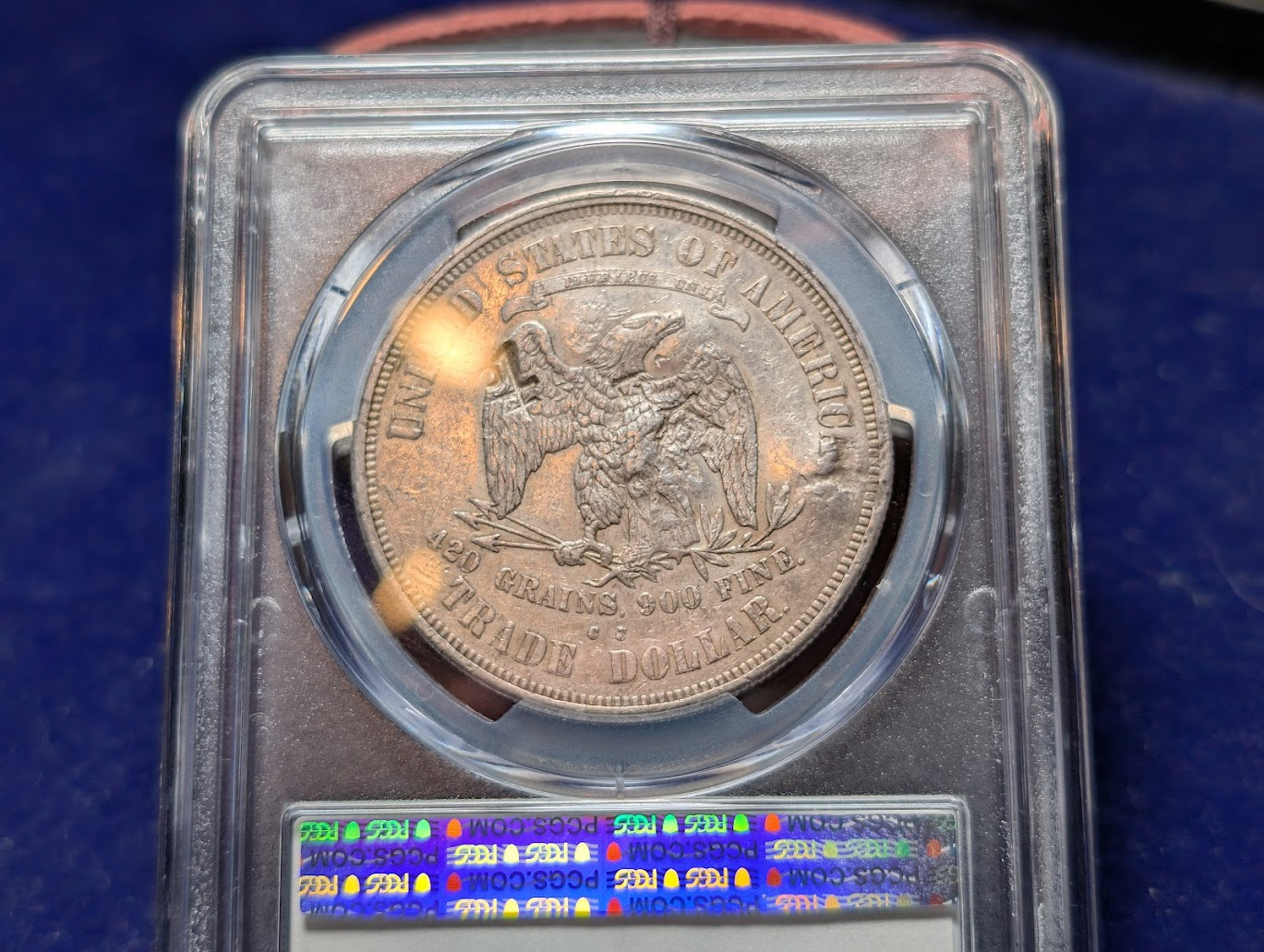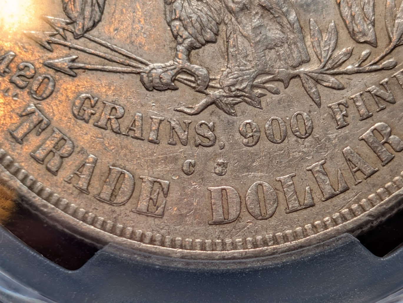 Luckily, there are plenty of markers. The big die crack on the obverse going through star 1 and through the ocean down to the rim is one. On the reverse, big die cracks through United and Trade and spreading out along the top of the second S in States. The mintmark is also pretty far to the right to allow for the polished off C to the left. There is a tiny hint of the C remaining.