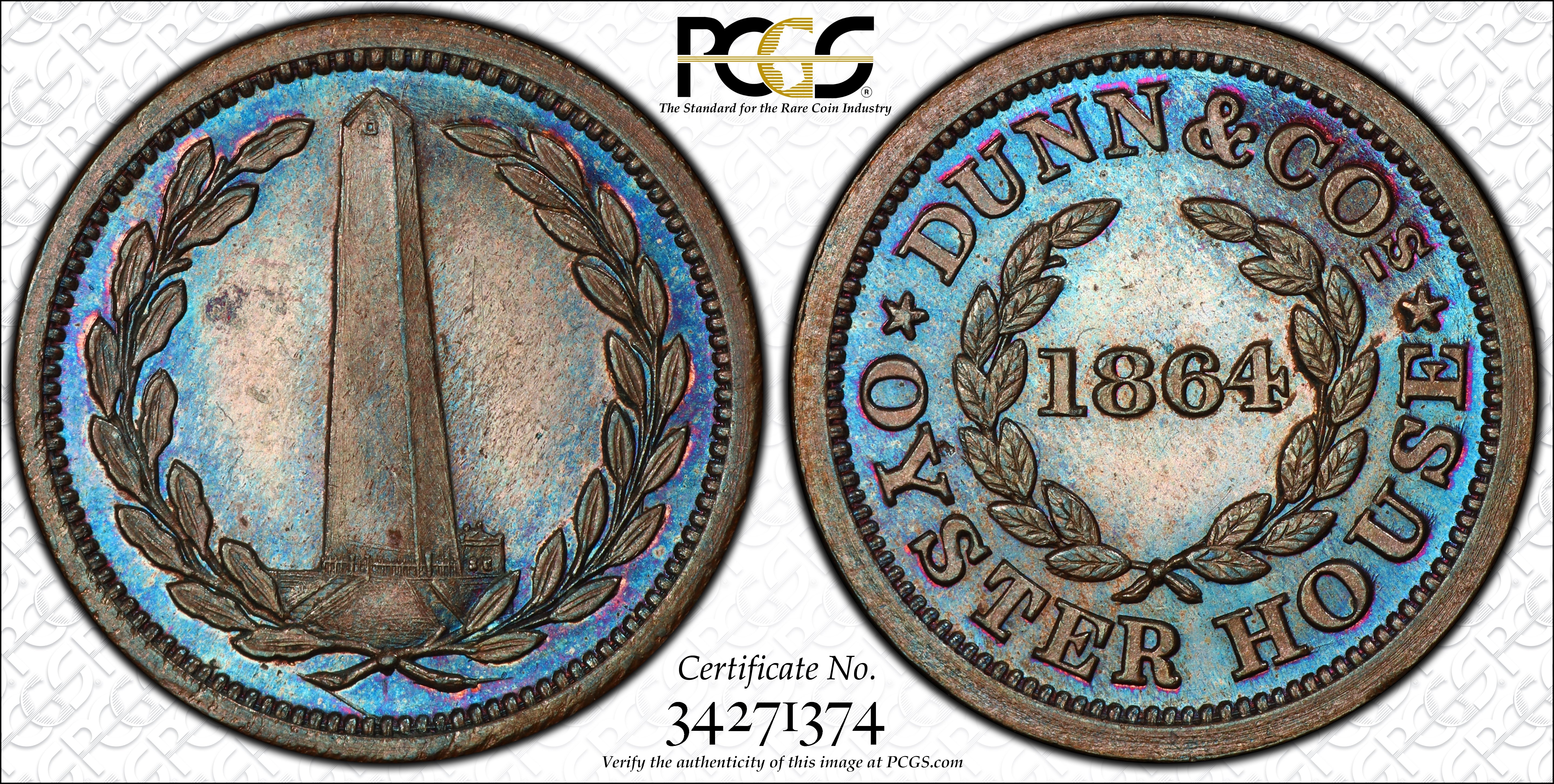 Here's a civil war token that happens to have beautiful toning. The Bunker Hill monument is portrayed on the reverse as this one is from Charlestown, MA. By Joseph H Merriam of Boston