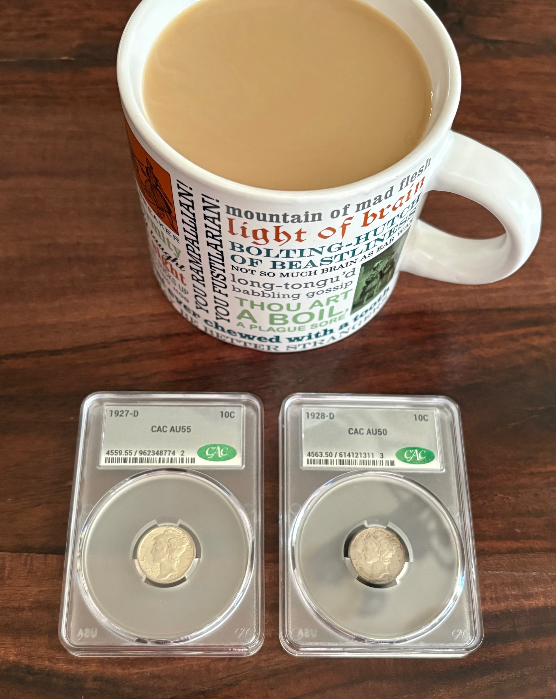 This morning I'm enjoying my mug of insults from Shakespeare and two newly graded dimes. It's surprisingly tough to find branch mint dimes from the 1920s in wholesome AU condition, and these two represent years of searching.