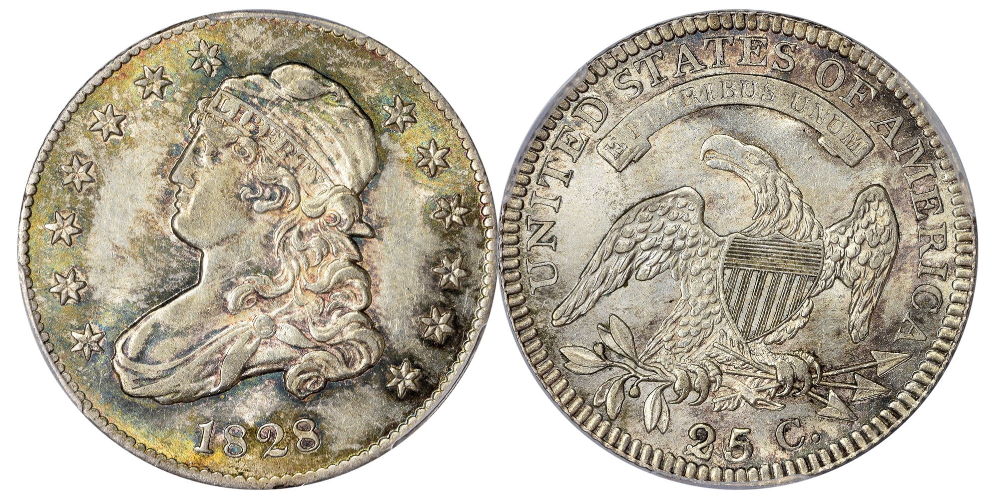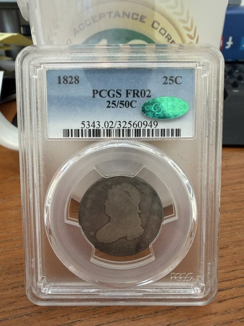 Here is a favorite Capped Bust quarter 1828 25 over 50 variety. Below is the lowest CAC'd in Fair -2 and one of the highest CAC'd grades - I really tried to downgrade my Fair 2 to a Poor 1 but PCGS won't do it. I carried it in my pocket for 3 months but it won't show enough wear to get a Poor-1! Oh well! I guess PCGS is on to me......