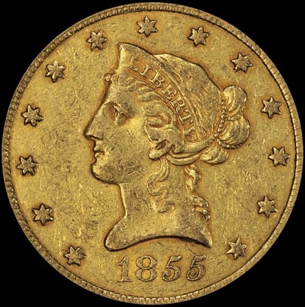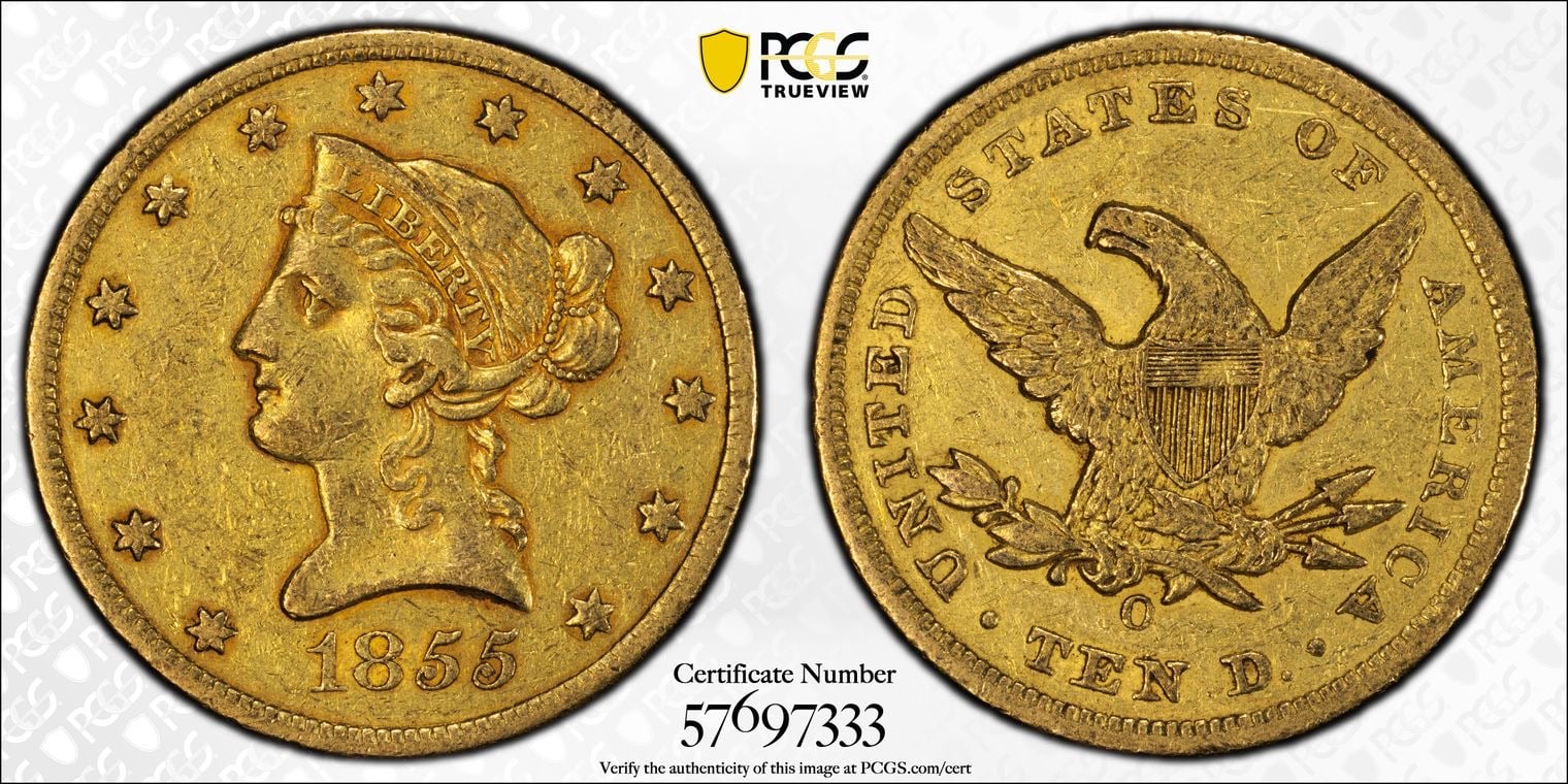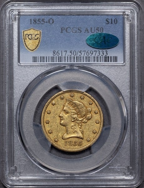 Doug Winter, in his latest book on NO gold, states the 1855-O Eagle is tied for 3rd rarest among the “No Motto” issues. Further, in AU/MS grades, it’s 3rd rarest. In fact, AU55-58’s are tough to find, with only 2 MS61 grades at present that are higher. Most known are graded VF-XF.