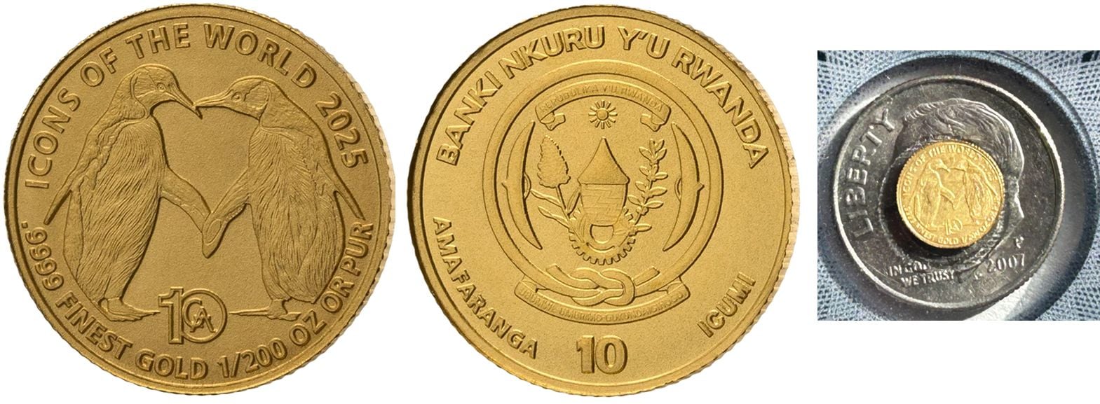 2025 Rwanda, Icons of the World "Penguins in Love", 10 Francs, 1/2000 oz Au, 10000 max mintage, 8mm (1/2 size of a dime)
