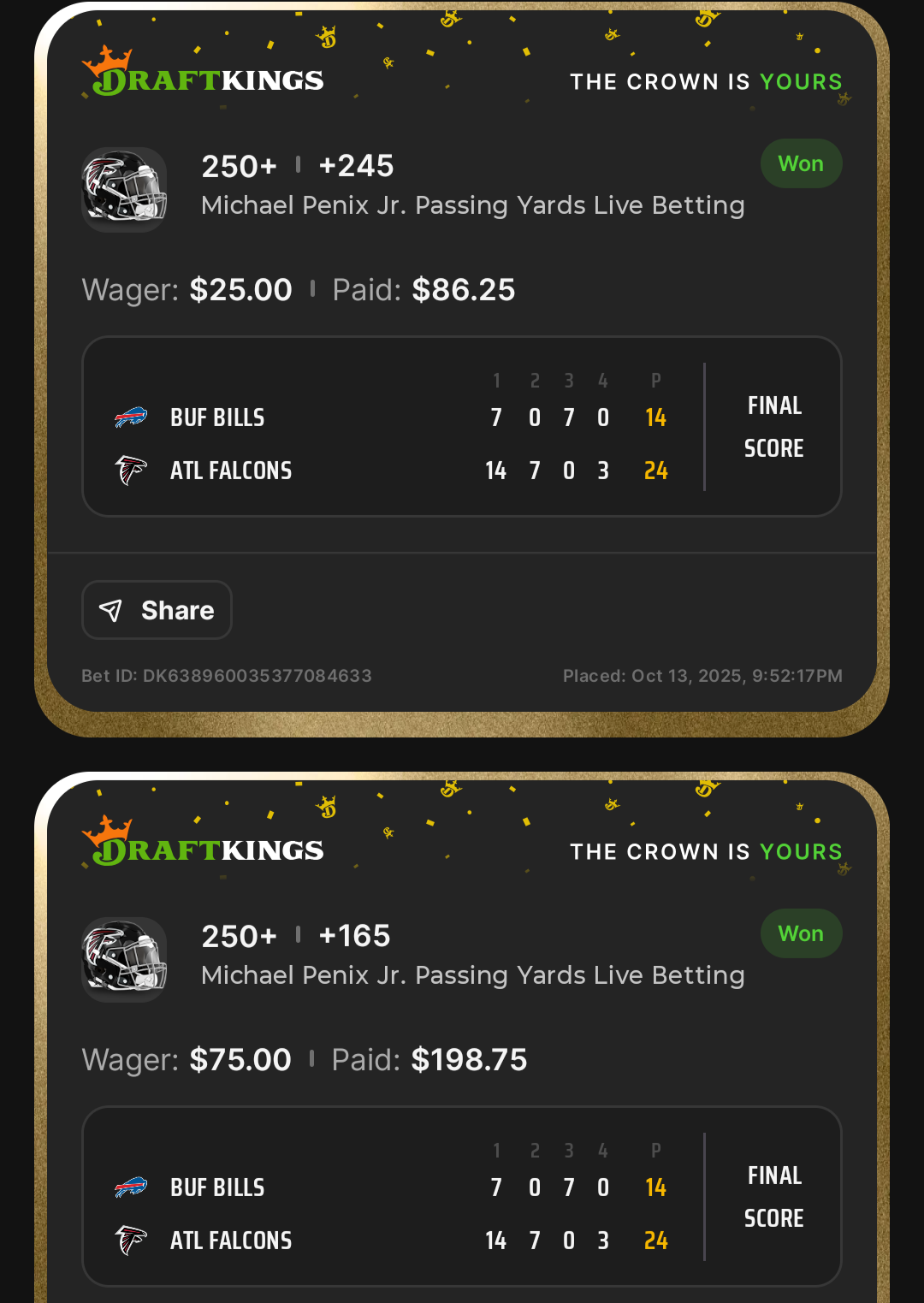 So I'm still processing losing out on a thousand dollars because Diggs couldn't get 15 yards more receiving and that happened because of a flag