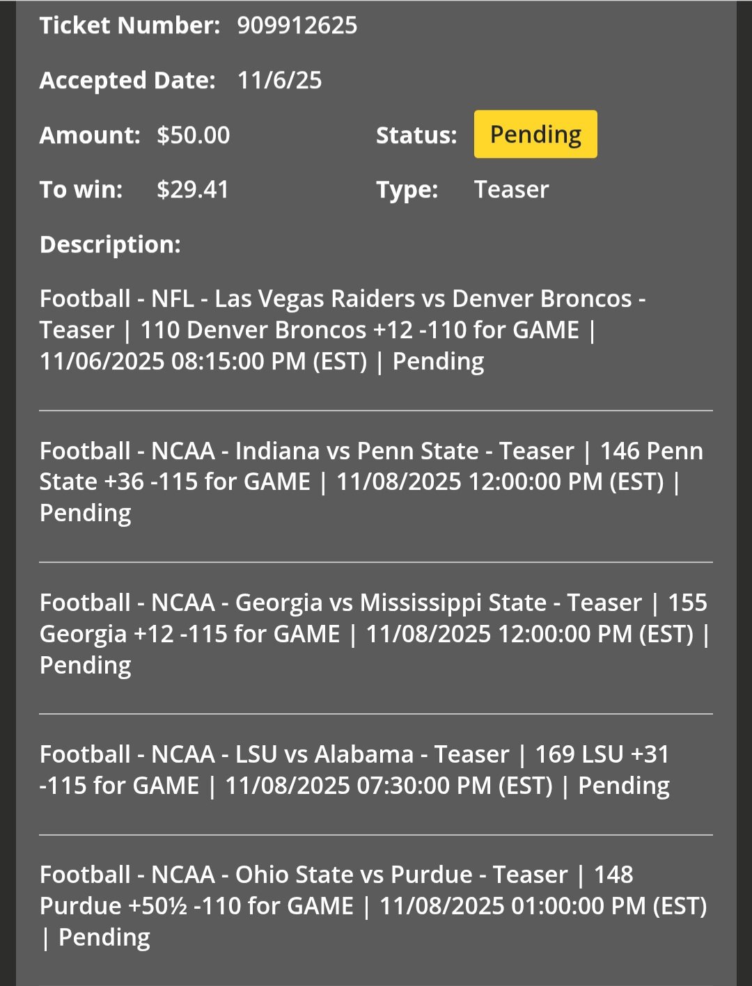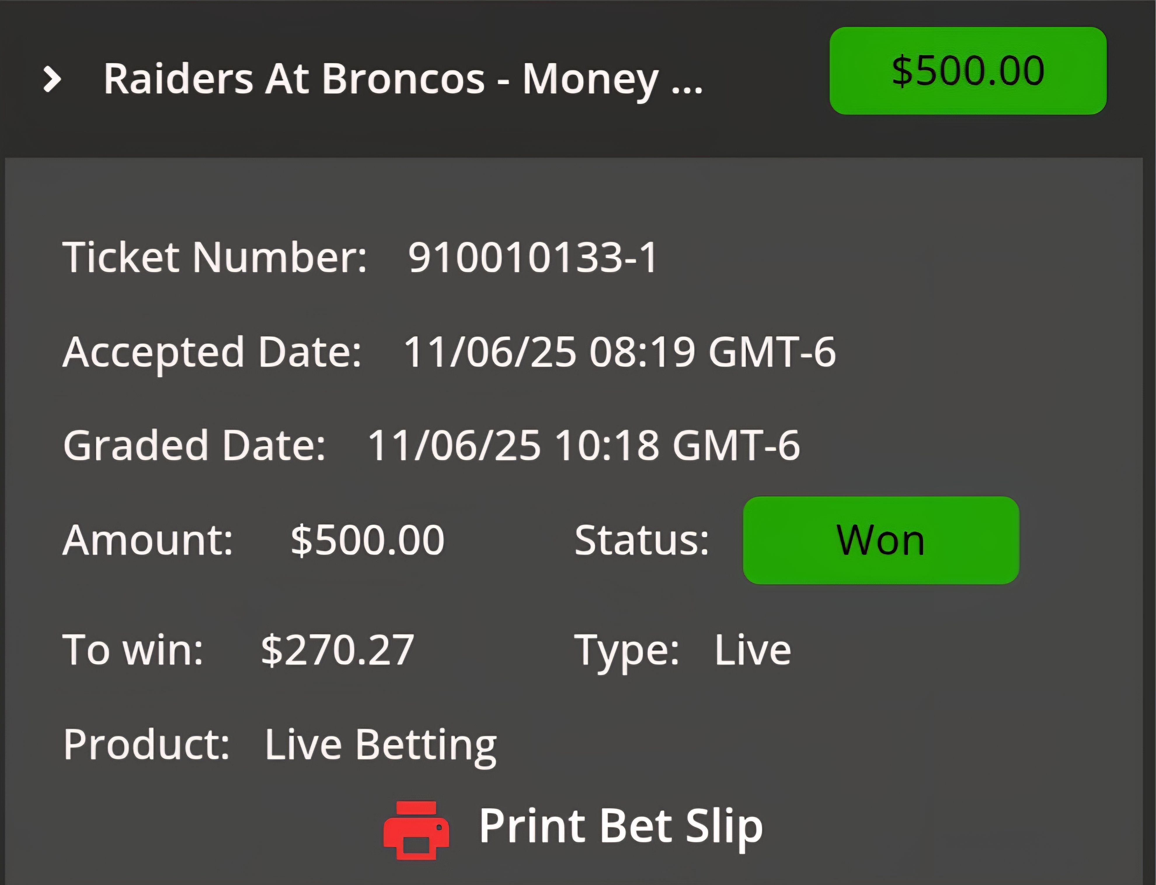 fellas i did a thing last night. i was at a 🏀 game and whipped out my phone to see what the Den-LV score was. 2nd quarter, Raiders up 7-0, Broncos with the ball around midfield. stevek and i had been talking about live betting, and at that moment i felt the compulsion. it was time.
