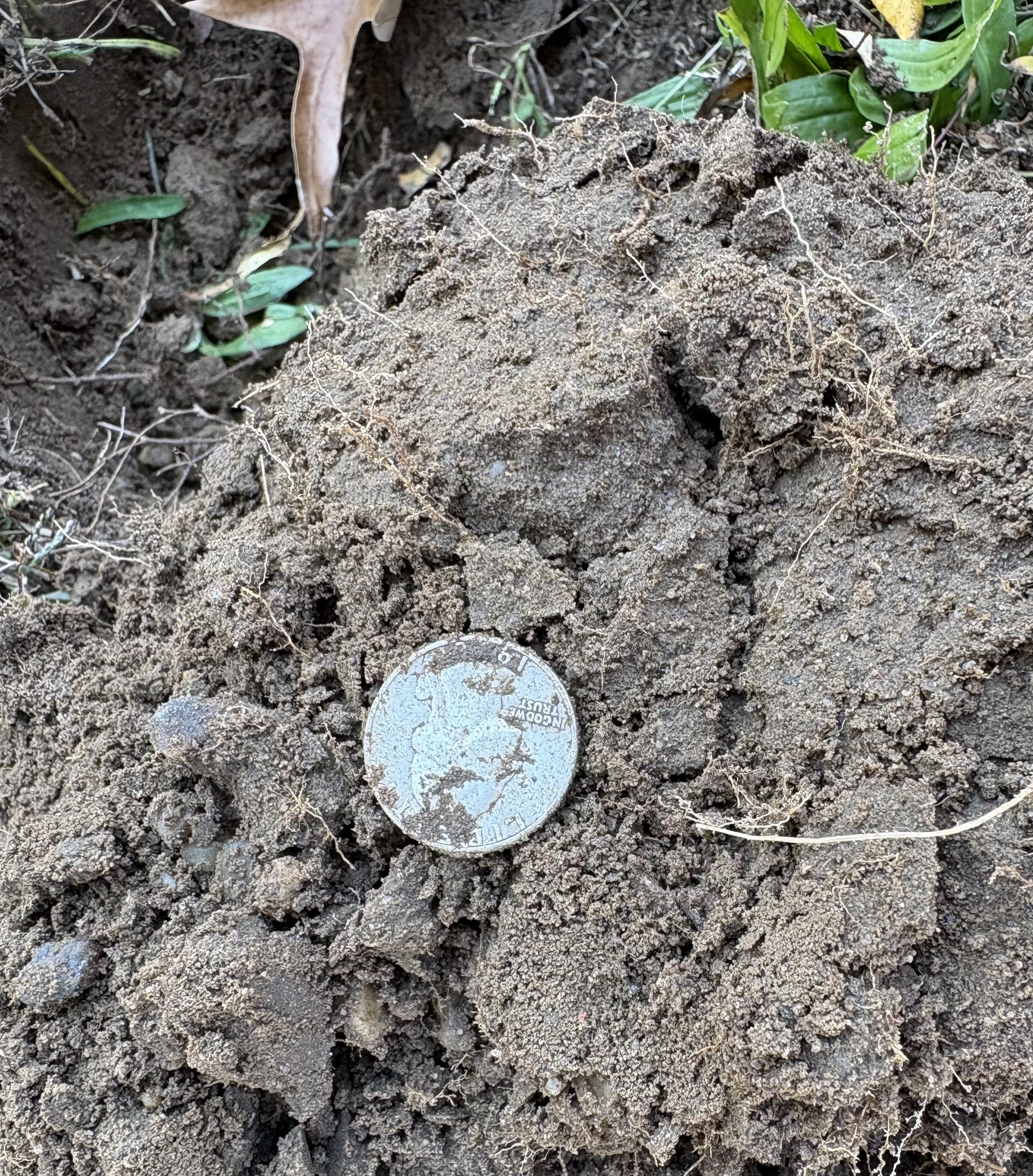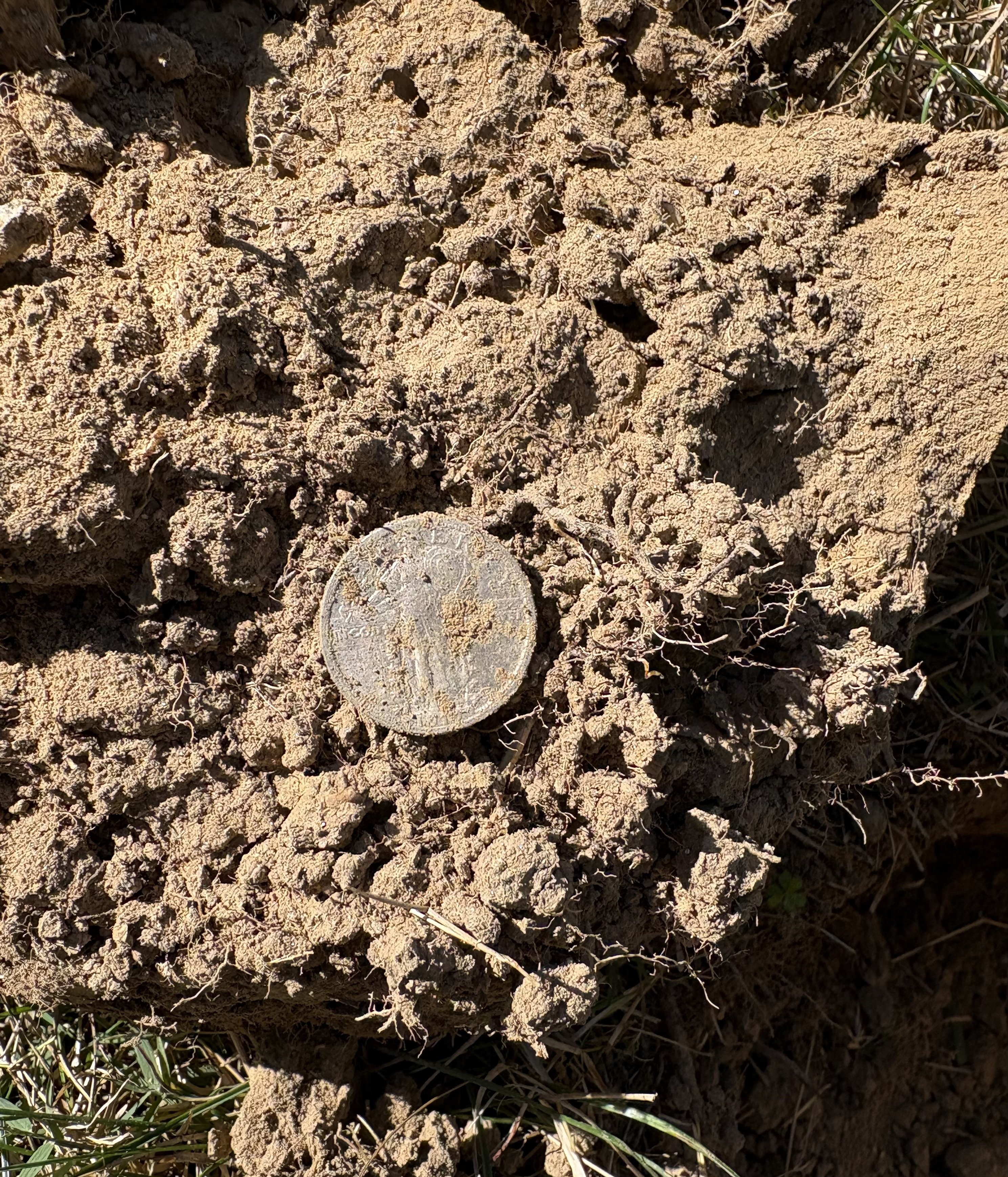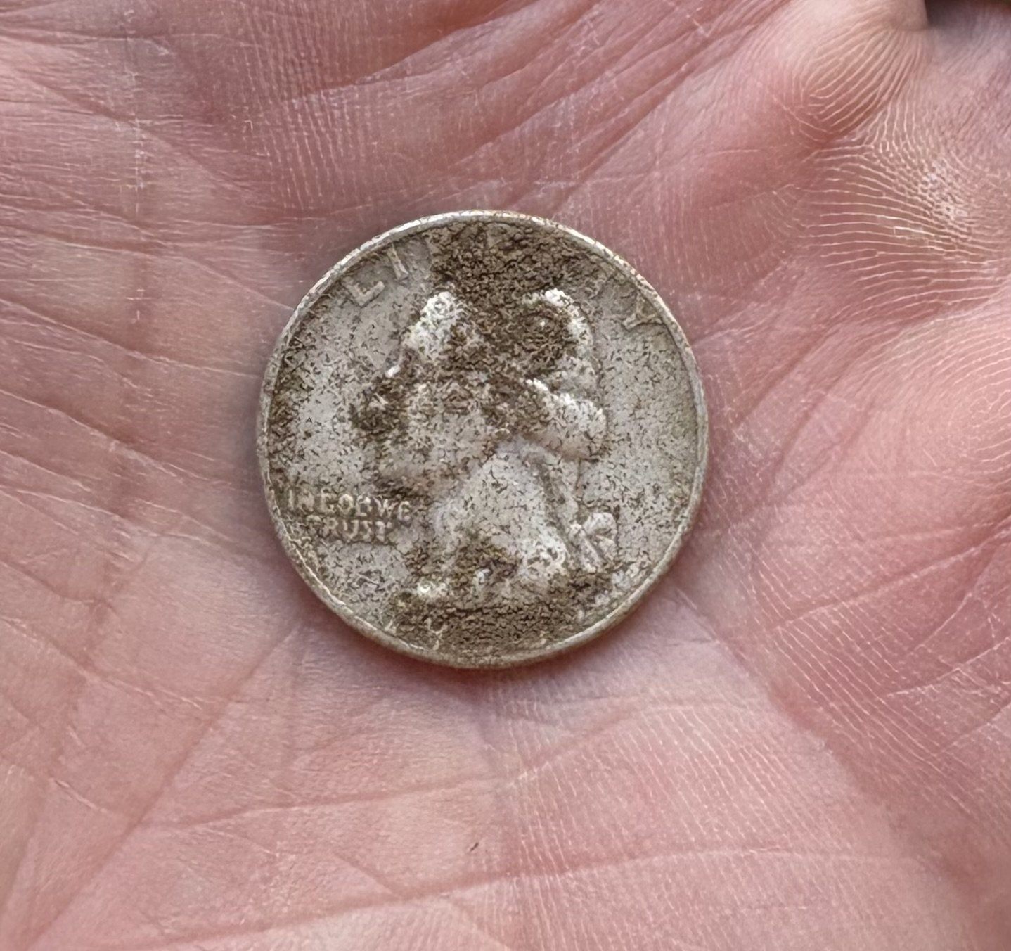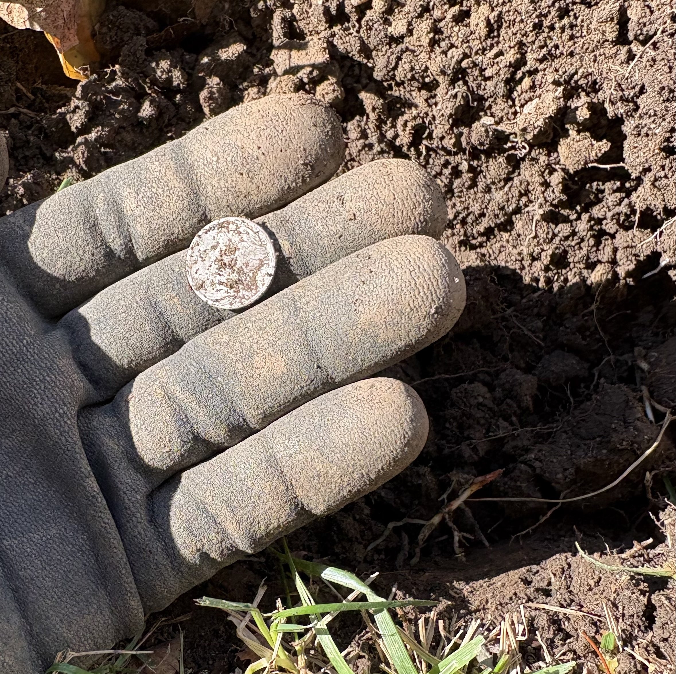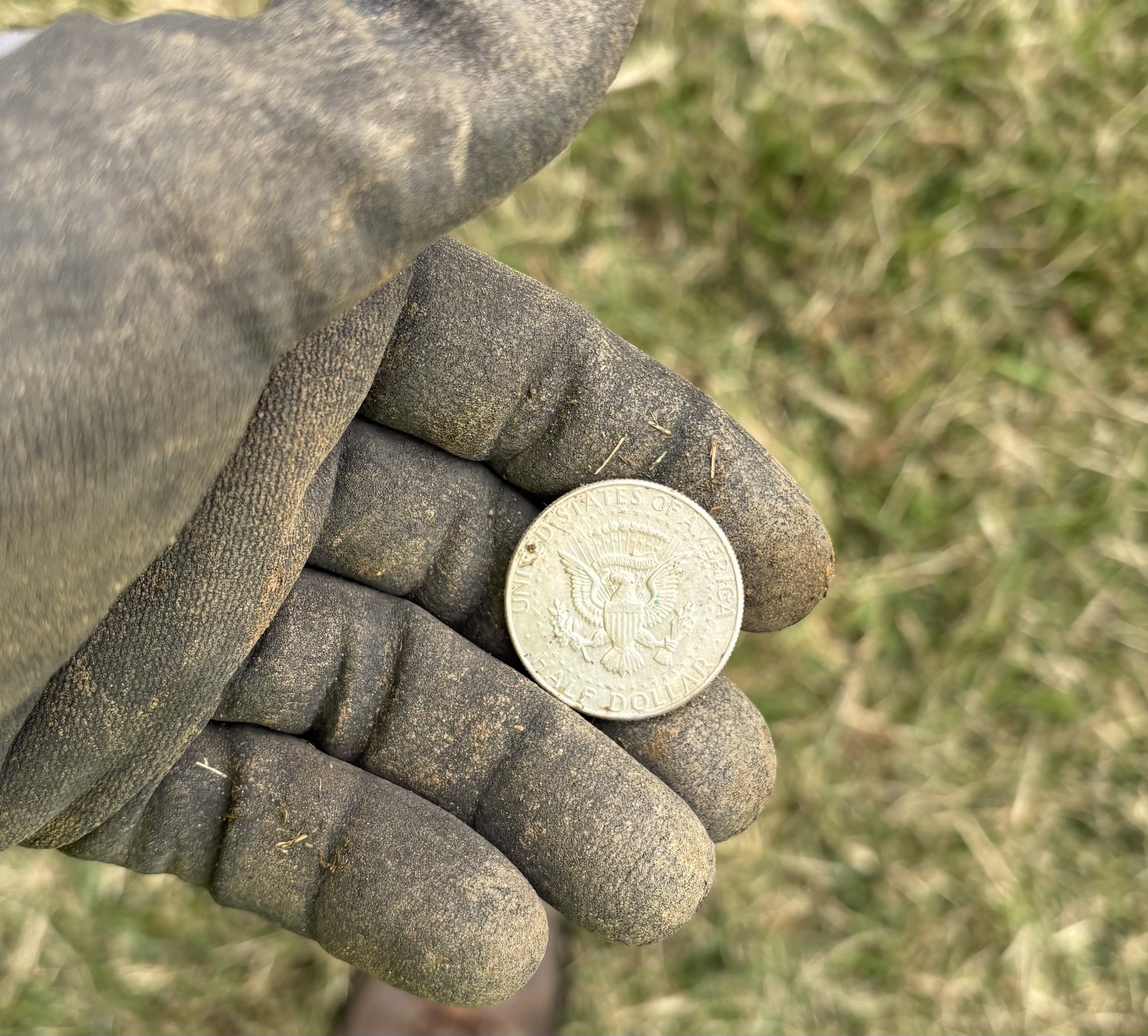 This 40% Kennedy was likely a more recent drop. When the Manticore picked it up, it was reading @ 3-4 inches deep when it was actually just embedded in the surface roots of the grass. I only realized it after I dug the plug and flipped it out, using the pinpointer to confirm it was much closer to the surface than I expected. I only had to pry it out from the surface roots to reveal it.