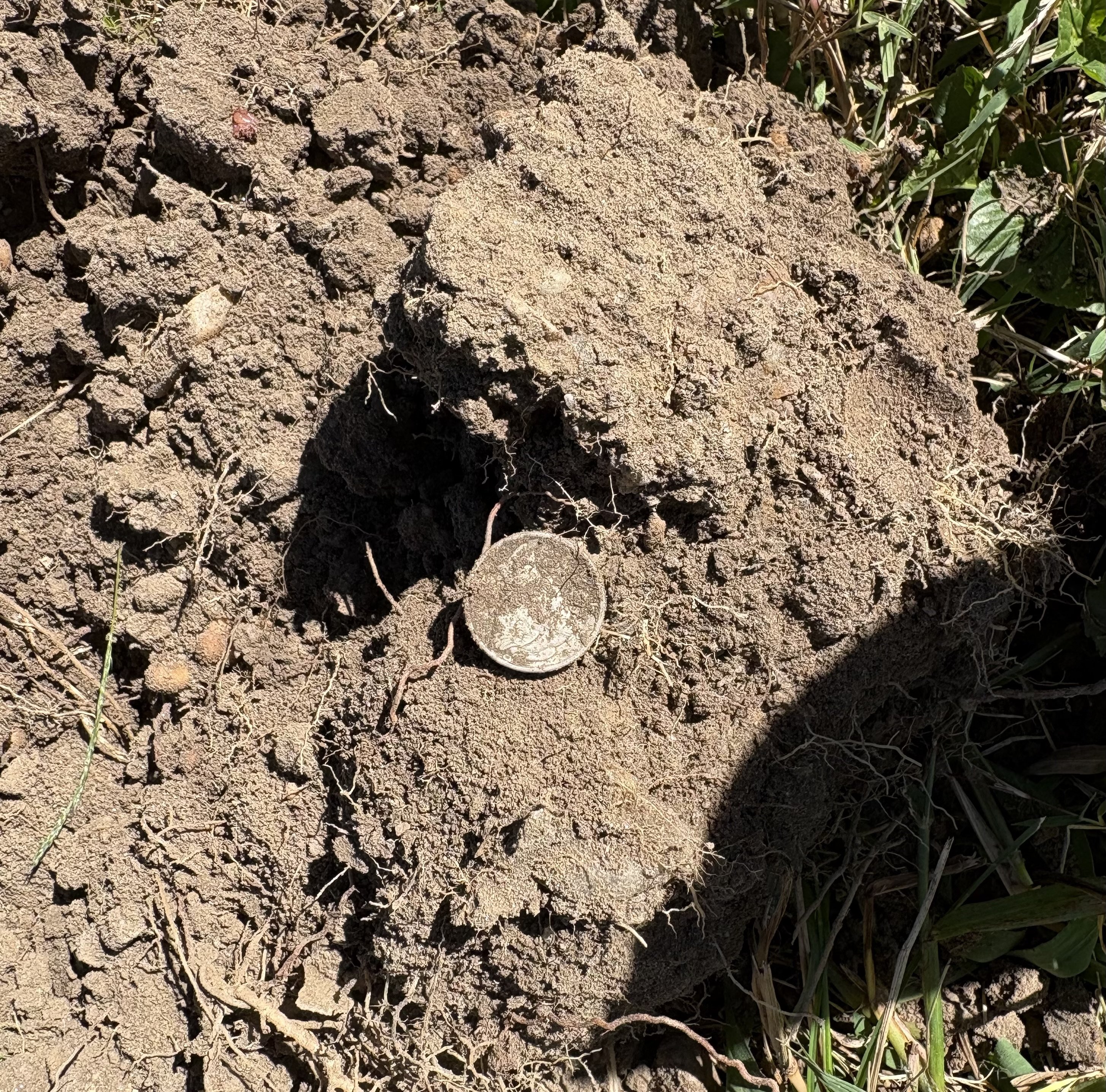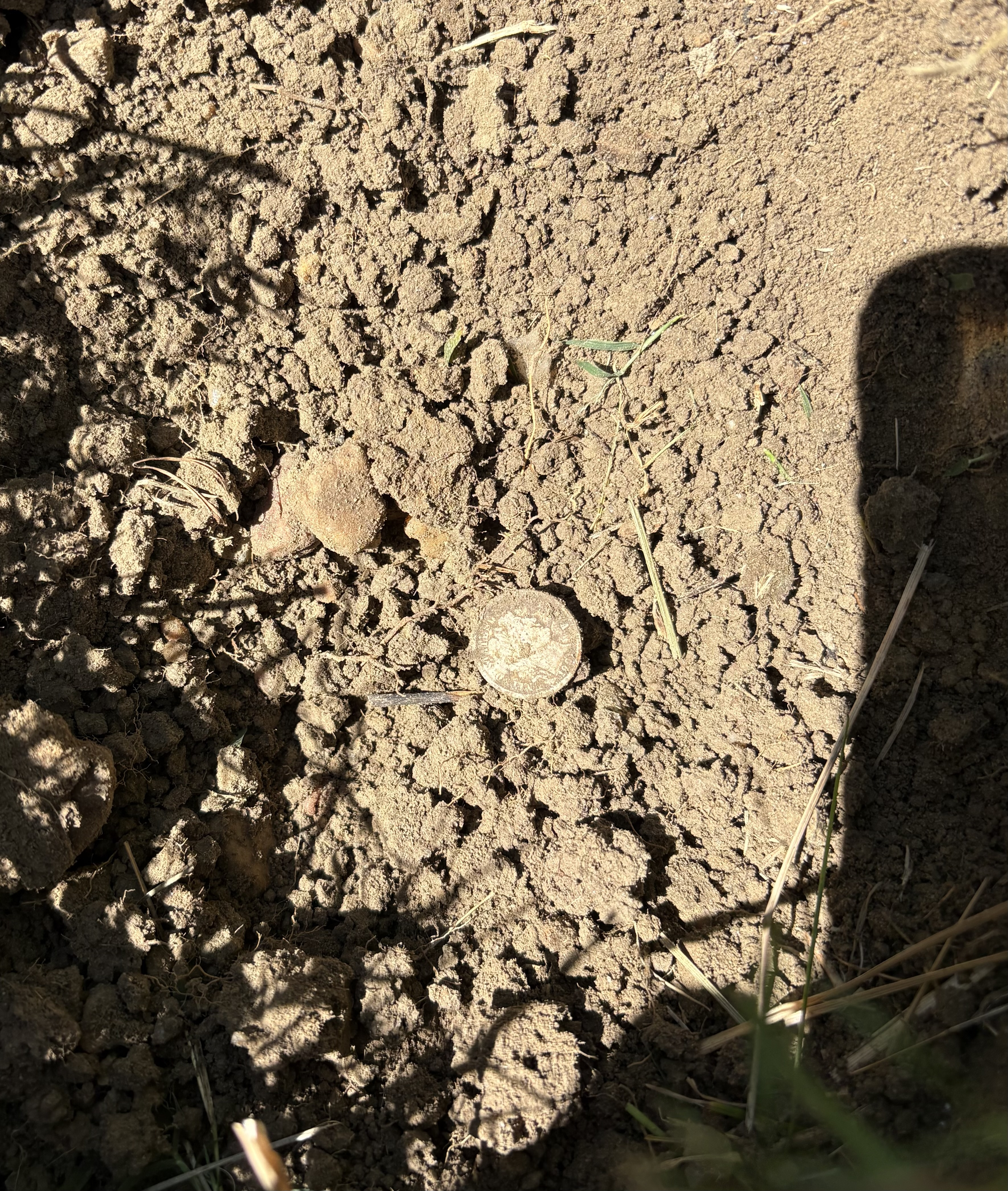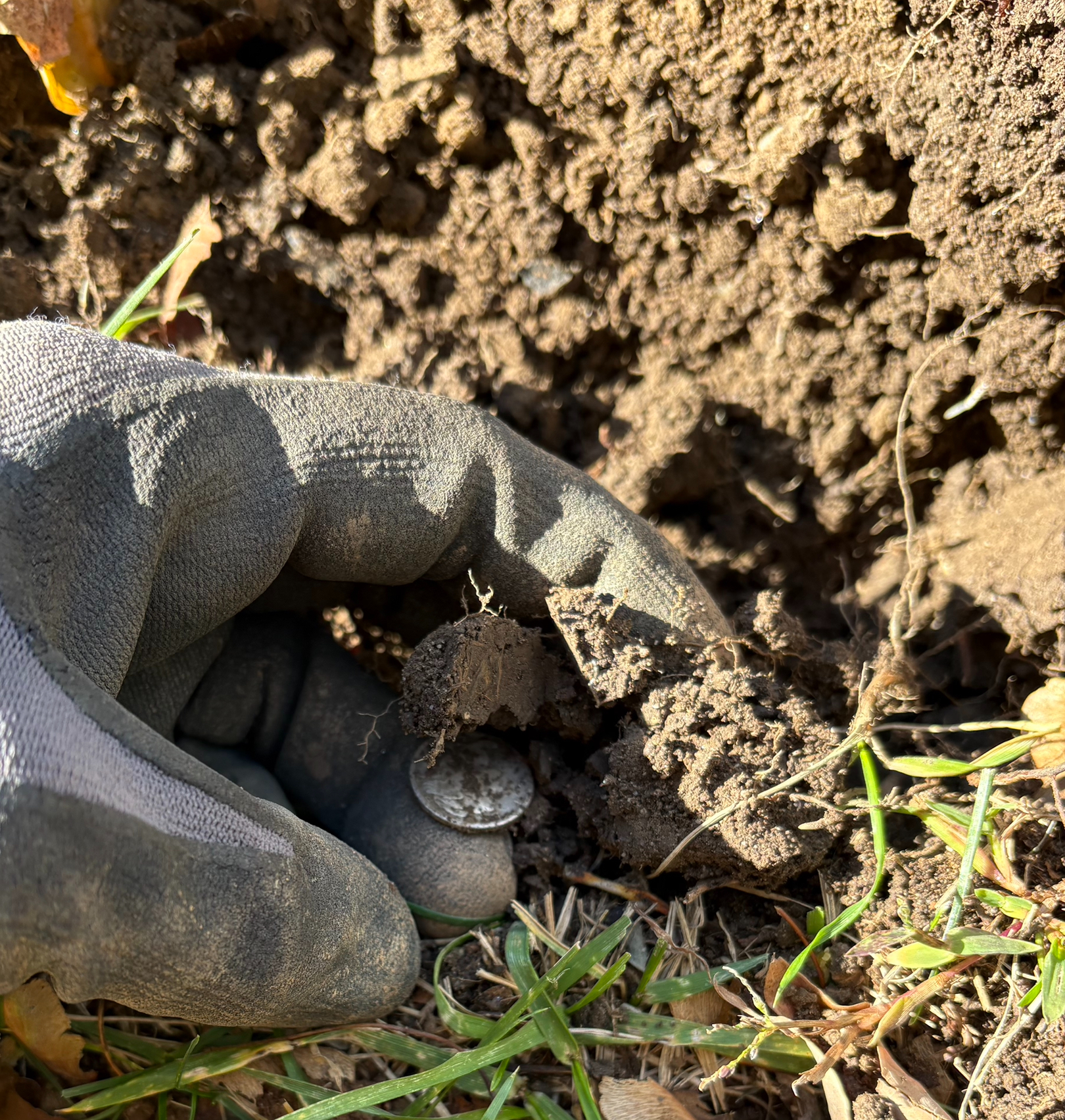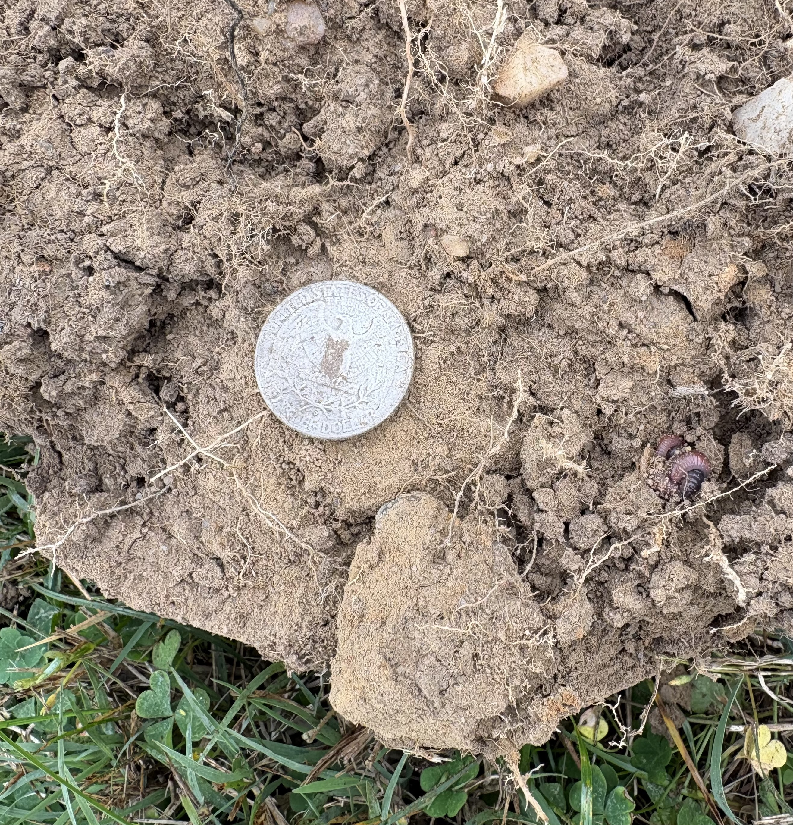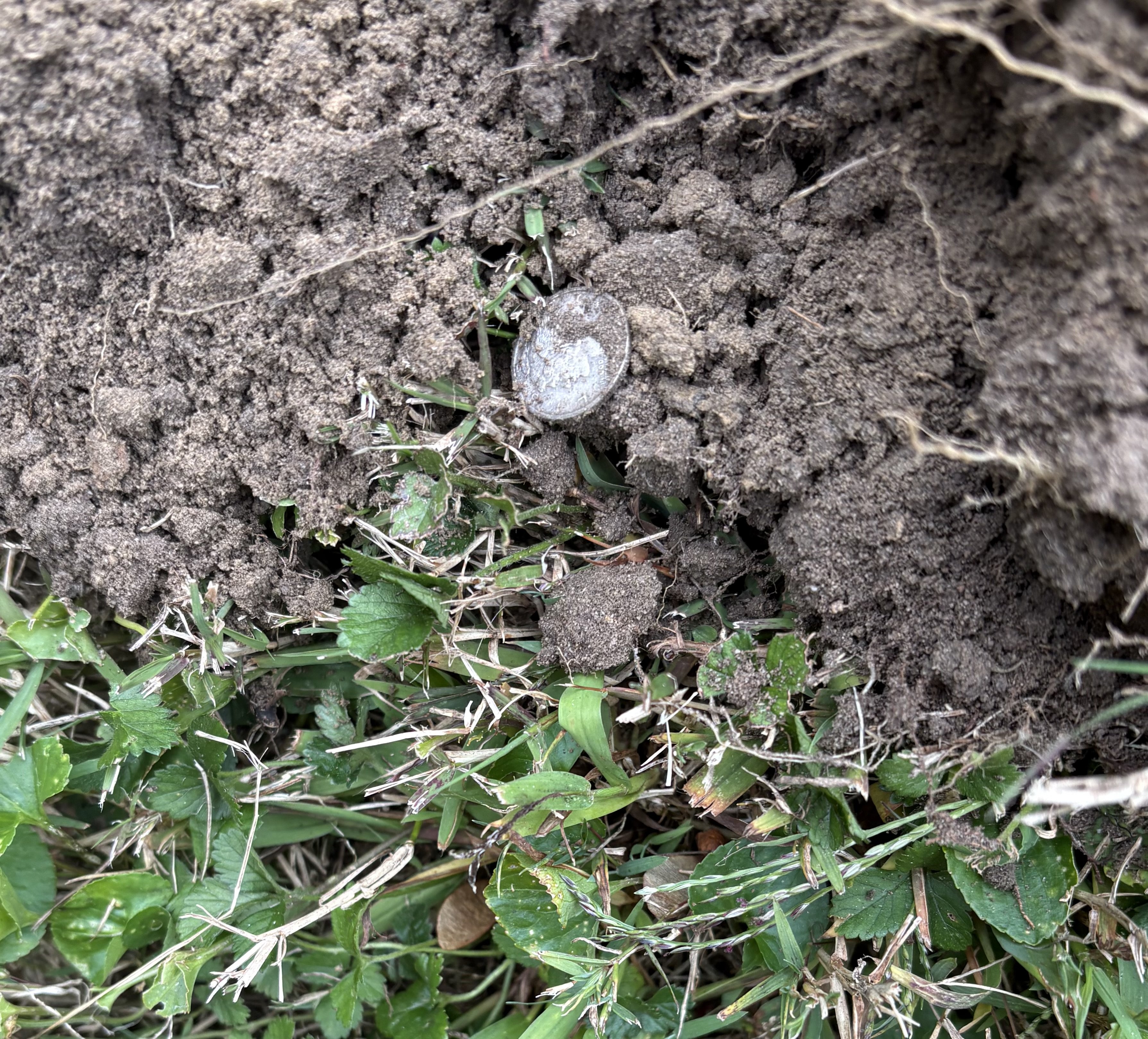 This 40% Kennedy was likely a more recent drop. When the Manticore picked it up, it was reading @ 3-4 inches deep when it was actually just embedded in the surface roots of the grass. I only realized it after I dug the plug and flipped it out, using the pinpointer to confirm it was much closer to the surface than I expected. I only had to pry it out from the surface roots to reveal it.