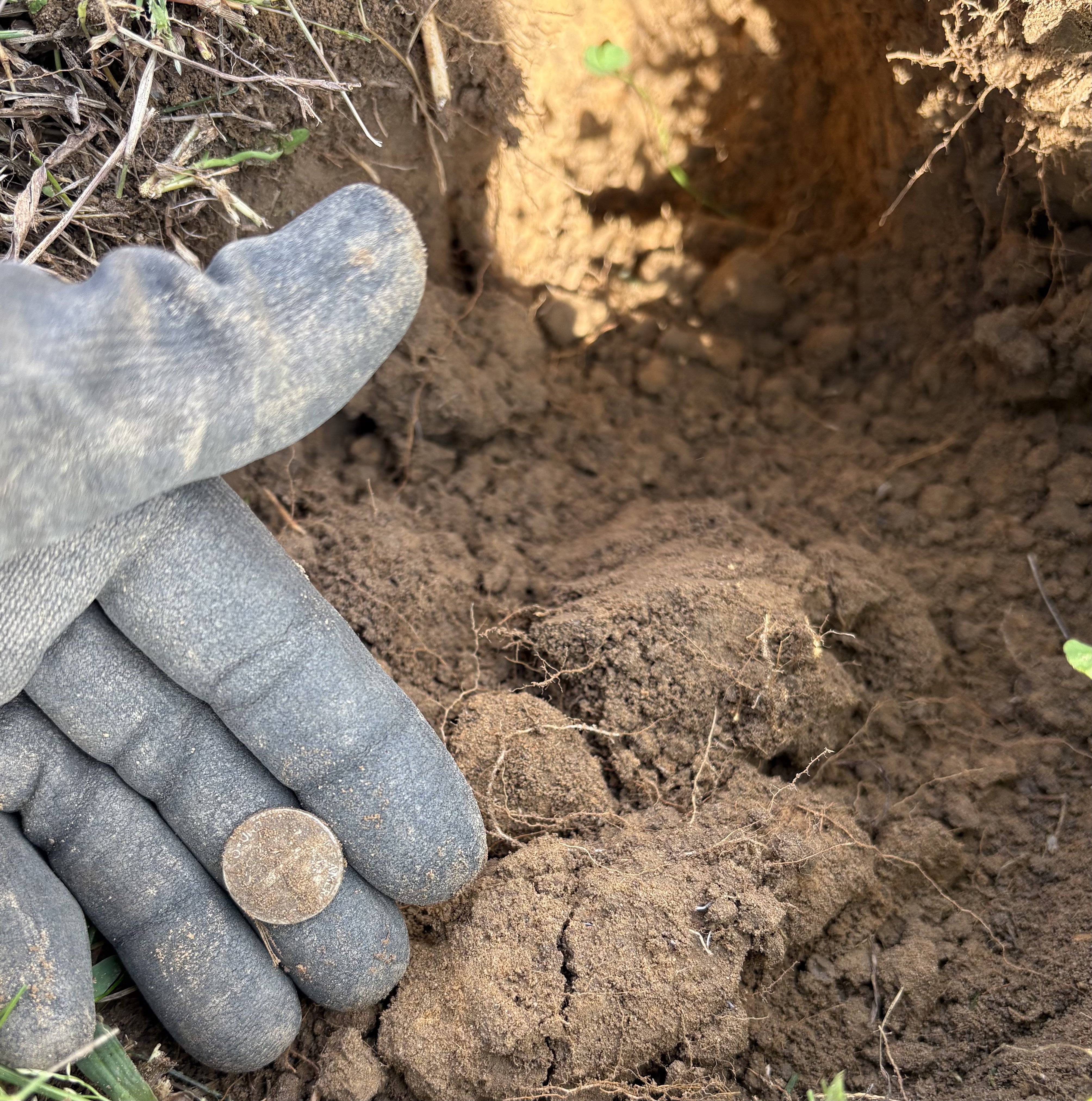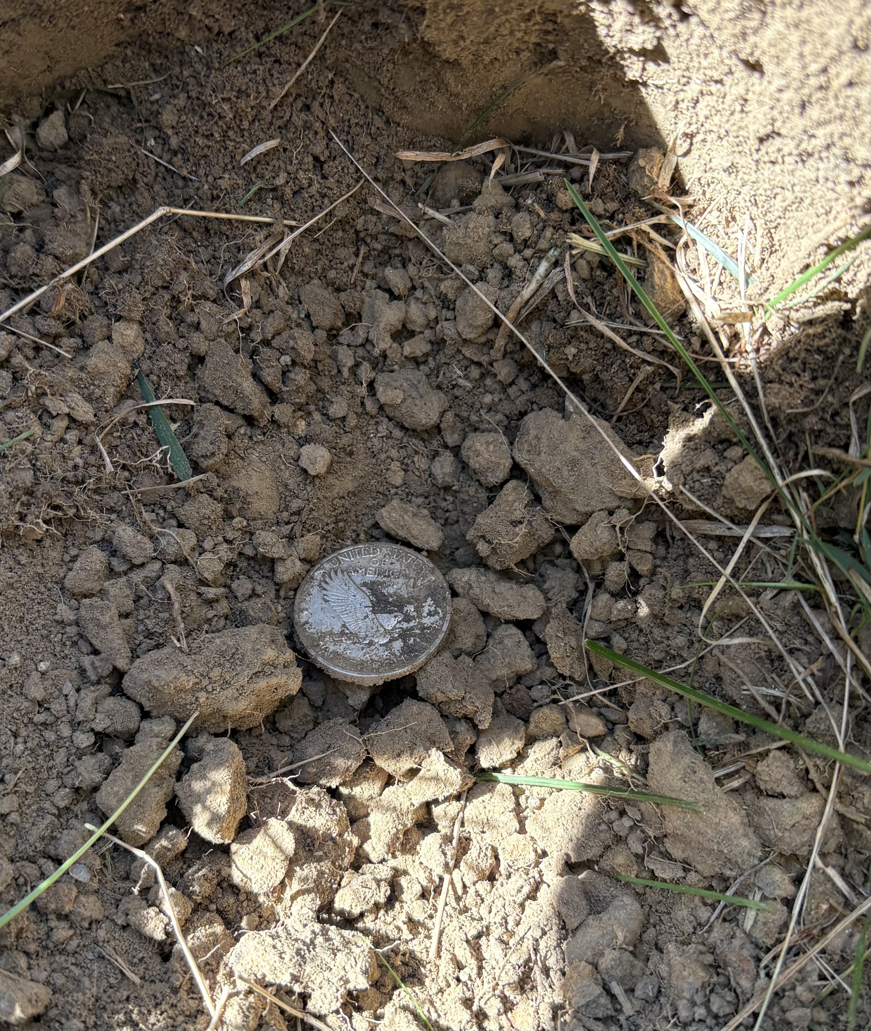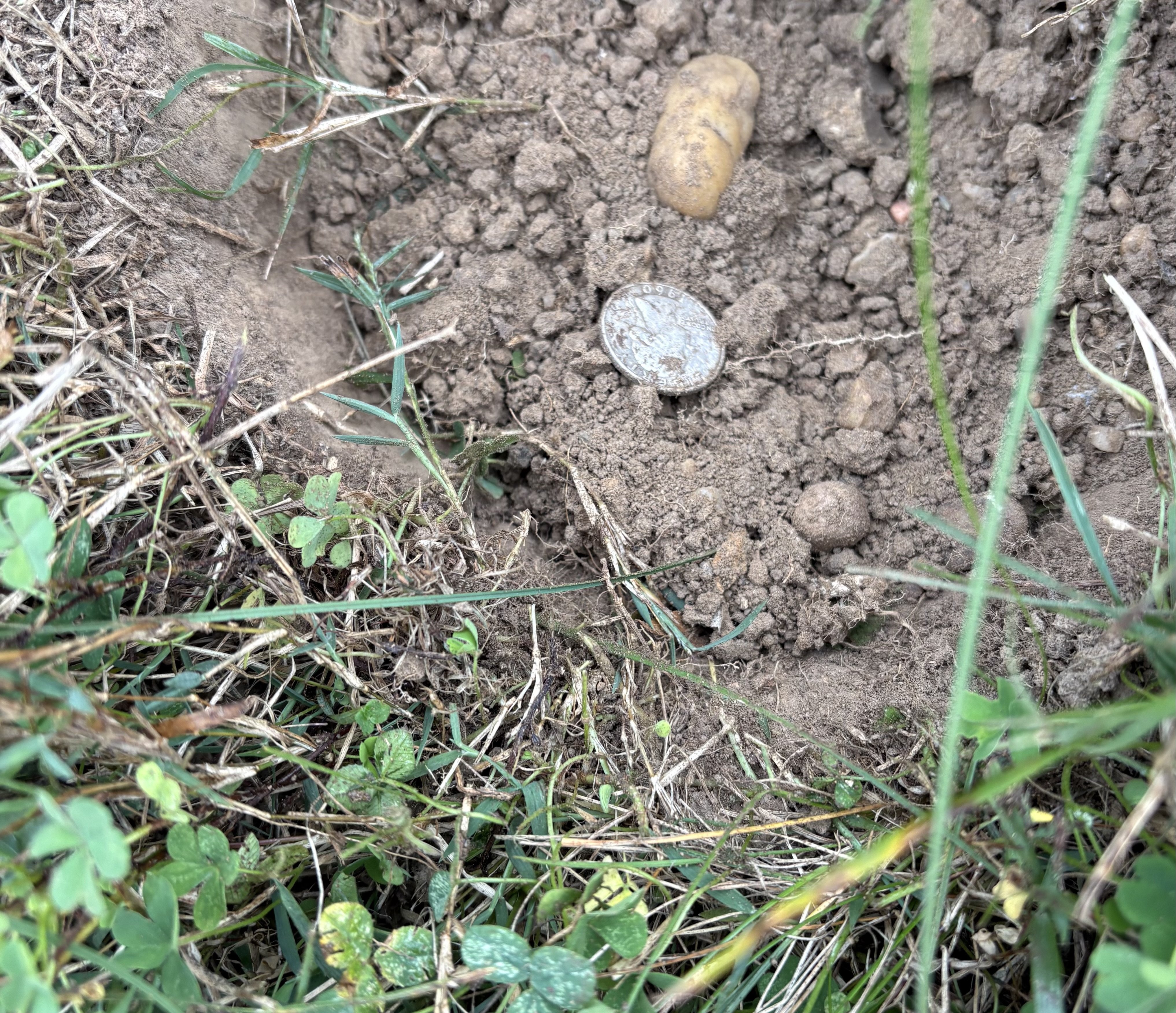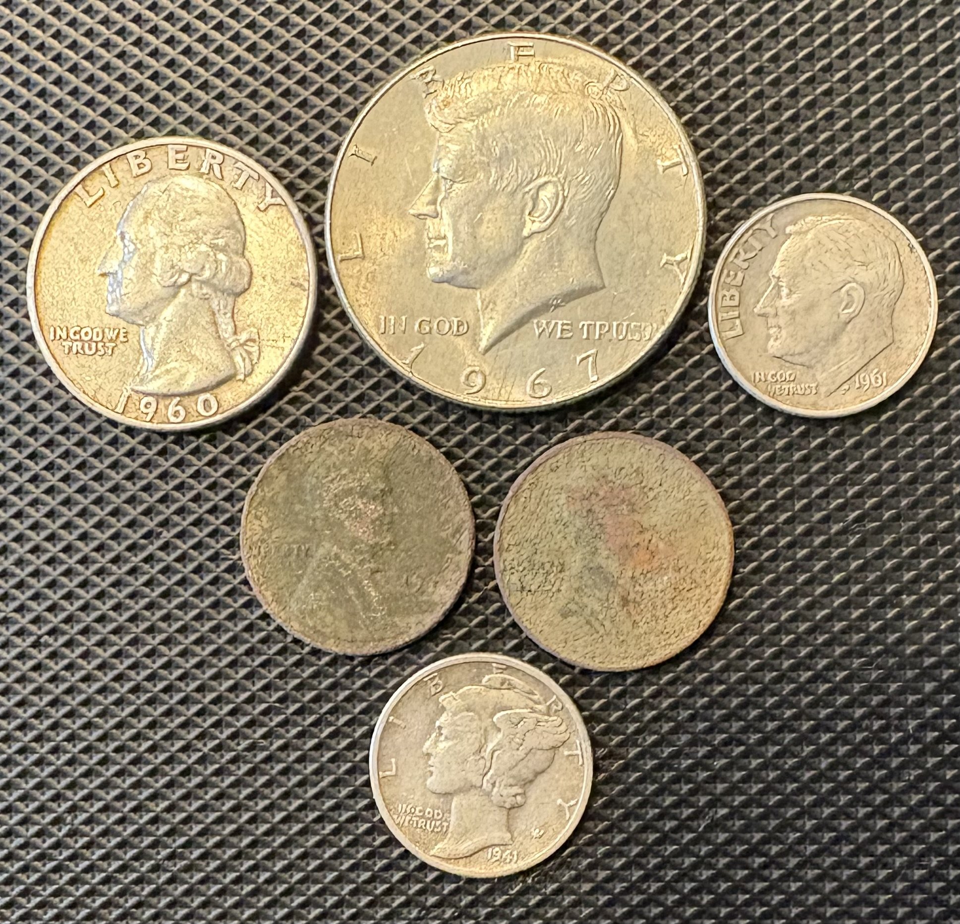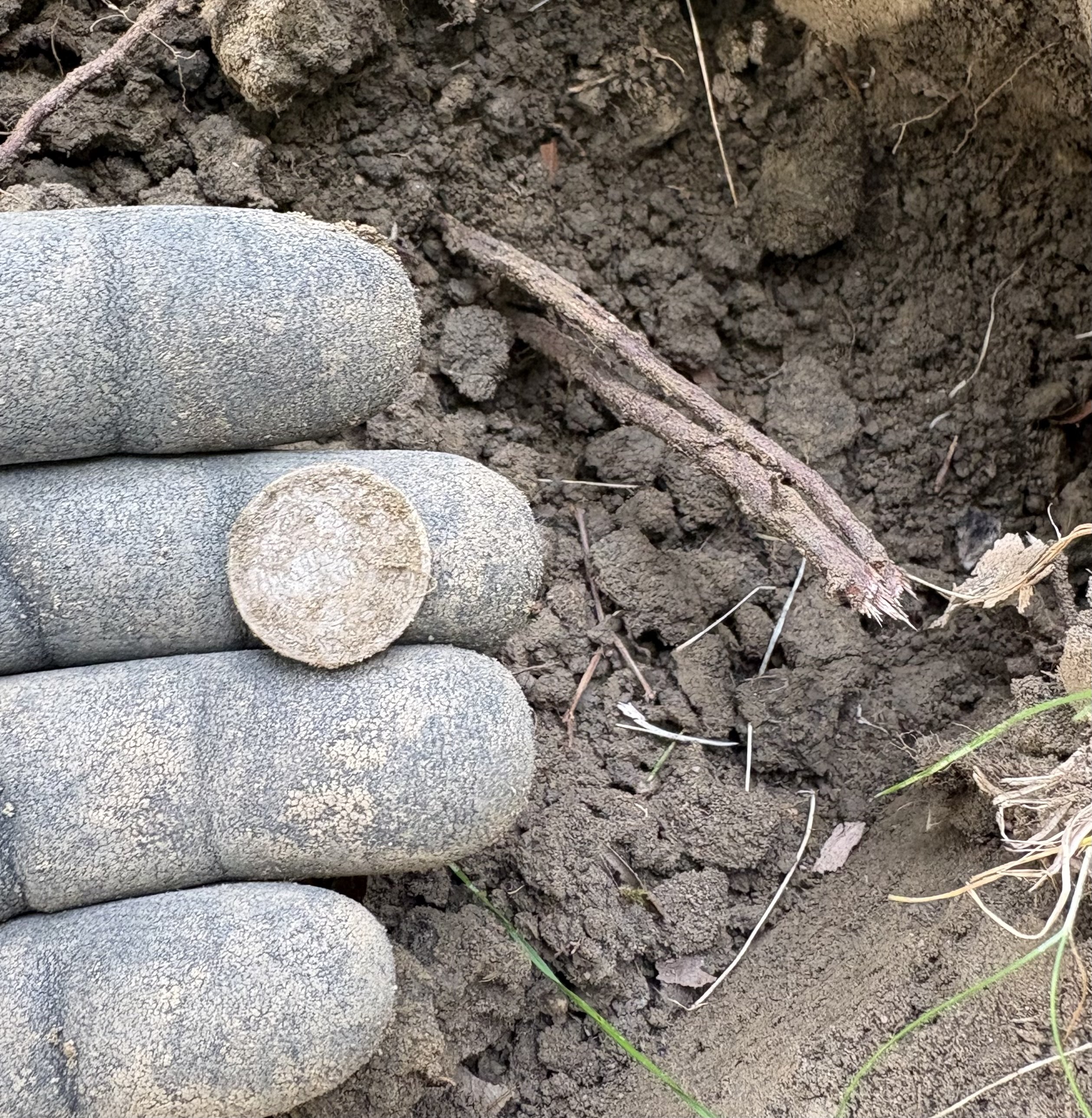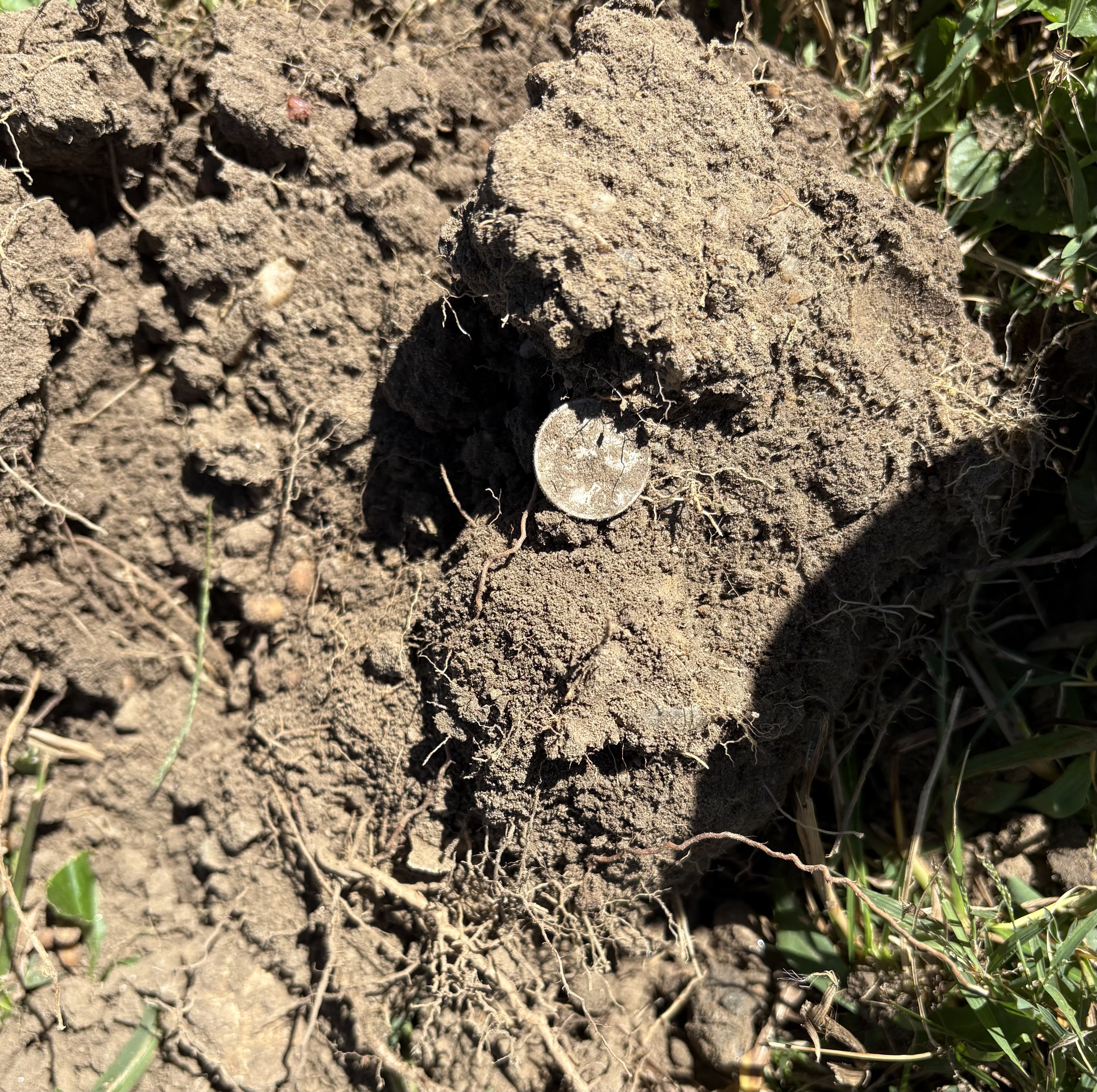 This 40% Kennedy was likely a more recent drop. When the Manticore picked it up, it was reading @ 3-4 inches deep when it was actually just embedded in the surface roots of the grass. I only realized it after I dug the plug and flipped it out, using the pinpointer to confirm it was much closer to the surface than I expected. I only had to pry it out from the surface roots to reveal it.