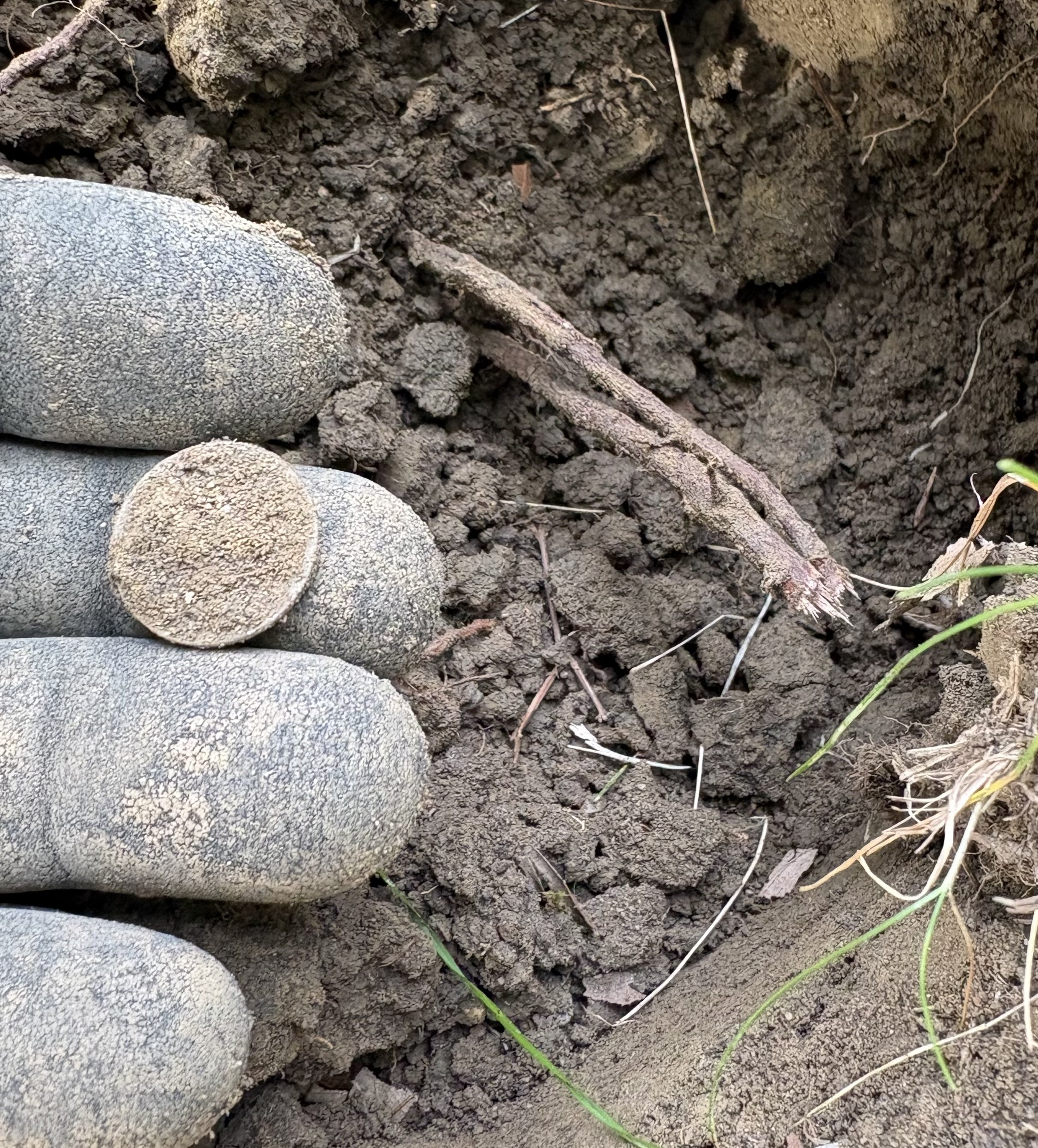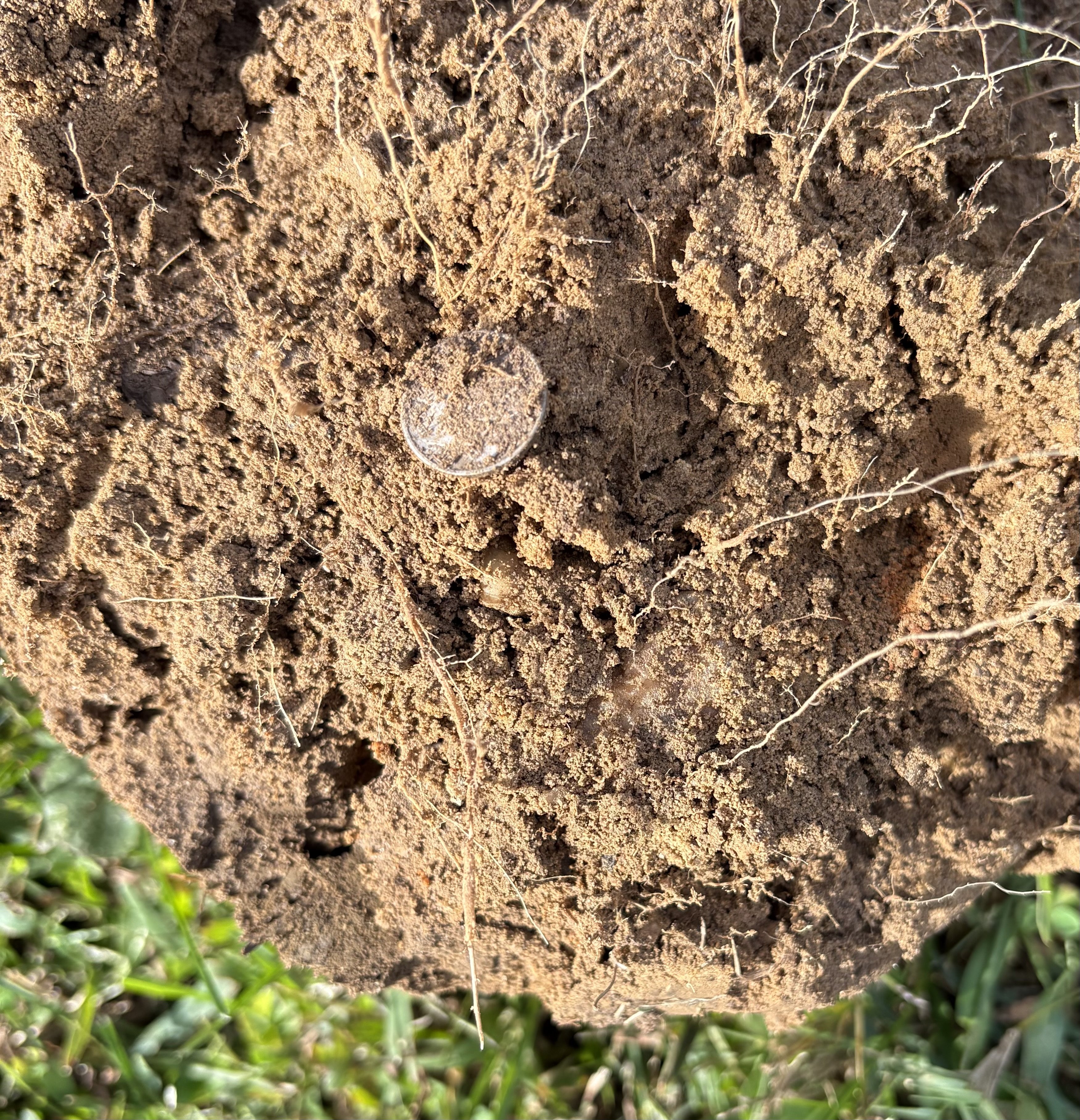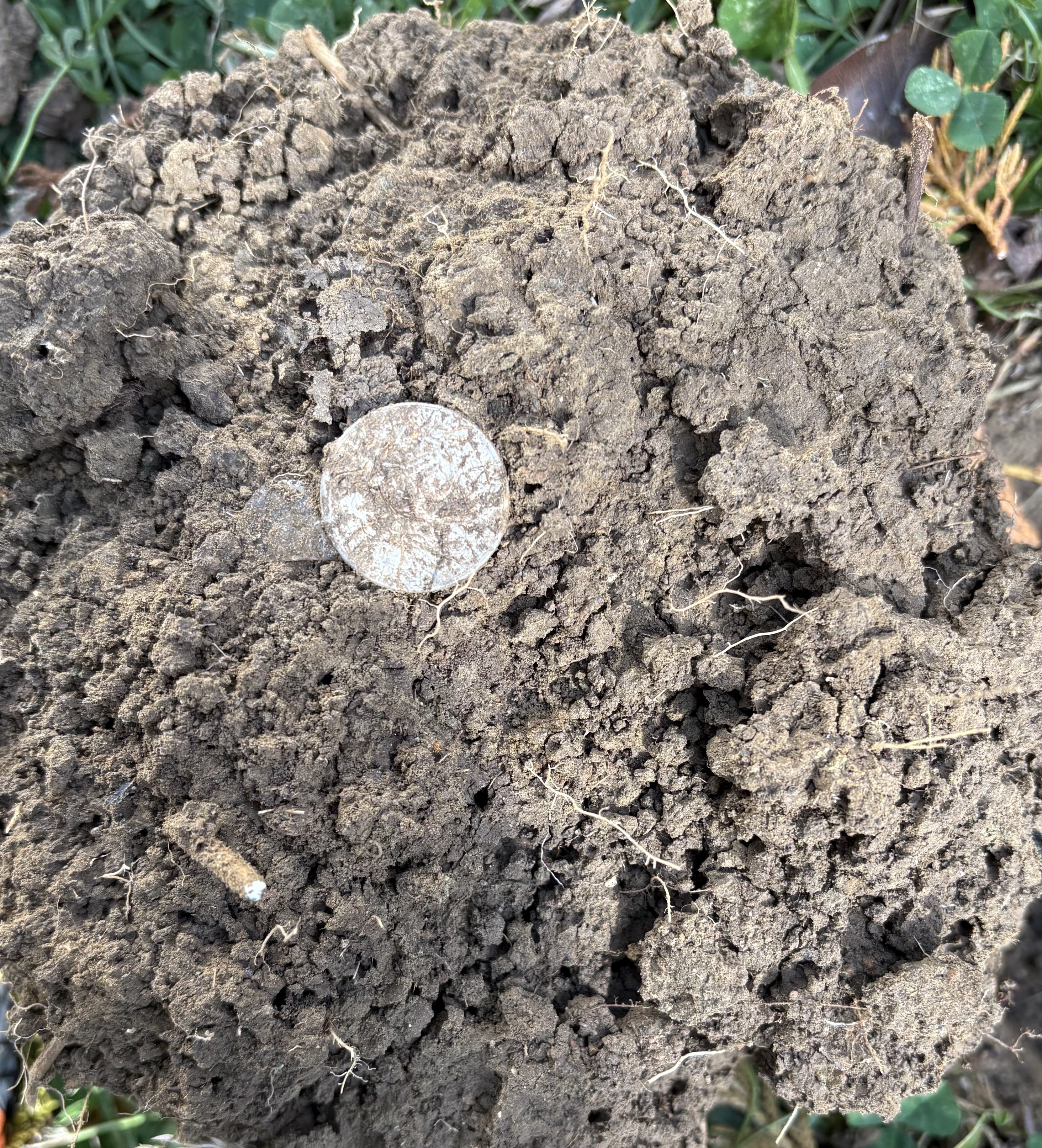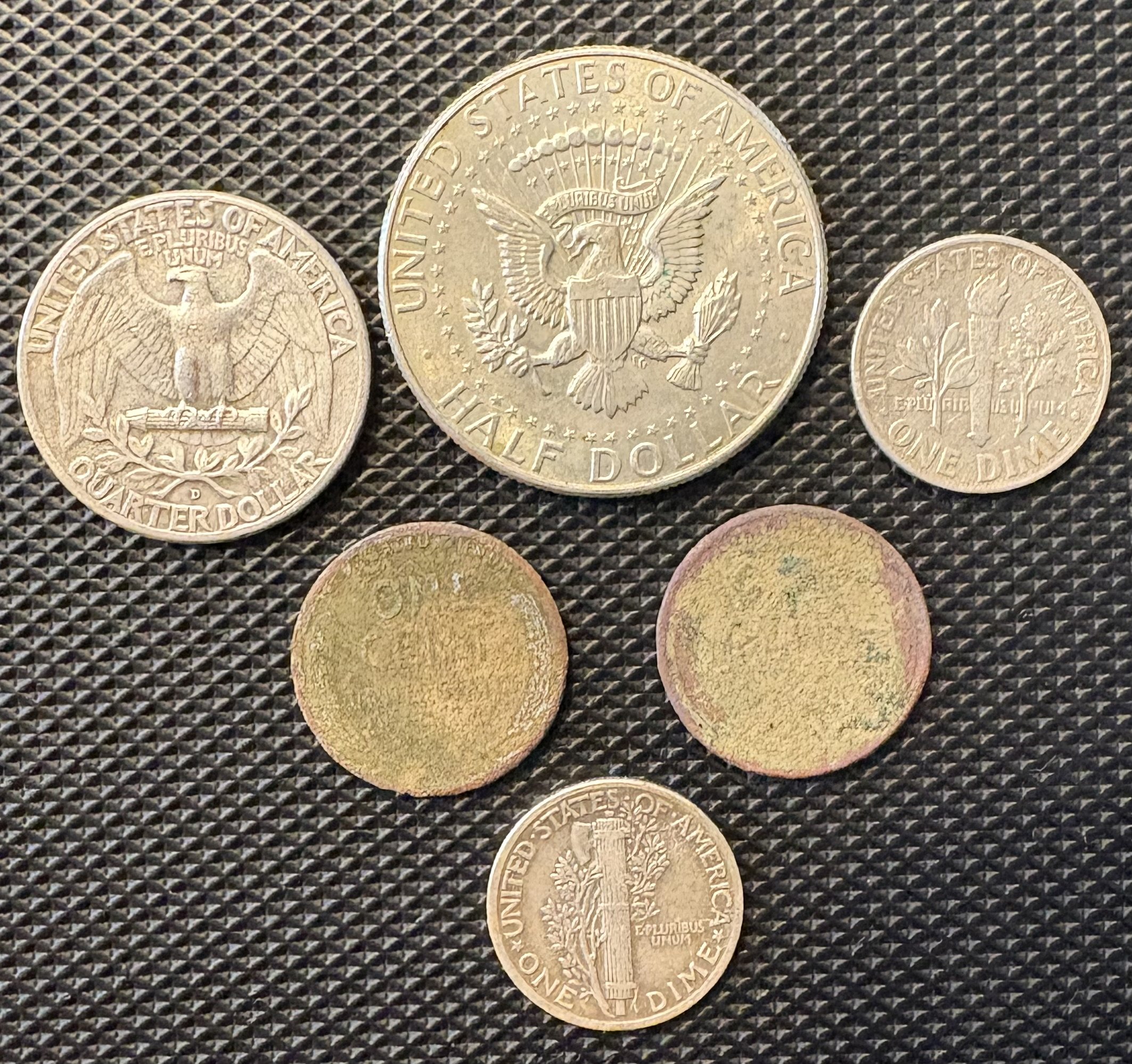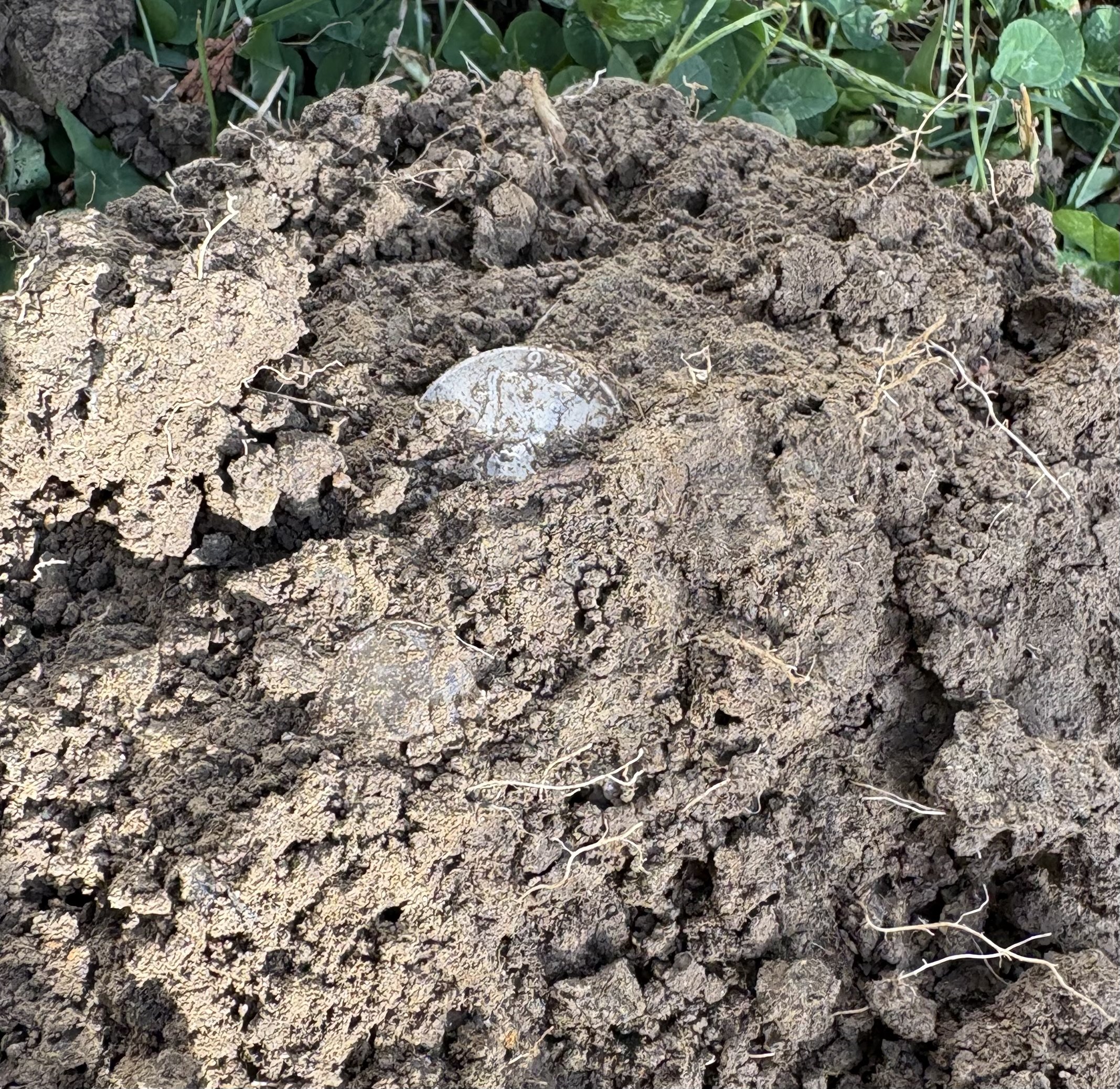 This 40% Kennedy was likely a more recent drop. When the Manticore picked it up, it was reading @ 3-4 inches deep when it was actually just embedded in the surface roots of the grass. I only realized it after I dug the plug and flipped it out, using the pinpointer to confirm it was much closer to the surface than I expected. I only had to pry it out from the surface roots to reveal it.