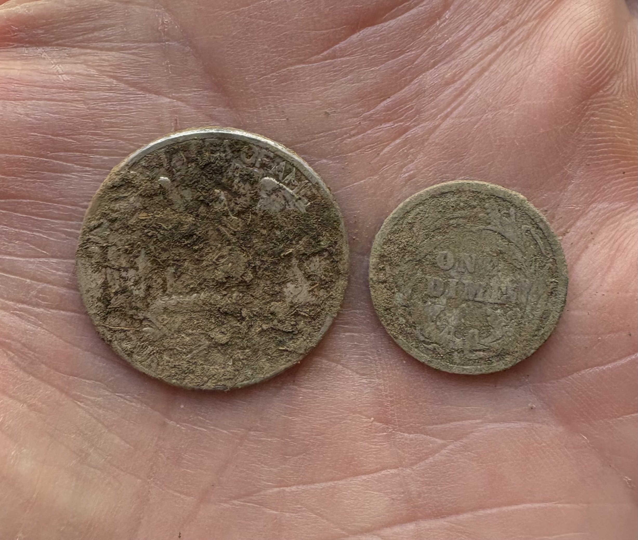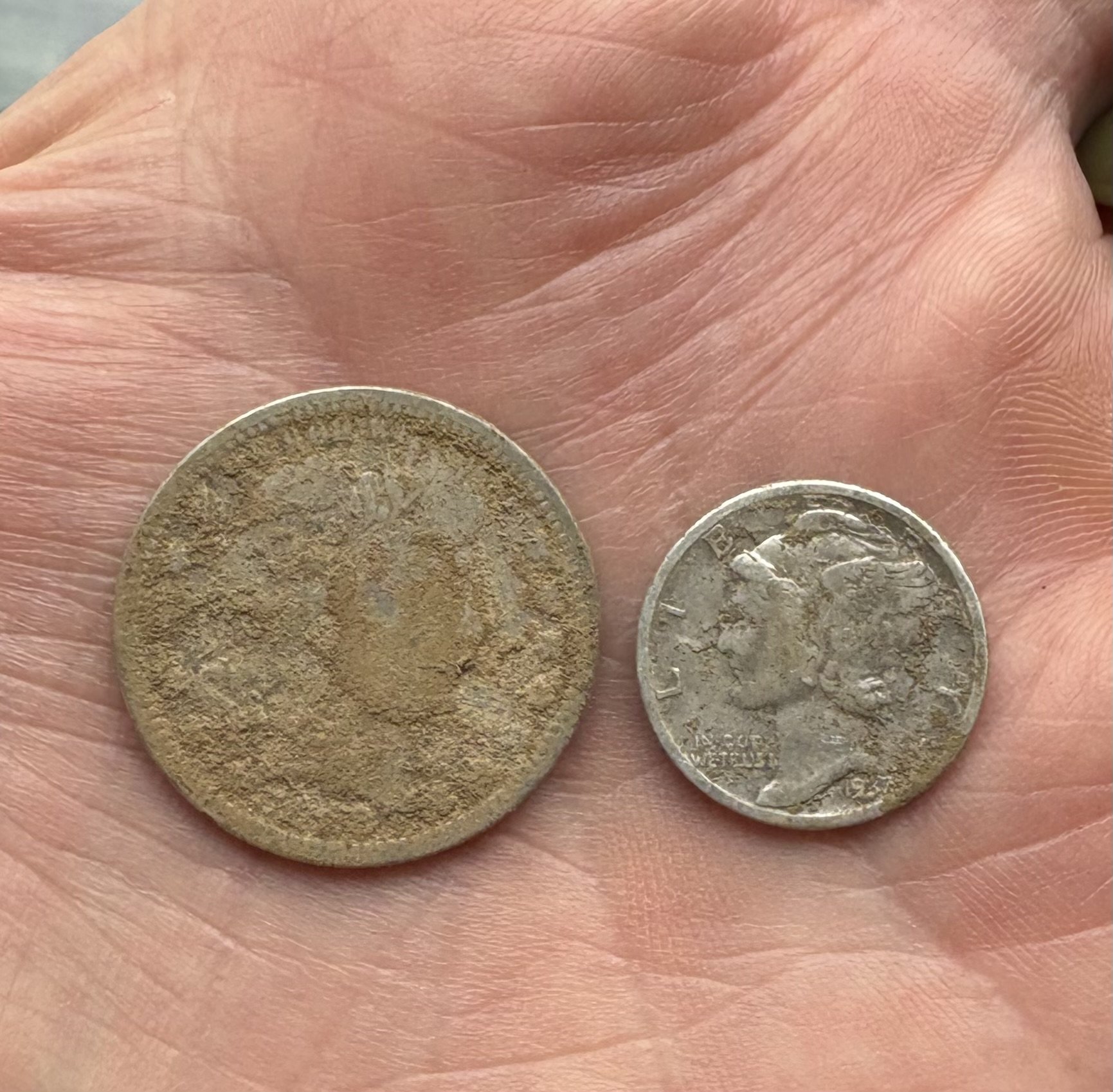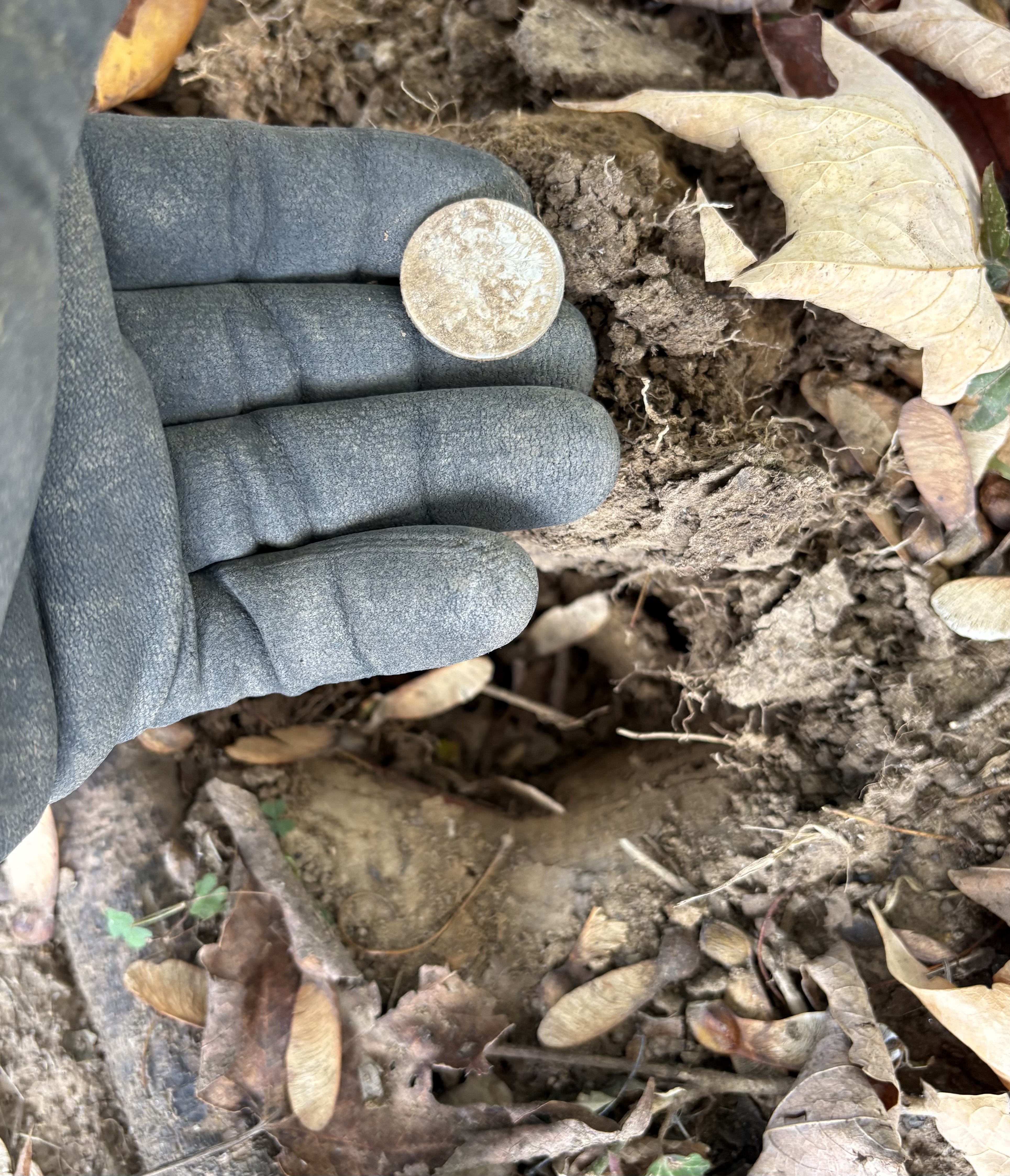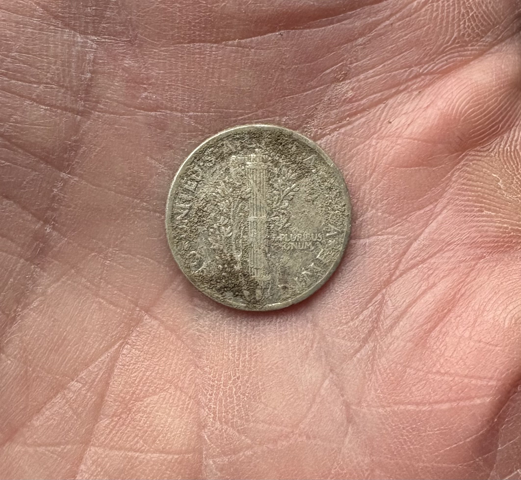 First silver I hit is a pretty significant find. When I pulled it out into the sun, I could just make out the date… found close the back corner of the house on flat ground.