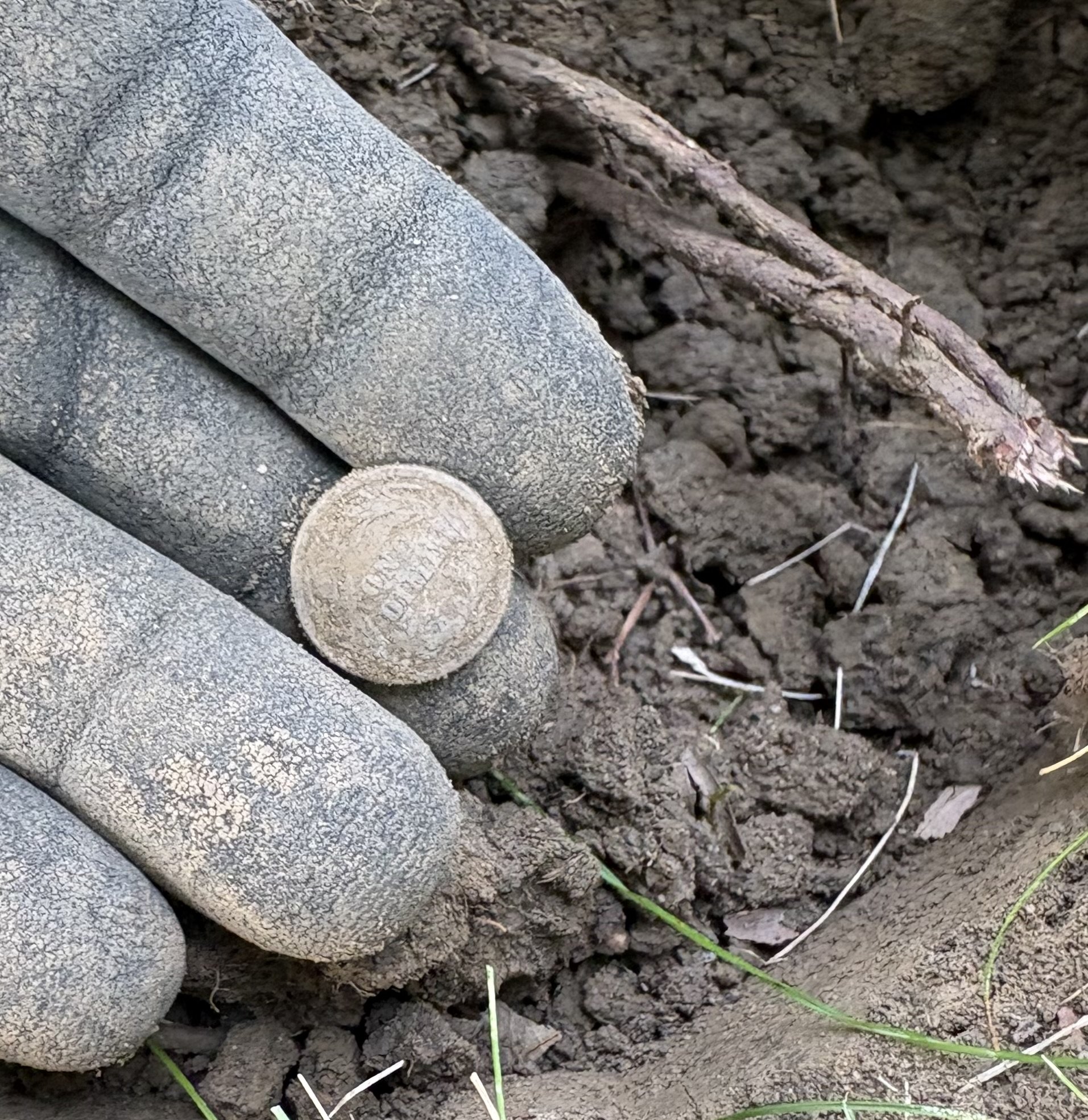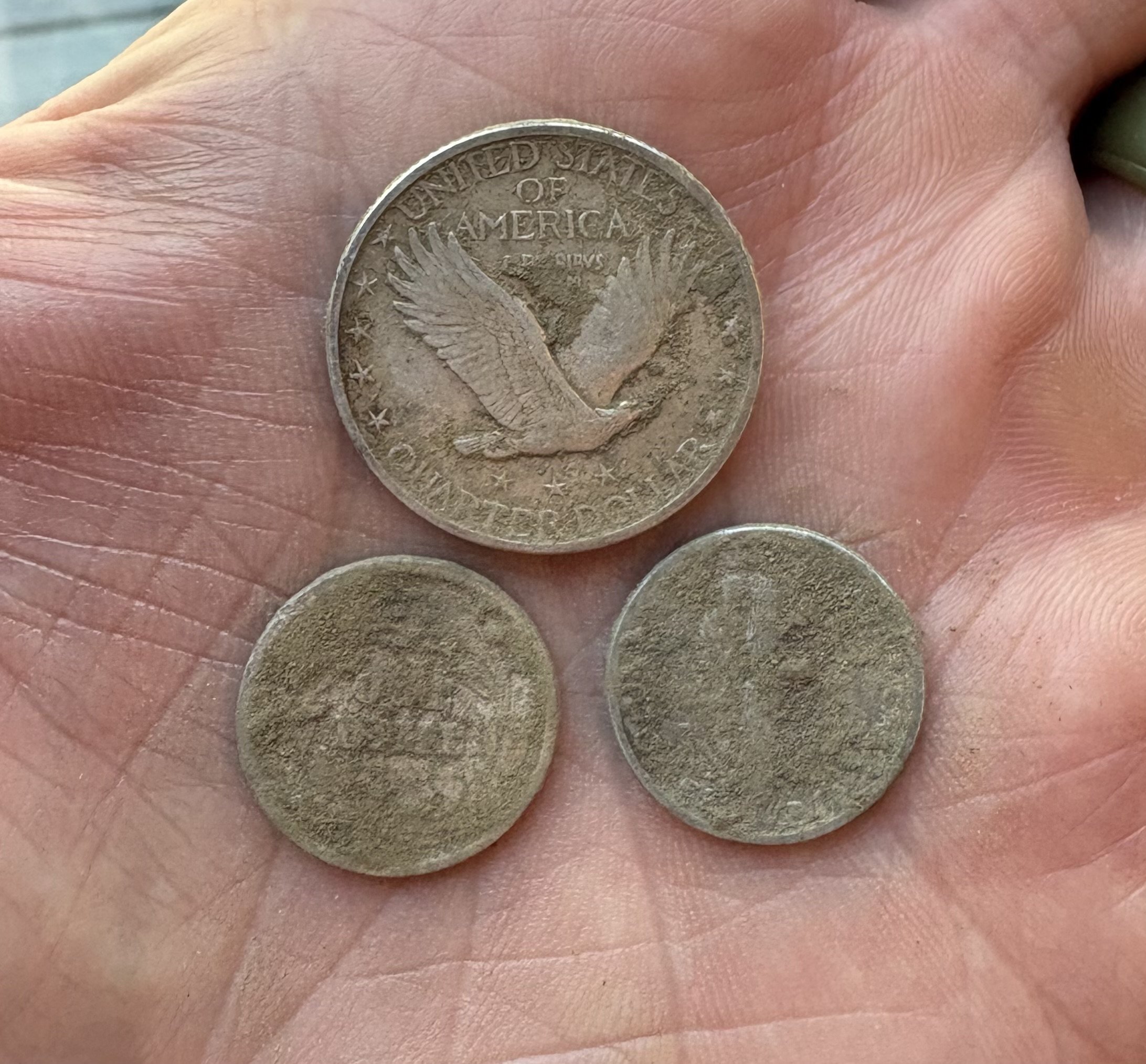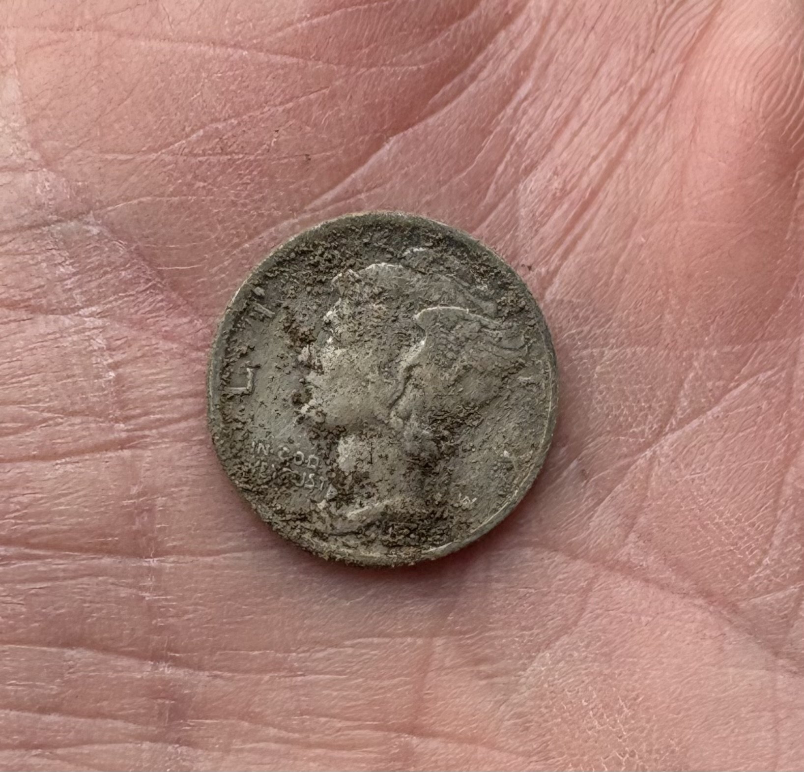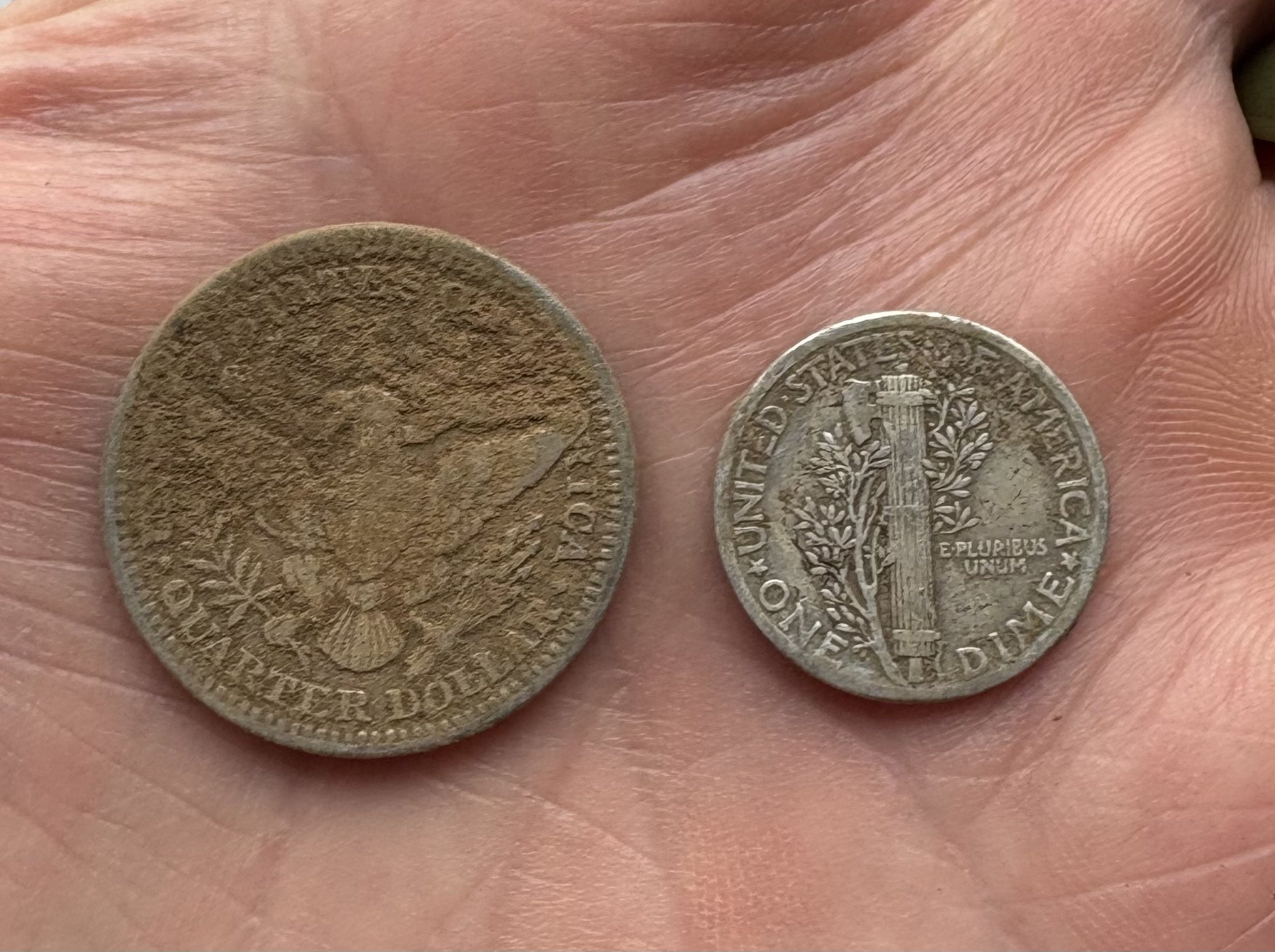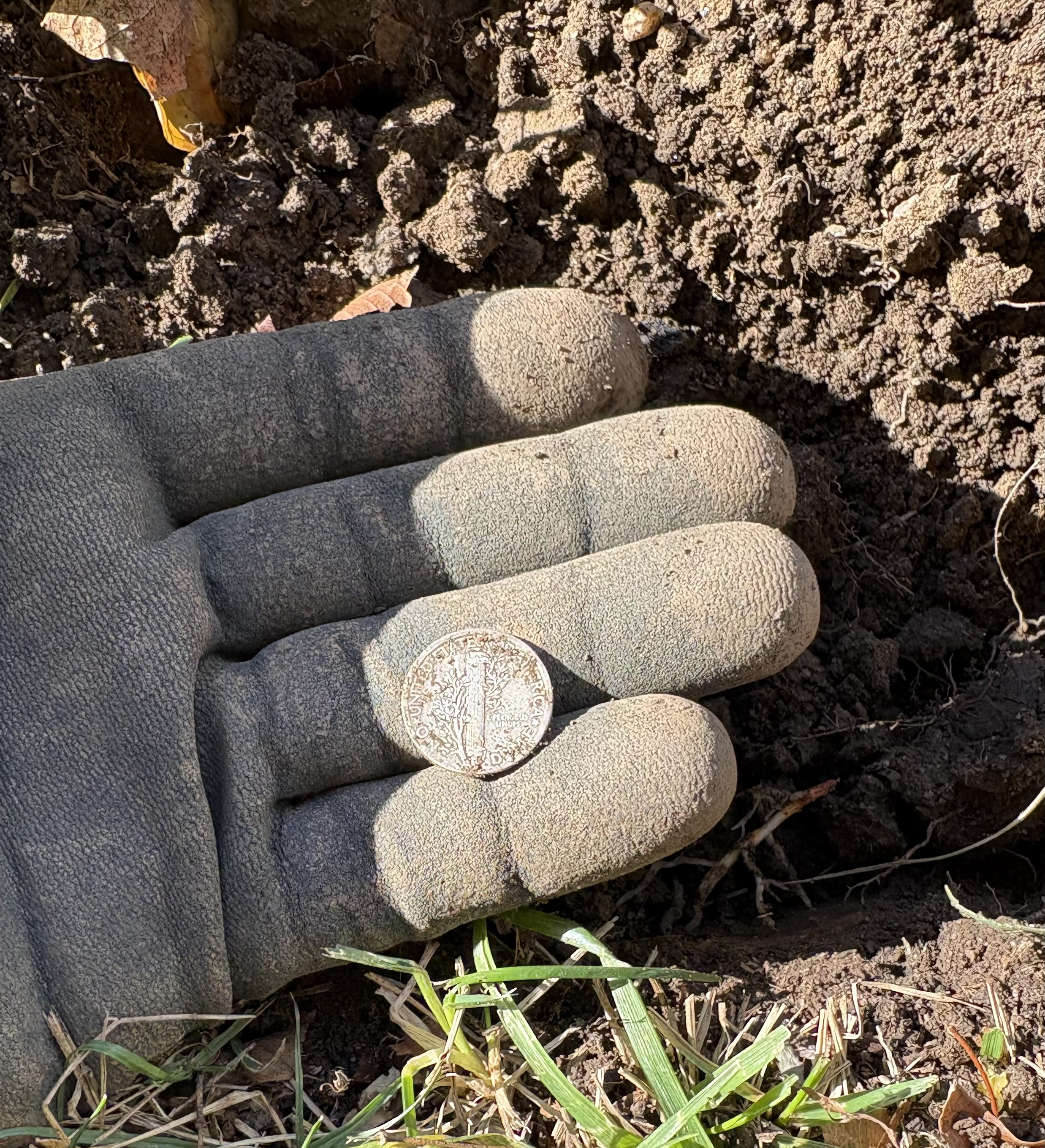 First silver I hit is a pretty significant find. When I pulled it out into the sun, I could just make out the date… found close the back corner of the house on flat ground.