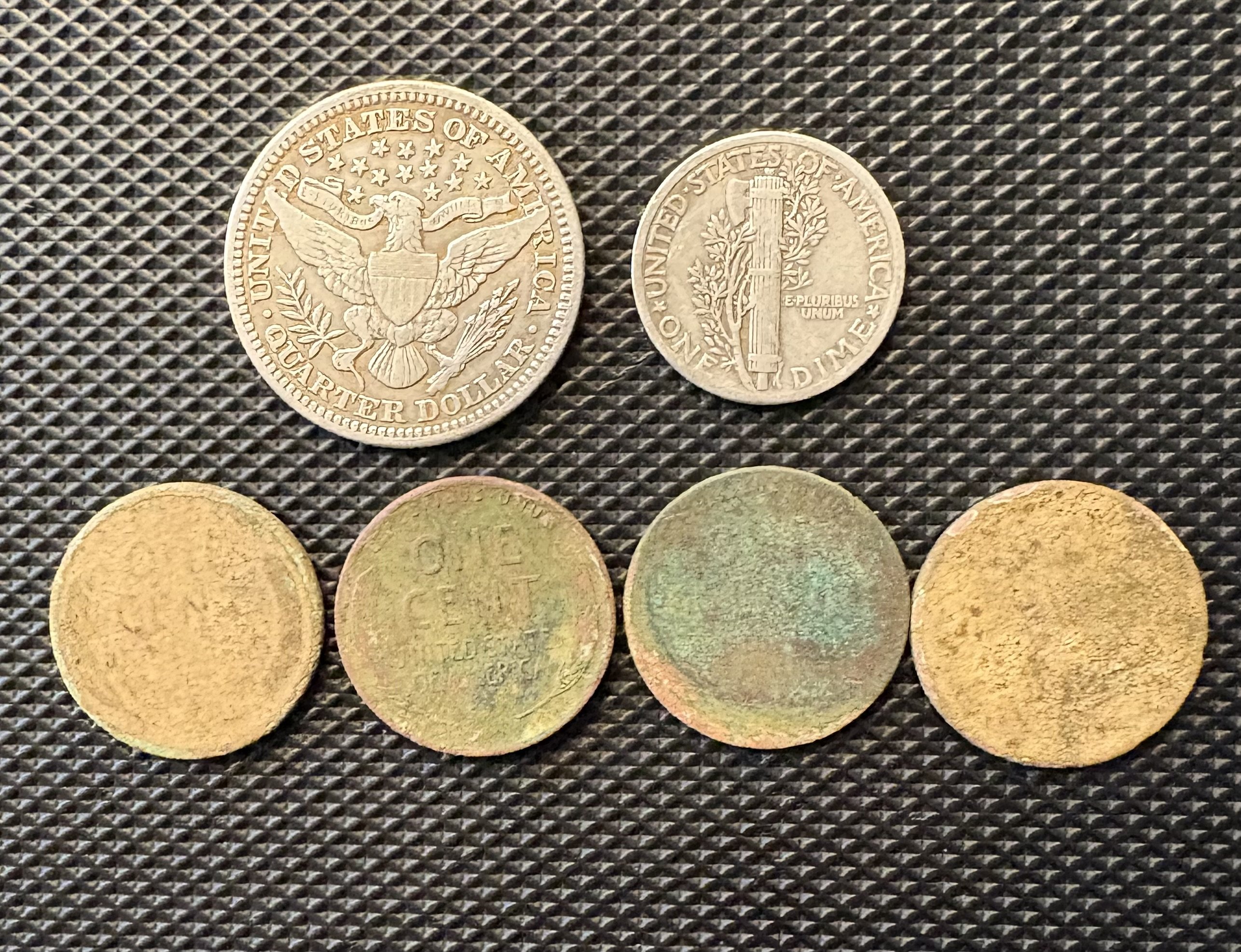 Keeping things going, I hit more copper clad, with a few wheaties to boot. Mixed in, close to the sidewalk in the grassy part and @ 6-7 inches deep…