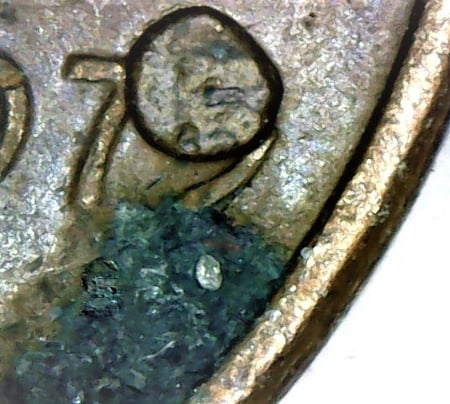 • Anybody else, with another idea? And just for the record, I am saying it once again these "Stones" are encrusted on the coin, they are flat with the coin surface! And there are no scratches or damage! Thanks all fellow collectos!