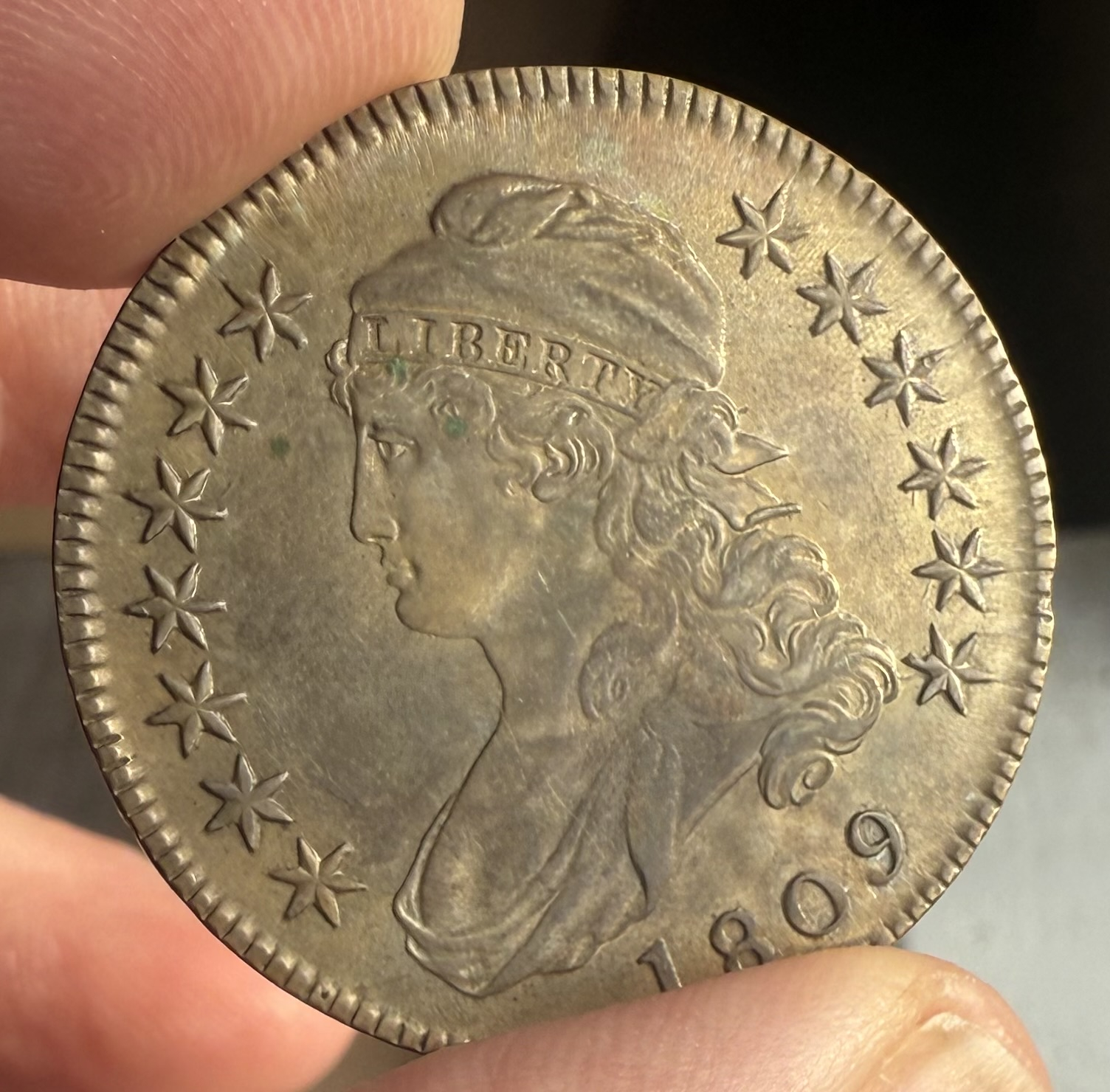 1809 for ya. Unusual toning but no signs of rub or blatant cleaning marks.