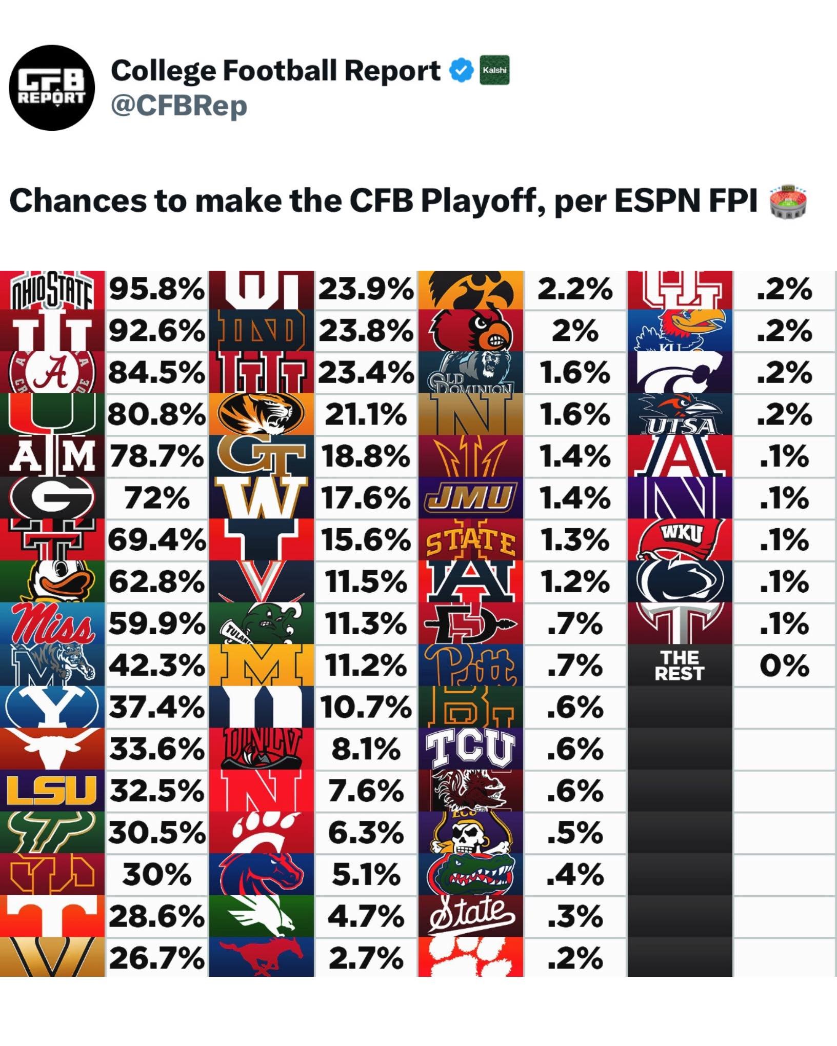 I also don't hold much faith in Texas Tech or Oregon but think both teams will win their games. It's funny, but the way this season has played out it is probable that some 2-loss teams will start to show up in the Top 10 and by the time the CFP makes their choice of the 12 playoff teams that it might even include a 3-loss team. I think that NIL and the transfer portal has achieved the NFL dream of parity in the NCAA.