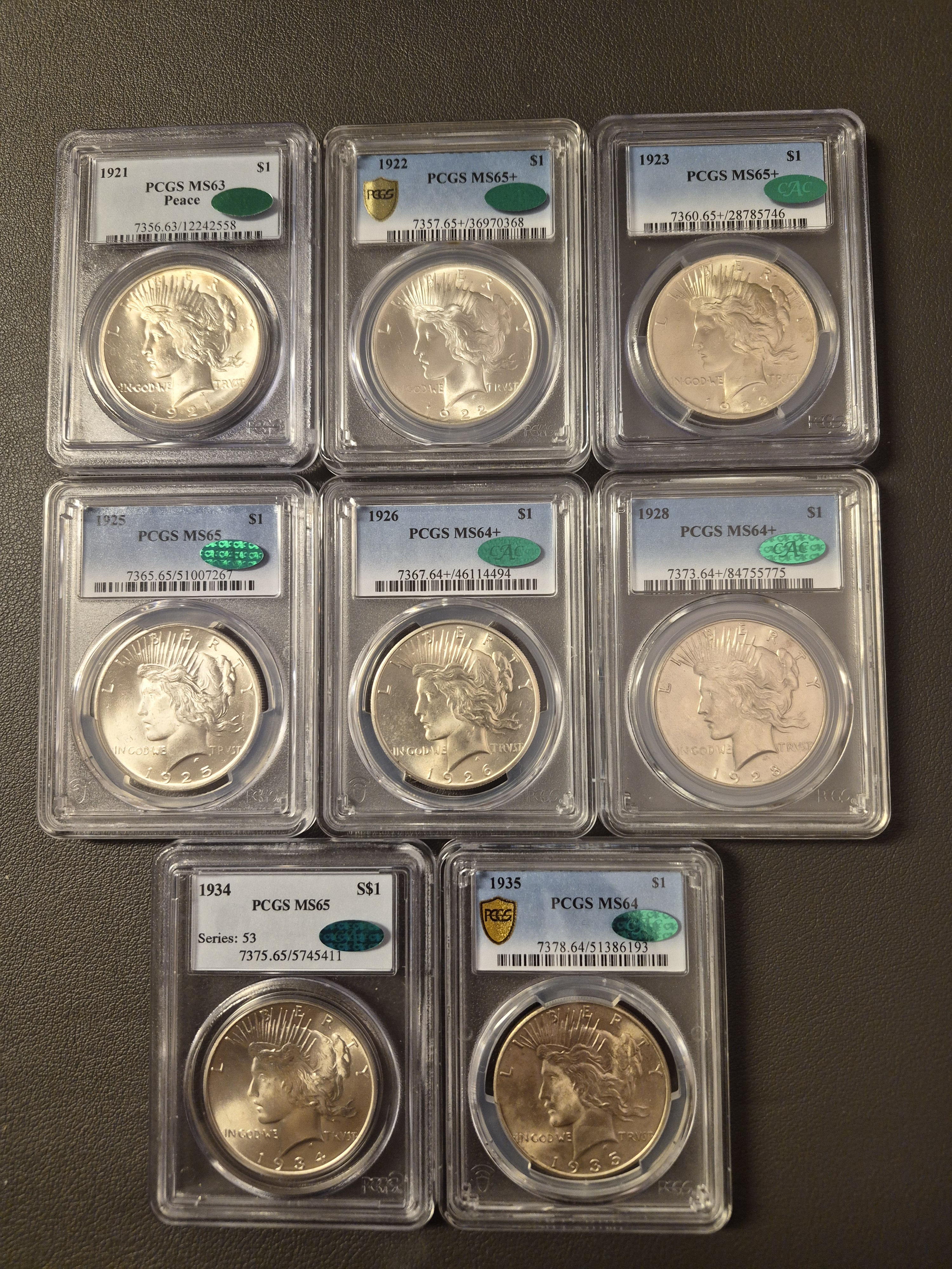 I decided to finish my philly date set of Peace Dollars. I prefer blast white coins and certification by PCGS and CAC. A little late to the party because it seems that the prices have soared in the last 5 years. Below is what I have so far.