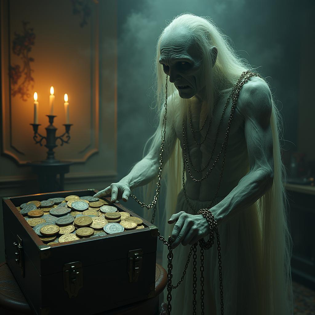 That reminds me of the scene from the Disney cartoon version of “A Christmas Carol” where Scrooge grabs the coins off of Marley’s eyes before they bury him. Oddly enough this is set in London, but the coins look like U.S. Liberty Seated half dollars.