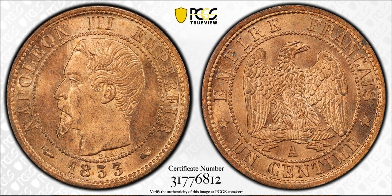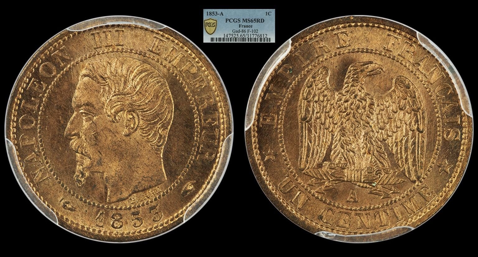 FSH: FRANCE ,1853-A ONE CENTIME PCGS MS65 RD