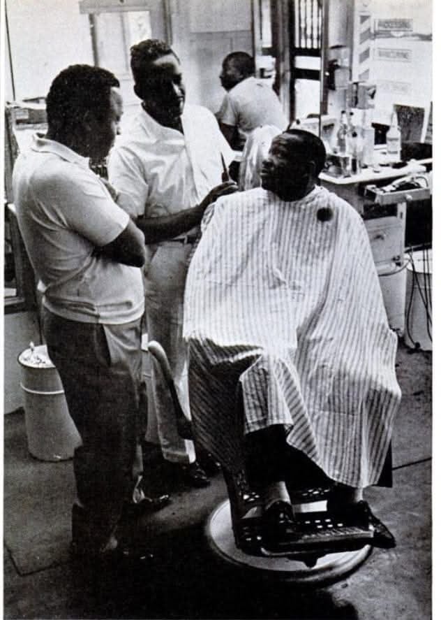 Eddie Perkins chewing the fat with former world champion Johnny "Honey Boy" Bratton (left), a former undisputed world Jr welterweight champion, Eddie prepares for haircut in the barber shop of Bob Weatherly. Spot was a hangout for Chicago fighters. A stranger to the public, Eddie got VIP treatment from friends.