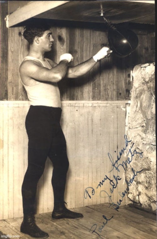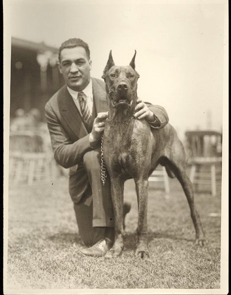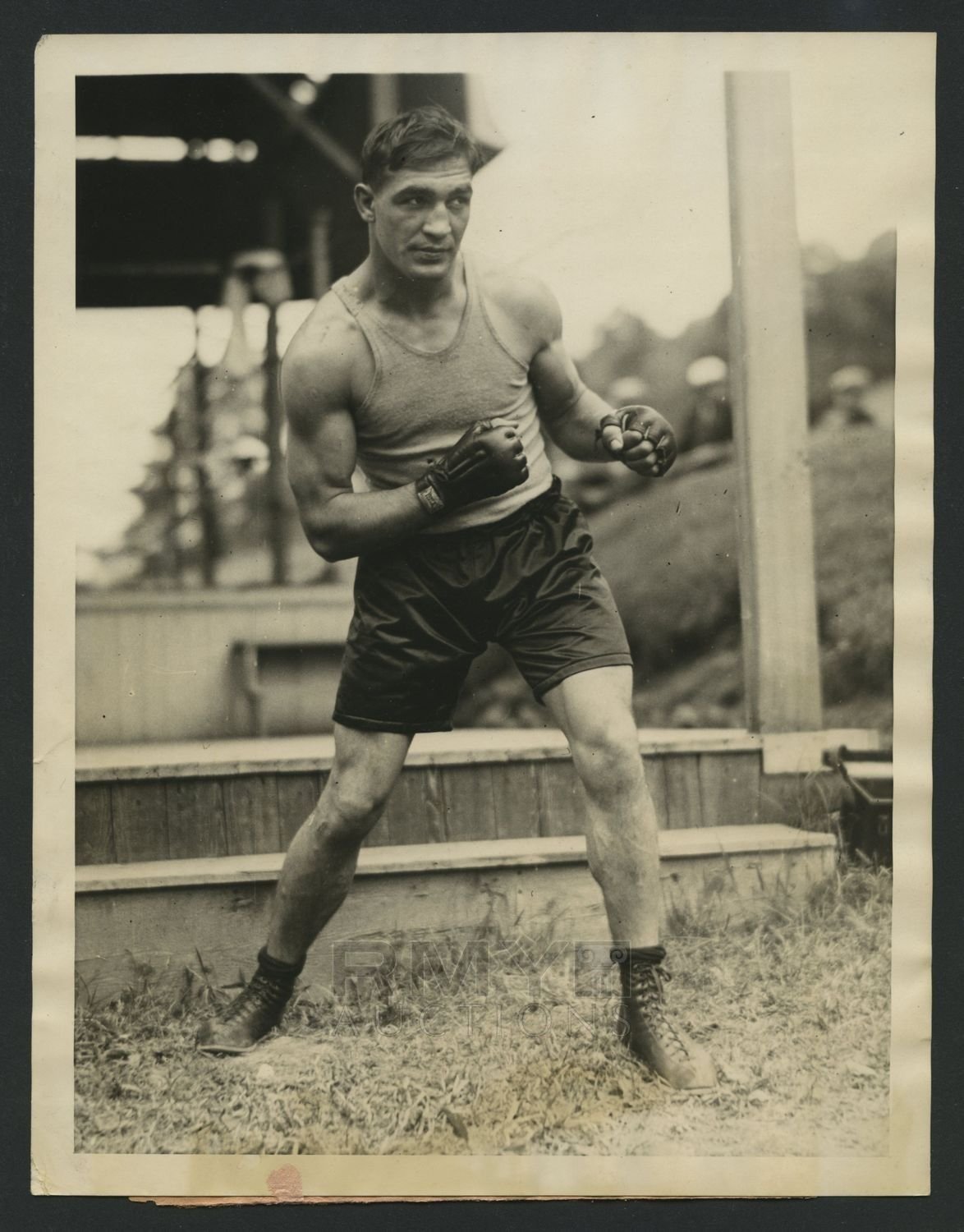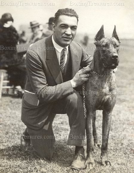One of my favorite fighters here, Paul Berlenbach, "The Astoria Assassin", 1920s all-time great light heavyweight with murderous punching power. He also possessed a numbing, paralyzing body punch that caused his opponents suddenly to crumple up as though they'd been shot. Paul Berlenbach, of French and German ancestry, was born in New York City on February 18, 1901. Berlenbach was both deaf and mute, having suffered from scarlet fever as a child; however, an electric shock, an accidental touch of a downed electrical wire at age 15 miraculously restored his hearing and speech. Berlenbach first showed promise as a wrestler, winning the 1922 and 1923 AAU championships, but switched to professional boxing in 1923. He has one heck of a resume, reigned for three years as light is champ, beating greats Jimmy Slattery, Mike McTigue, Battling Siki and Jack Delaney. He turned pro in 1923 and early in his career was matched and defeated by Hall of Famer Jack Delaney. Undeterred, "The Astoria Assassin" regrouped to score several knockouts, including a 10th round TKO over the great Battling Siki to set up a light heavyweight title shot against champion Mike McTigue. Renowned for his punching power, Berlenbach outboxed McTigue to win a 15-round decision and the title. He successfully defended the title three times (TKO 11 Jimmy Slattery, W15 Jack Delaney and W15 Young Stribling) before losing it to his nemesis Delaney in 1926. Berlenbach would meet and lose to Delaney once more before retiring in 1933. These are some really cool photos of Paul Berlenbach with his Great Dane "Shorty".